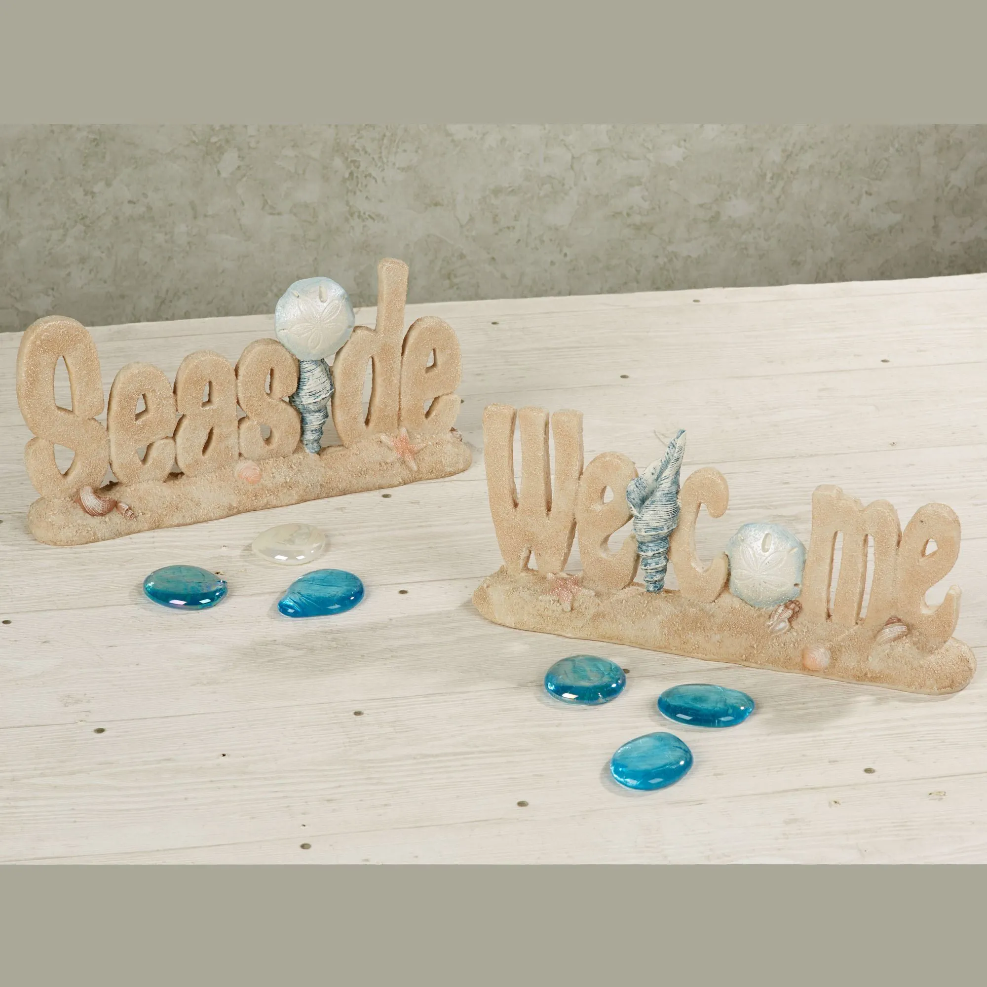 What better way to add an inviting atmosphere to your beach front theme than with a warm Seaside Welcome? The resin tabletop accents in this set have a textured sand appearance and a cream finish. Seashell designs take the place of some letters. Each tabletop accent measures 11.5"Wx2"Dx5.5"H.