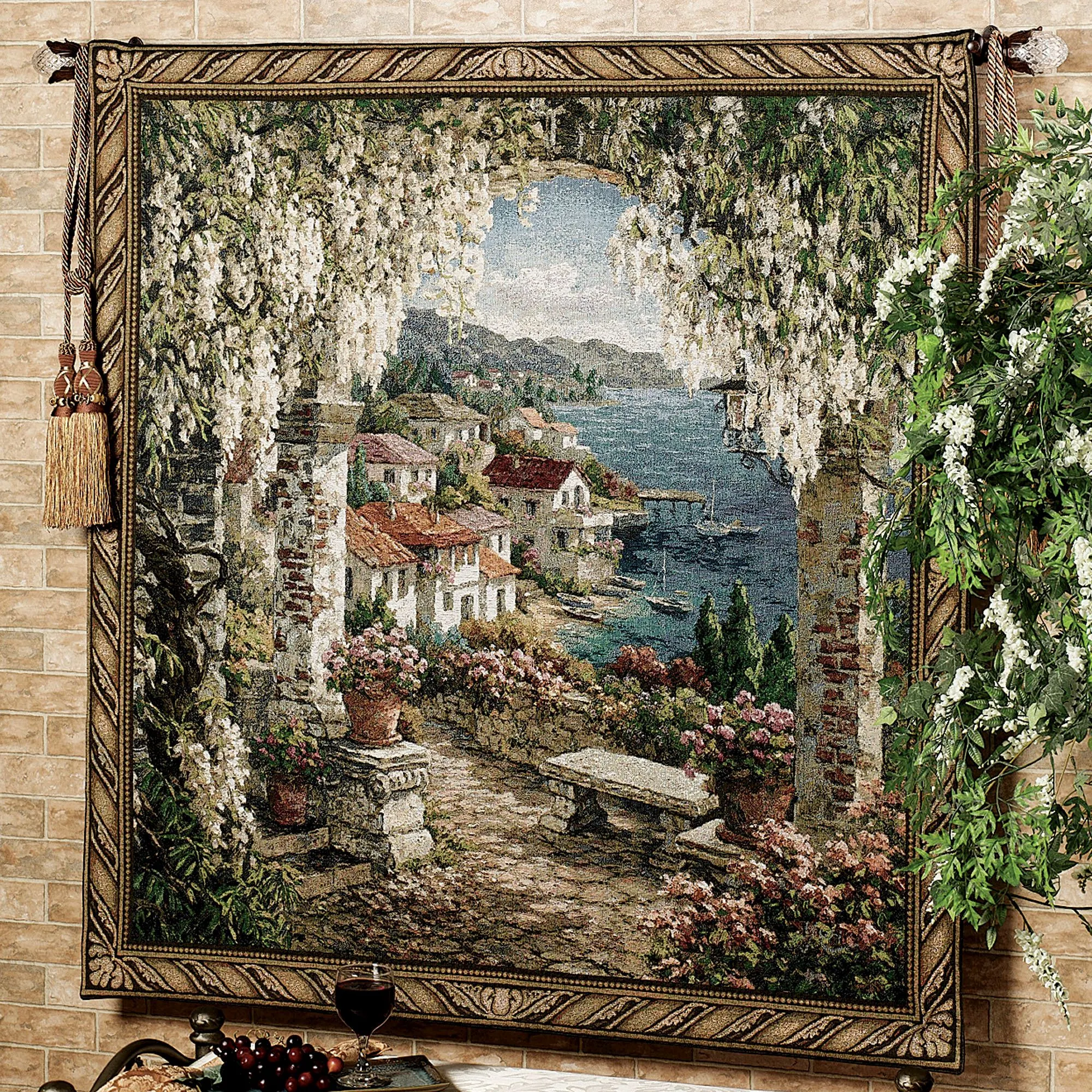 A wisteria-laden archway and stone-covered path lead down to the shore in the Seaview Hideaway Wall Tapestry. Earthy tones of burgundy, rose, and coral are highlighted by rich green foliage and the cool, undulating blues of sea, sky, and distant horizons. Jacquard-woven cotton tapestry can hang flush on the wall with the included brass tacks or use the 3" rod pocket with your rod for a traditional look. 53" sq. Dry clean.