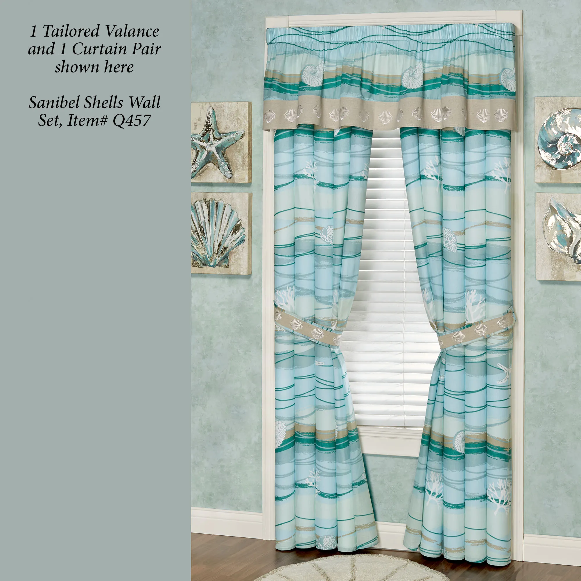 The Seaview II Window Treatment floods your decor with coastal beauty. Cotton window treatment features a printed wave design in light blue, pale blue, aqua, lapis, and tawny with printed coral, starfish, and shells. Window treatment has 2.5" rod pockets. Specify Tailored Valance or Curtain Pair. Tailored Valance has waves pieced with a textured sand, cotton/polyester/linen blend bottom embroidered with shells. Lined Curtain Pair has waves and tailored edges. Tiebacks are included. Machine washable. Imported. The curtain pair width is the total width of two panels together.