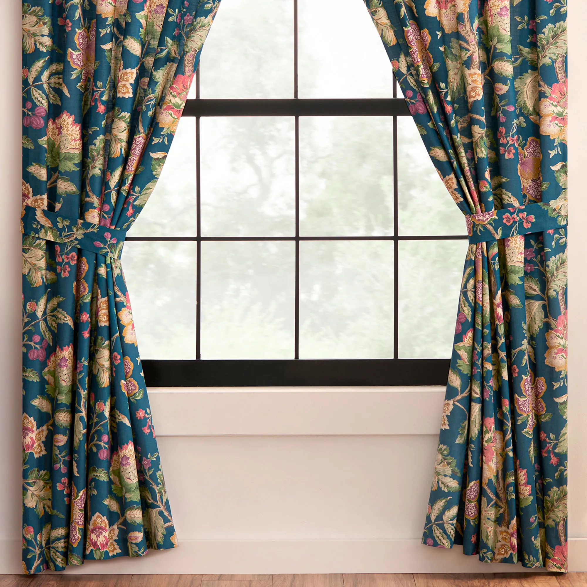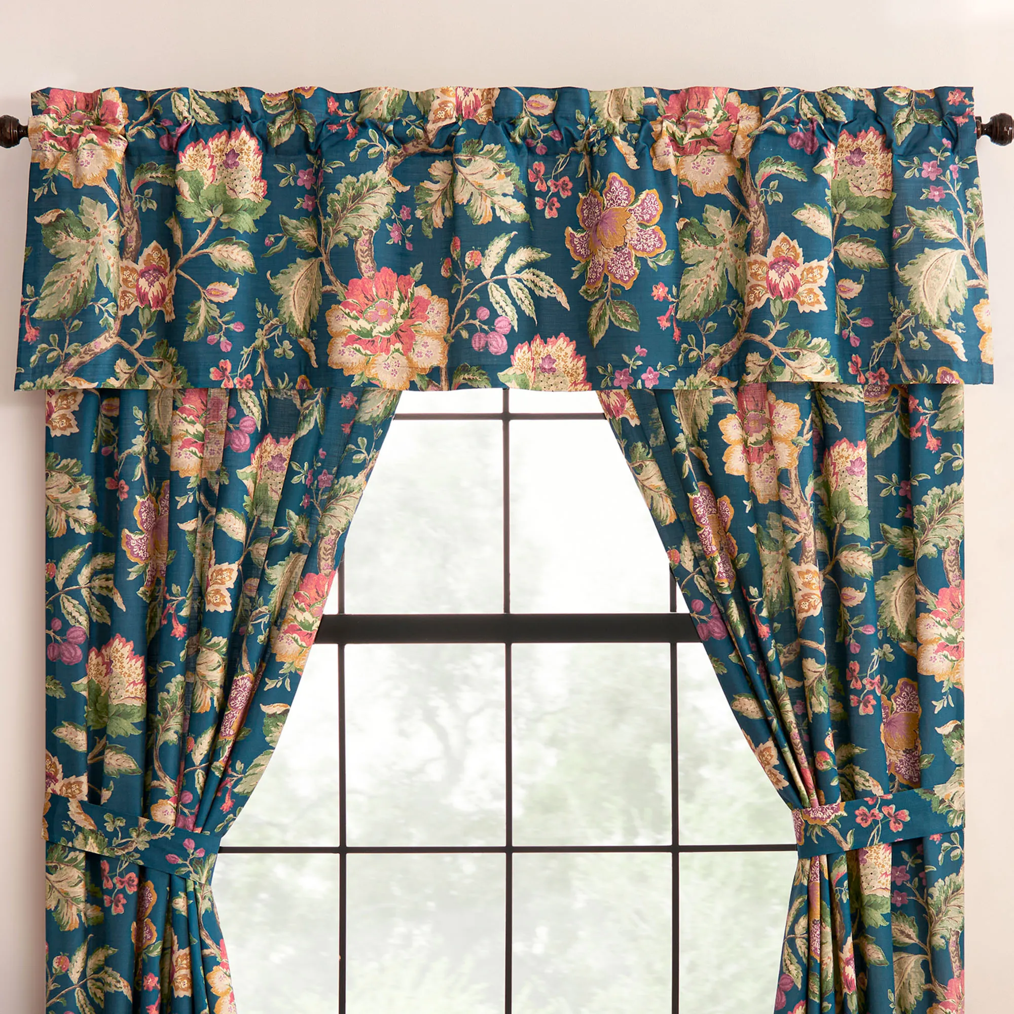 Tailored Window Treatments are lined, feature the Jacobean floral print, and have 3" rod pockets. Wide Curtain Pair includes tiebacks. Valance is also available.