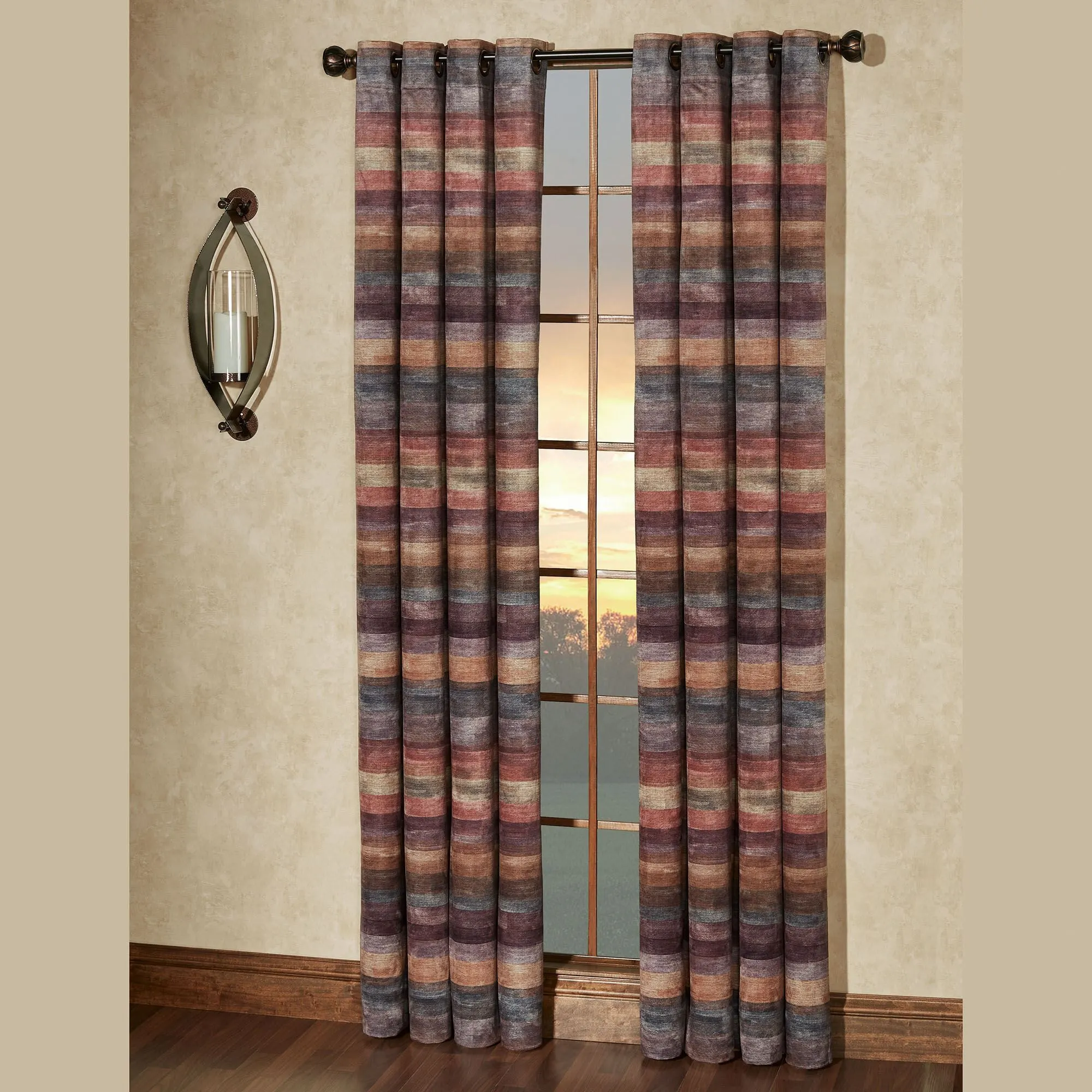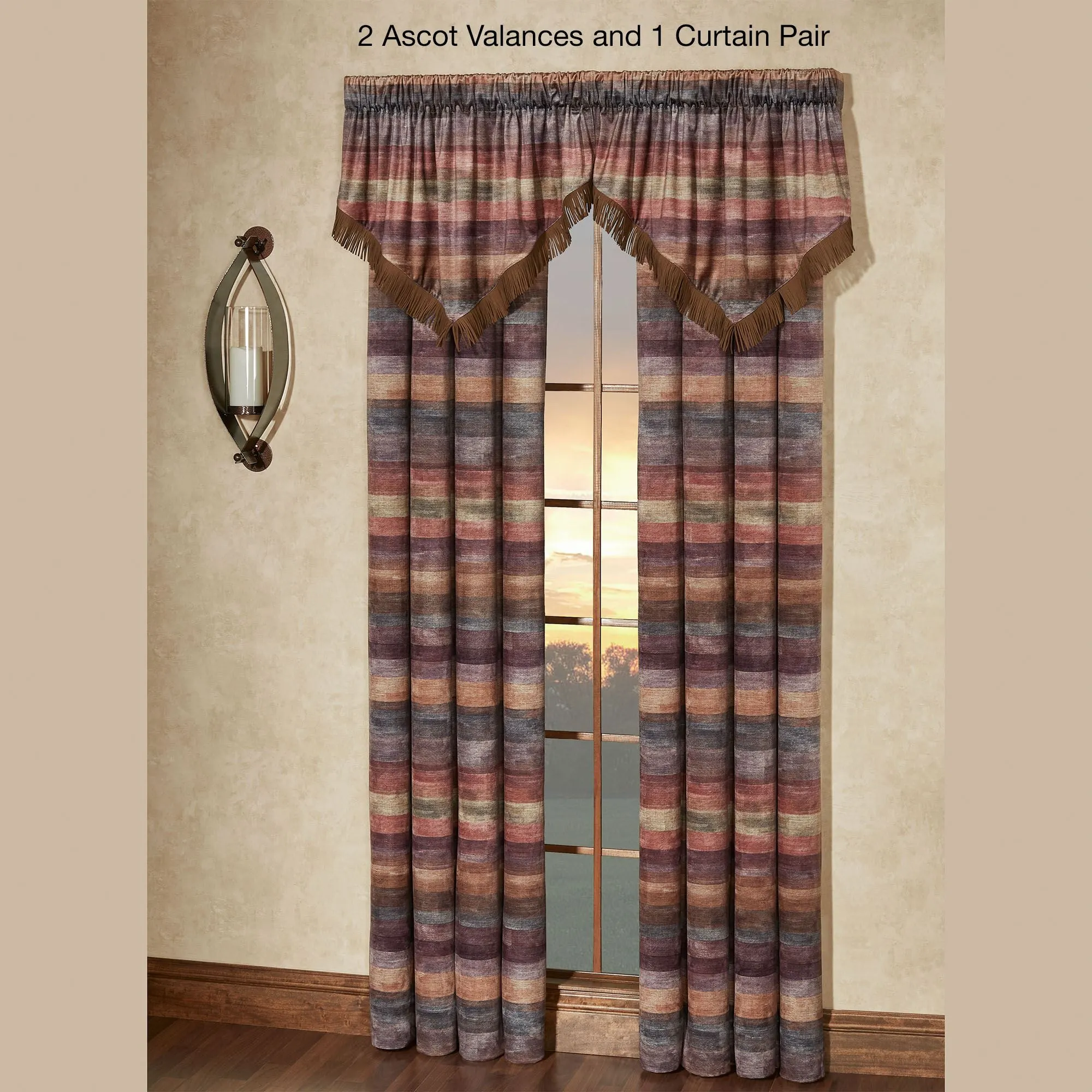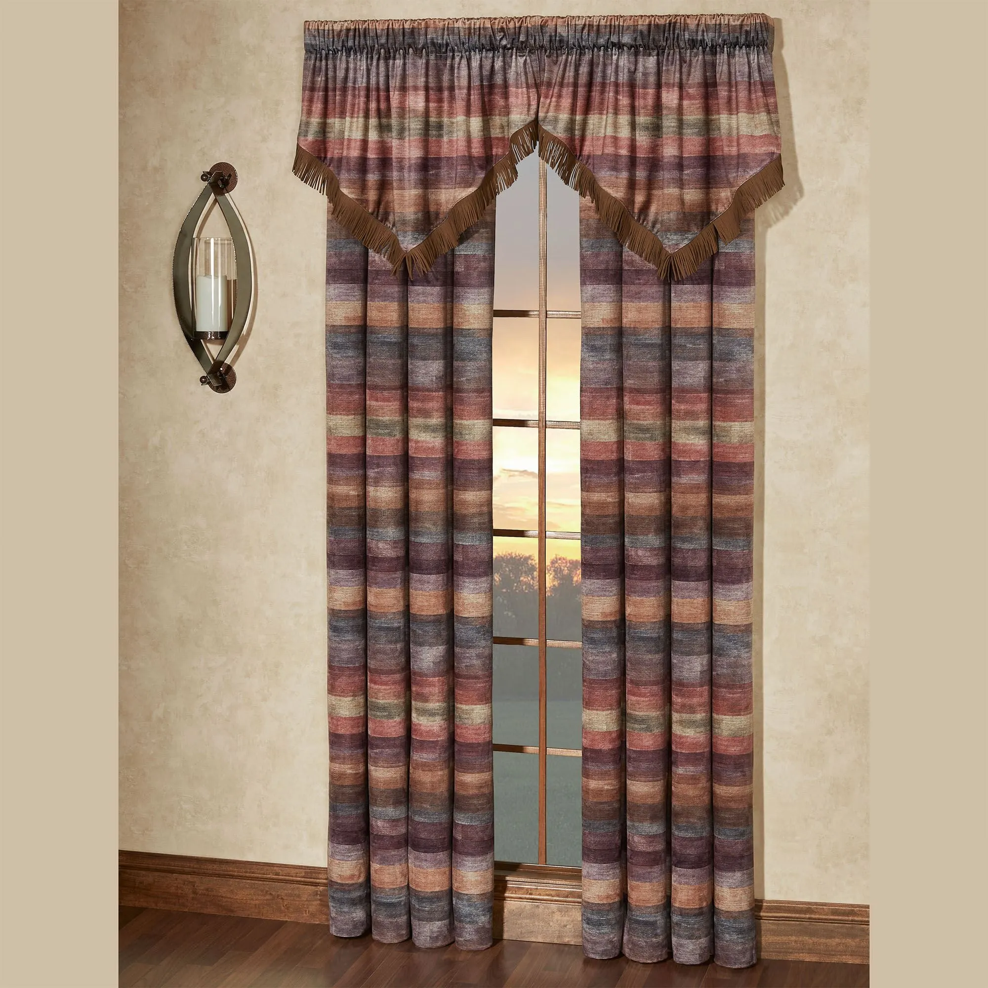 Breathe life into your decor with the captivatingly rich hues of the Sedona Window Treatment. In a striated ombre style, printed shades of aubergine, gold, auburn, and pewter color the sumptuous velvet polyester window treatment with robust beauty. Specify Ascot Valance or Wide Grommet Curtain Pair. Each Ascot Valance has light chocolate faux leather fringe edges. Rod pocket is 3". The lined Wide Grommet Curtains have 1.5" dia. copper metal grommets. Dry clean only. Imported. The curtain pair width is the total width of two panels together.