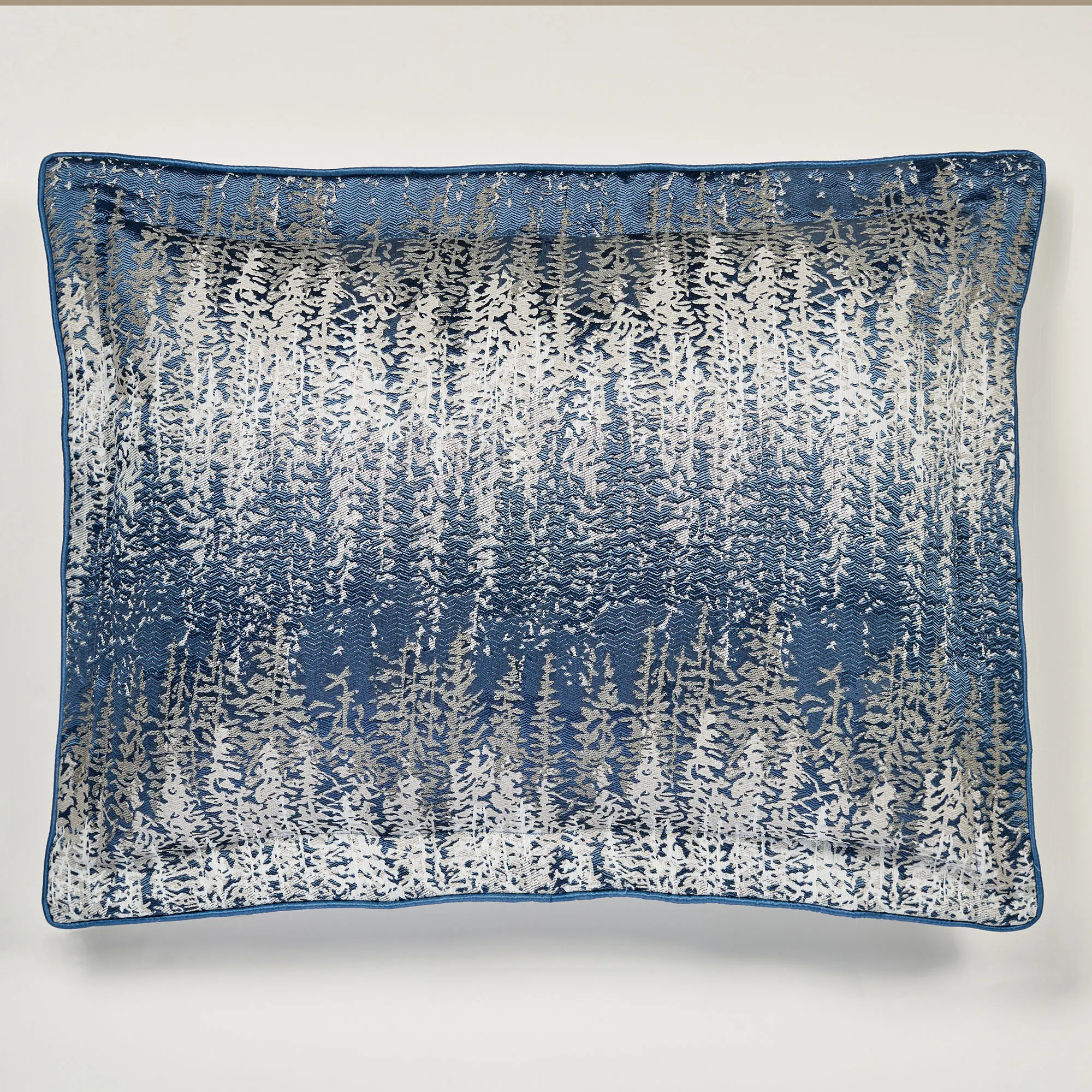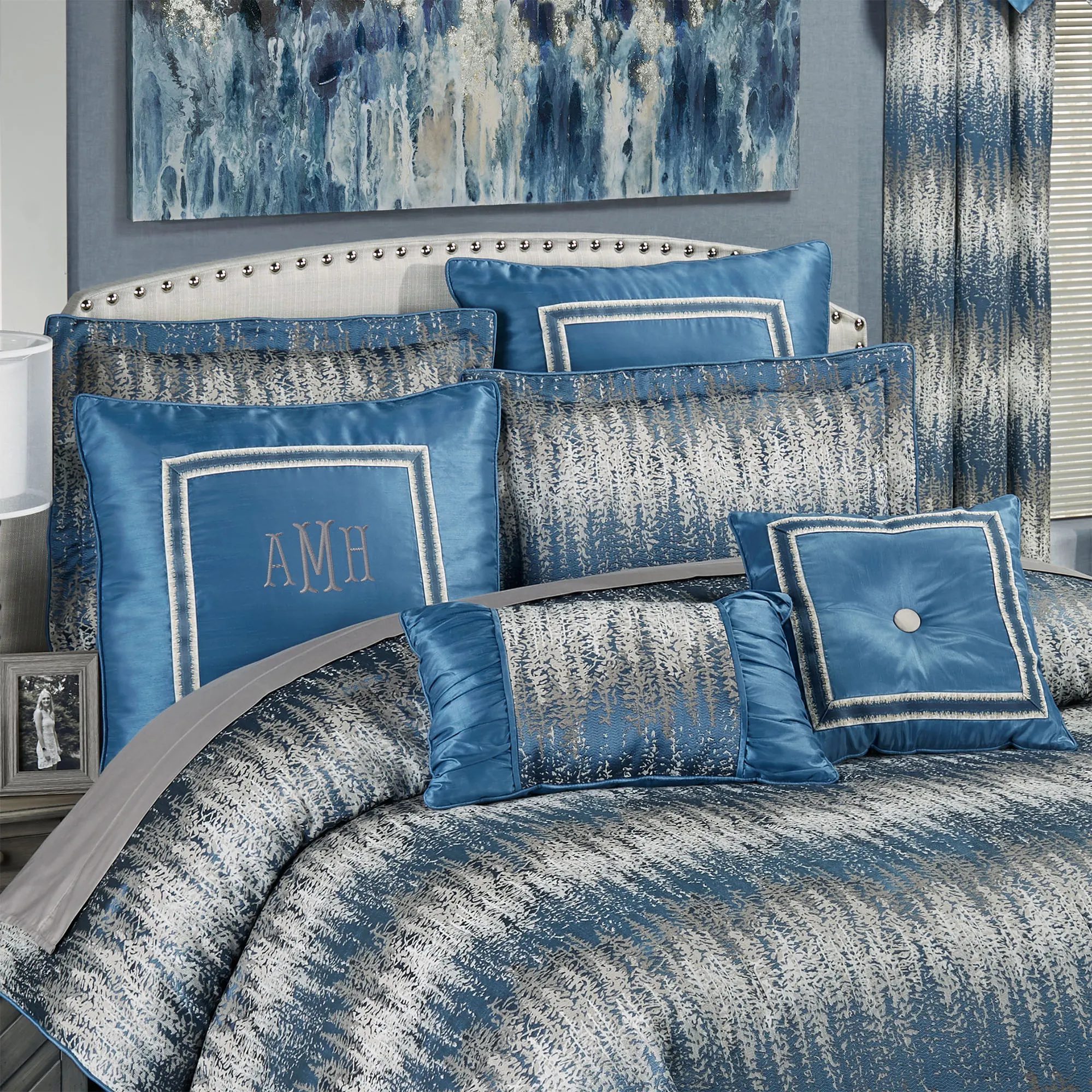 Piped European Sham is steel blue faux silk with a coordinating trim frame; French back closure. European sham may be monogrammed for an extra charge. Monogramming is shown in the Gray thread color.