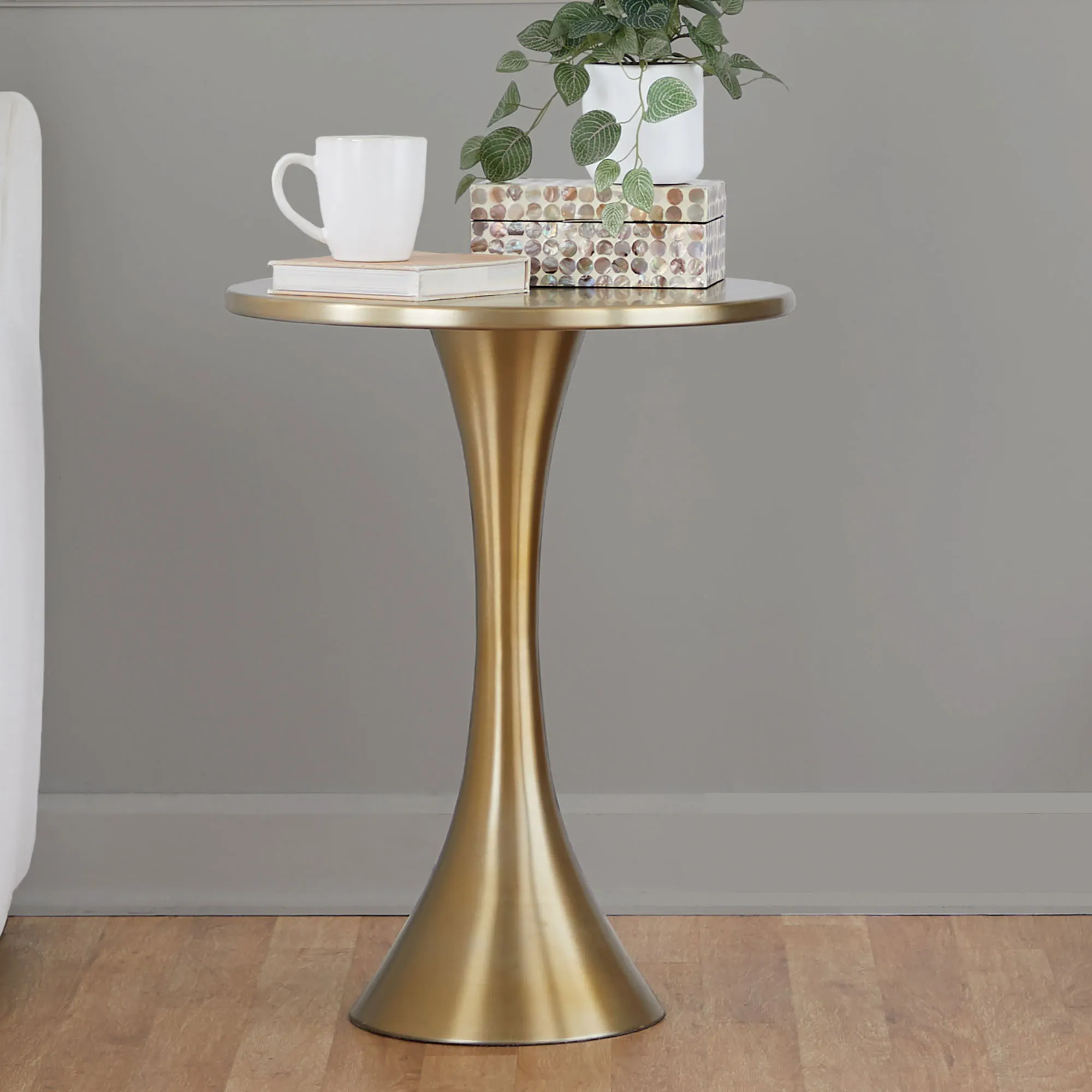 Selene Gold Metal Round Accent Table with Hourglass Shaped Base