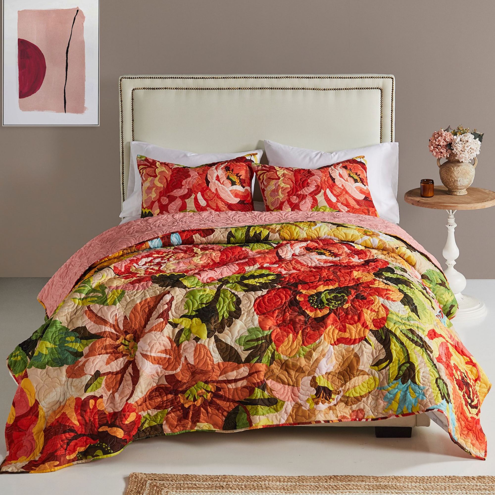 The Senna Floral Bedding makes a bold statement with its oversized flower blossom motifs. The Mini Quilt Set includes a quilt and sham(s). This brushed polyester microfiber bedding shows off a striking printed flower pattern. Colors include shades of red, tan, green, dark chocolate, orange, rust, pink blush, blue, beige, golden yellow, and white. Quilt has floral quilting, bound ends, and a pink blush backing with floral quilting; fill is polyester. Sham(s) mimics the quilt and has bound ends, floral quilting, and a French back closure(s). Machine washable. Imported.