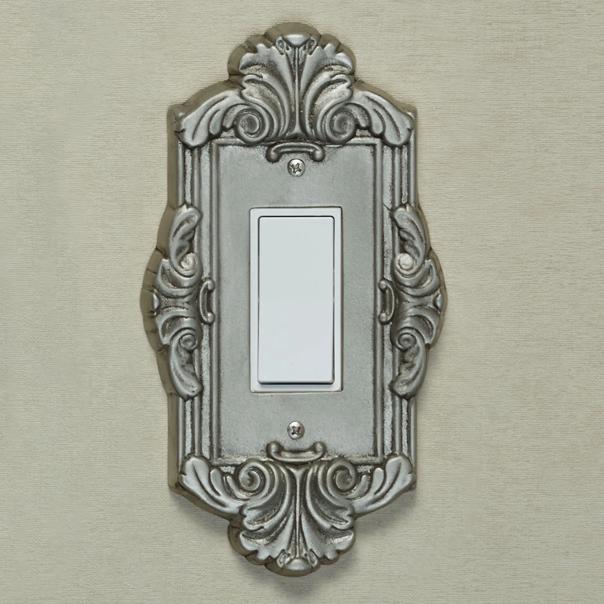Elegantly decorate any living space with the traditional look of the Sephoria Aged Silver Switchplates. These hand-cast aluminum accents have ornate motifs and are beautifully hand-finished in aged silver. The Dimmer/Rocker Switch will also fit a dimmer switch and GFCI outlet. Choose Single Switch, Double Switch, Single Outlet (two sockets), Single Dimmer/Rocker, or Double Dimmer/Rocker. Do not over-tighten the screws.