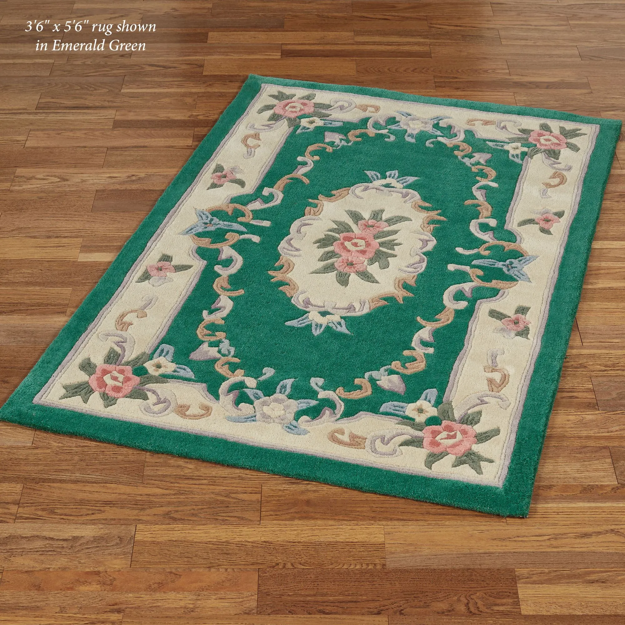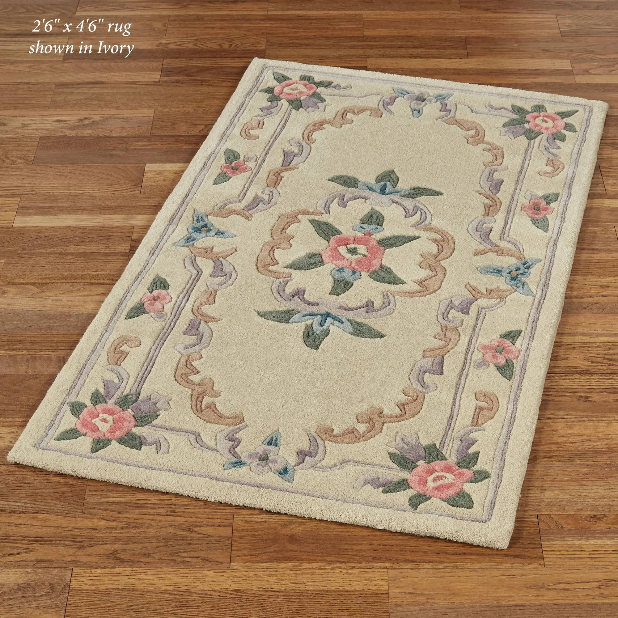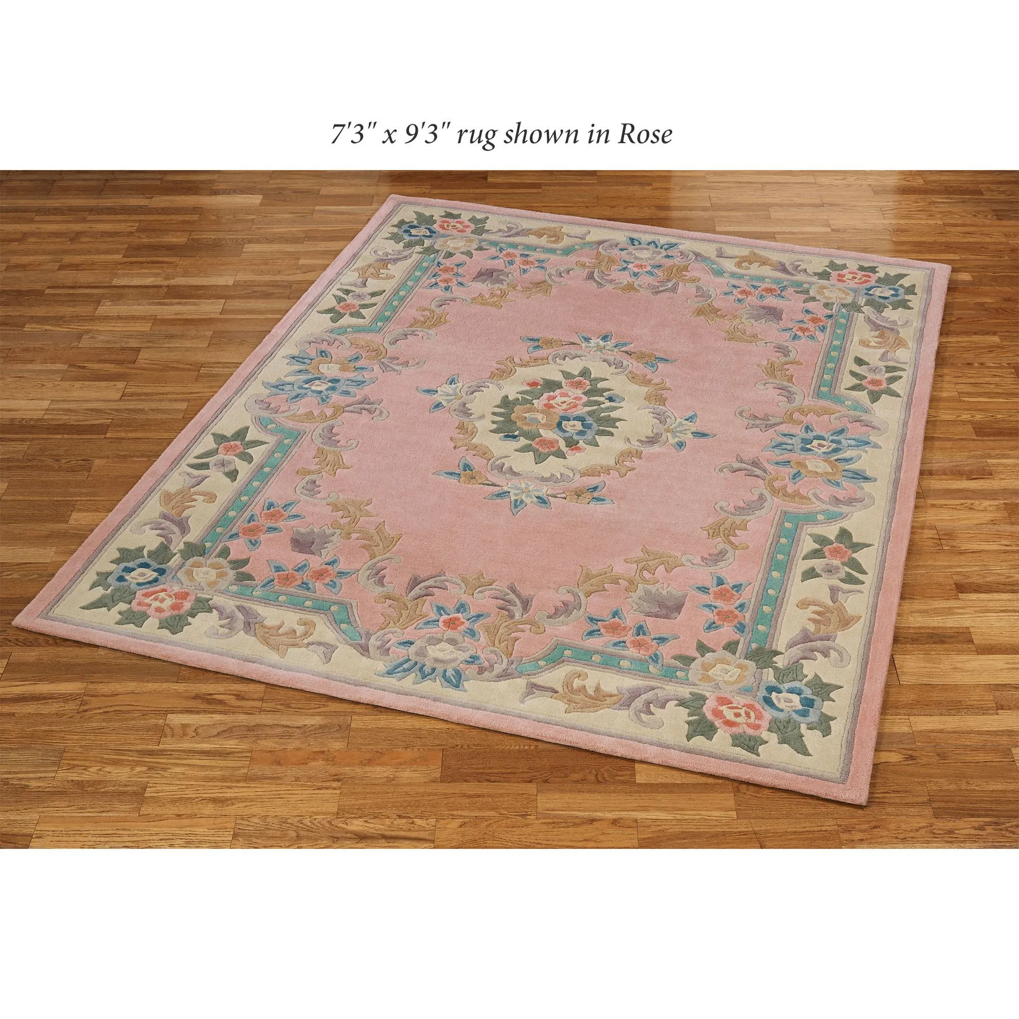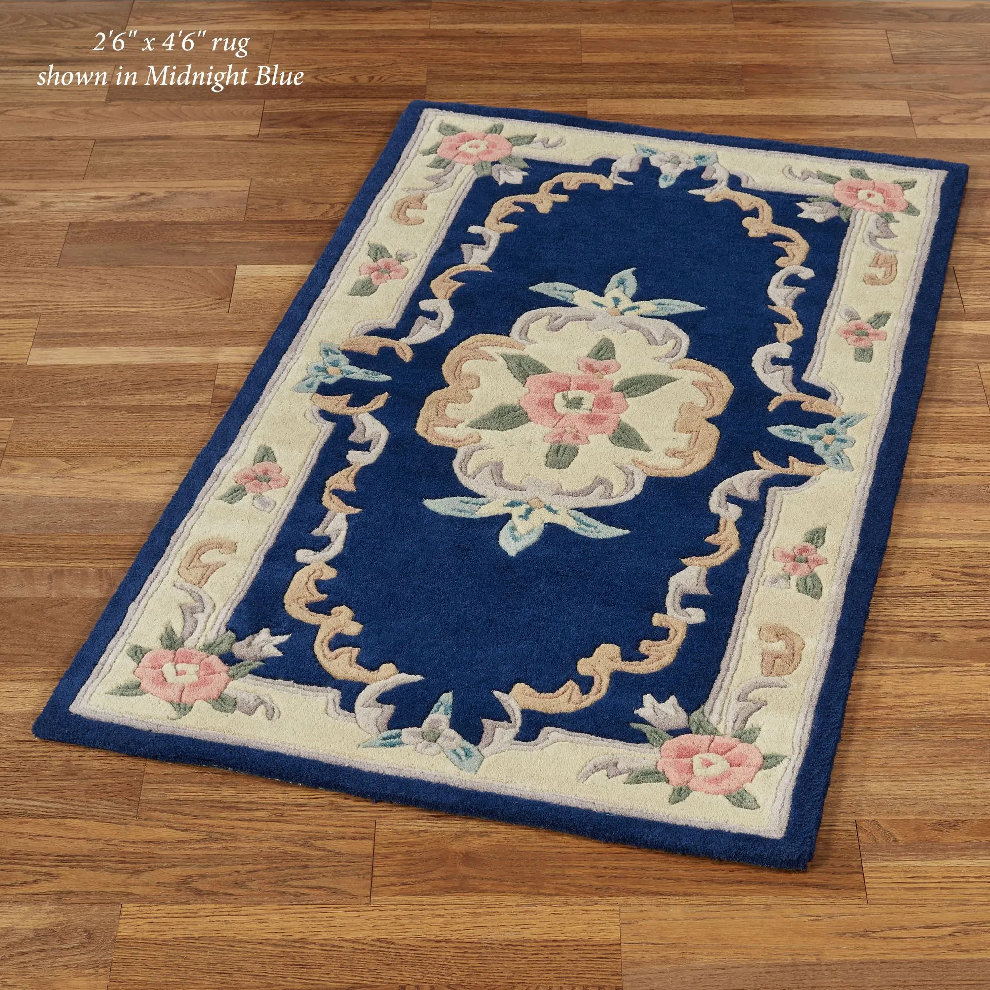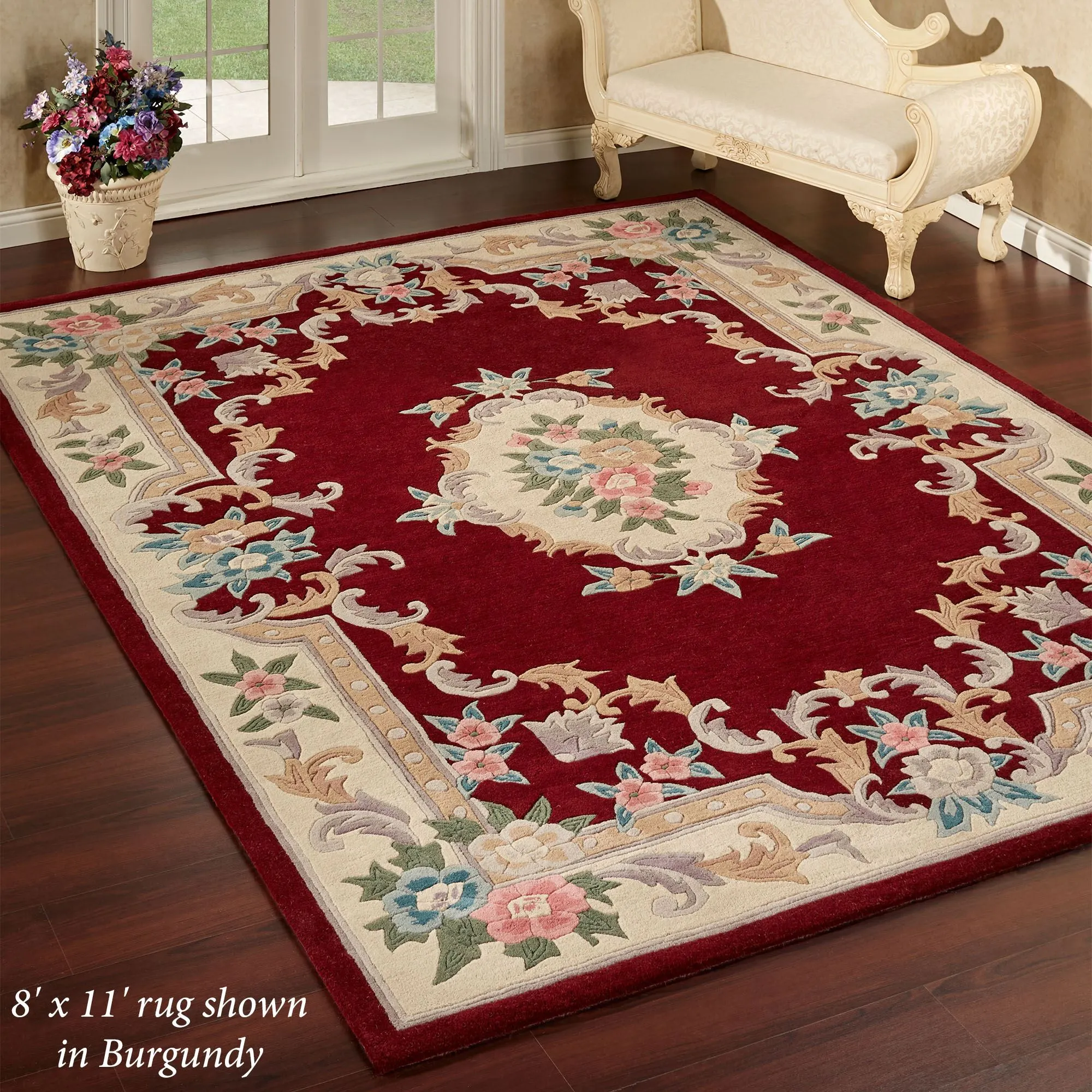 Timeless tradition and a sweet elegance grace the Serena Aubusson II Rugs with charming beauty. These luster-washed wool rugs, .5" thick, wear well and feel soft underfoot. The lovely Aubusson design has intricate detailing of roses, florals, acanthus leaves, and scrolls. A high standard of depth and detail, accomplished through intricate handcarving, makes the designs spring vividly to life. Backing is cloth-covered latex. Due to the handcrafted nature, slight variations in size, color, and design are inherent. Specify Rose, Burgundy, Emerald Green, Ivory, Midnight Blue, or Parisian Blue. We recommend professional cleaning by a rug cleaner. Imported.