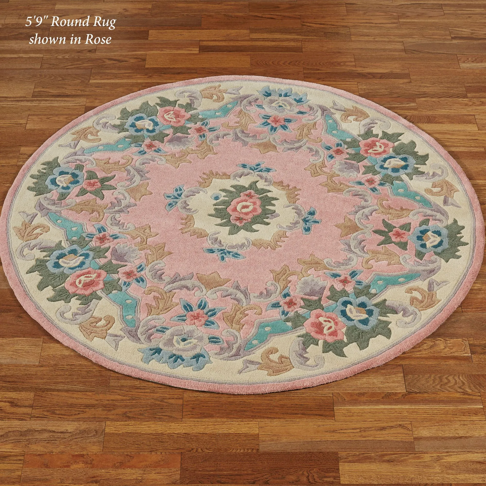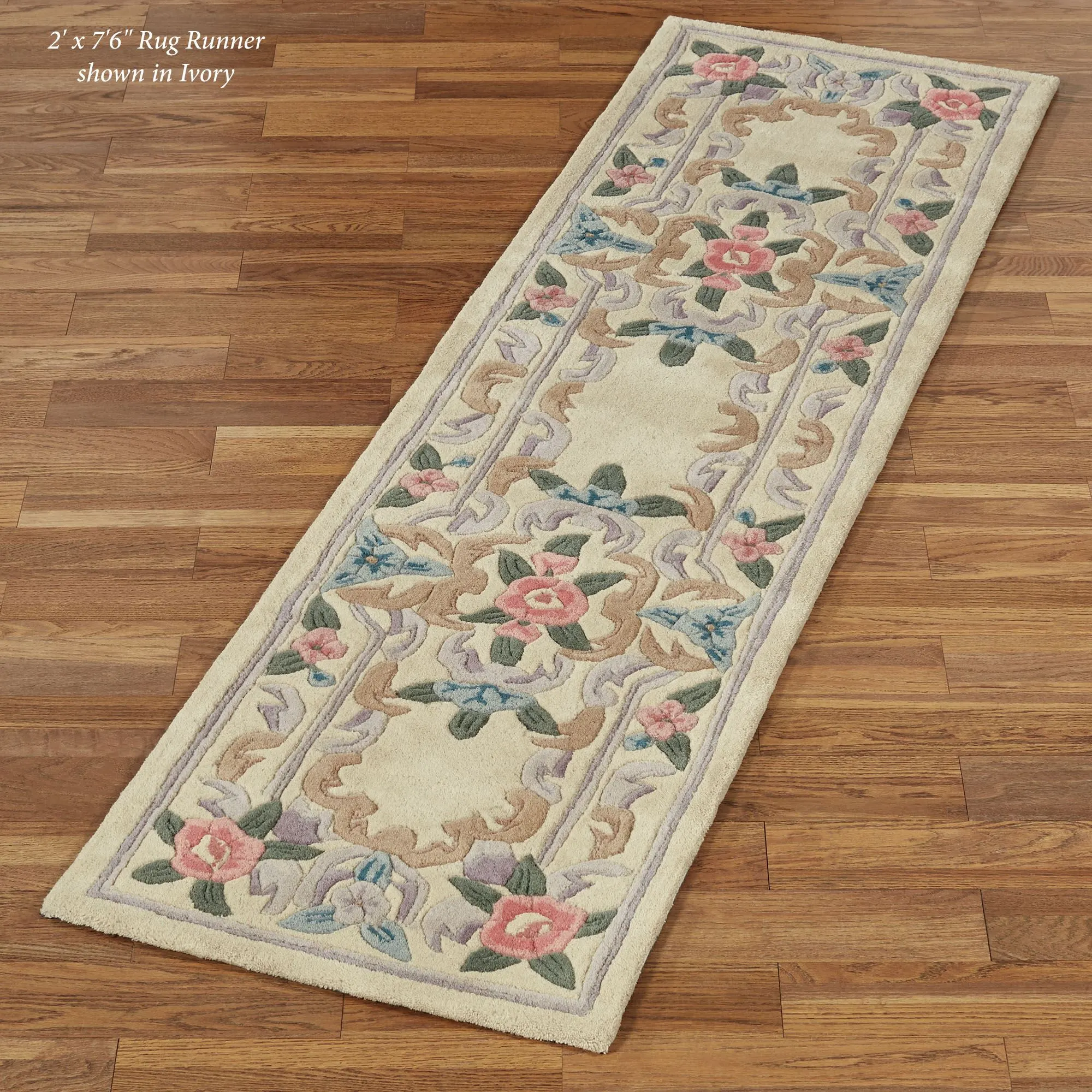 Flowers and leaves accent the corners of rectangles and are interspersed with smaller florals on the oval and round rugs. These hand-tufted rugs offer a wide range of colors and sizes to coordinate room-size rugs with smaller accent or area rugs. Runners may be used to create a smooth visual transition from room to room; round rugs look elegant beneath tables. Design will vary by size.