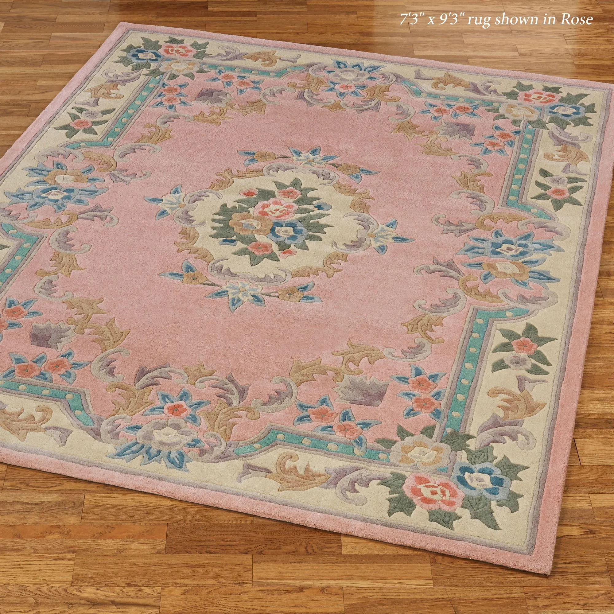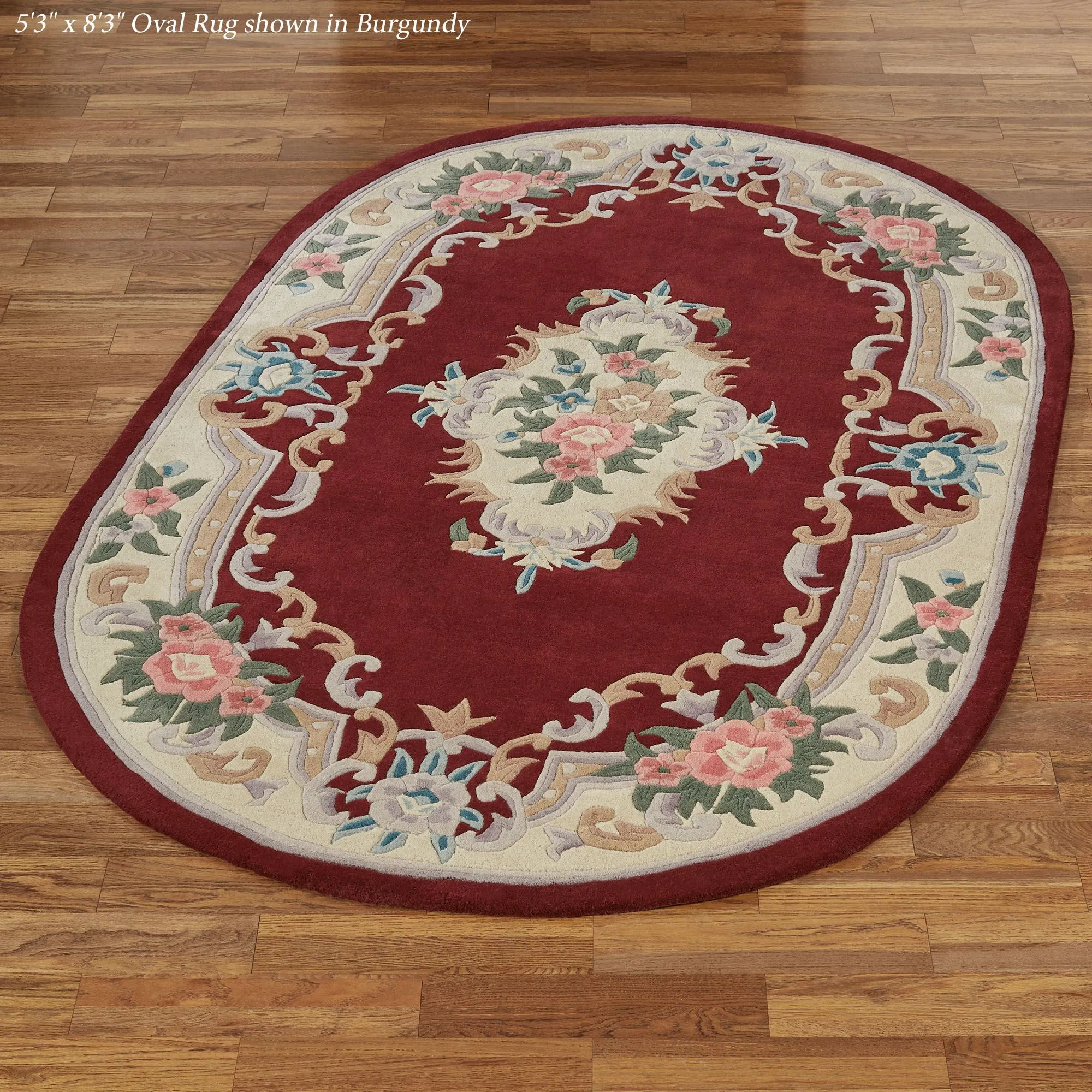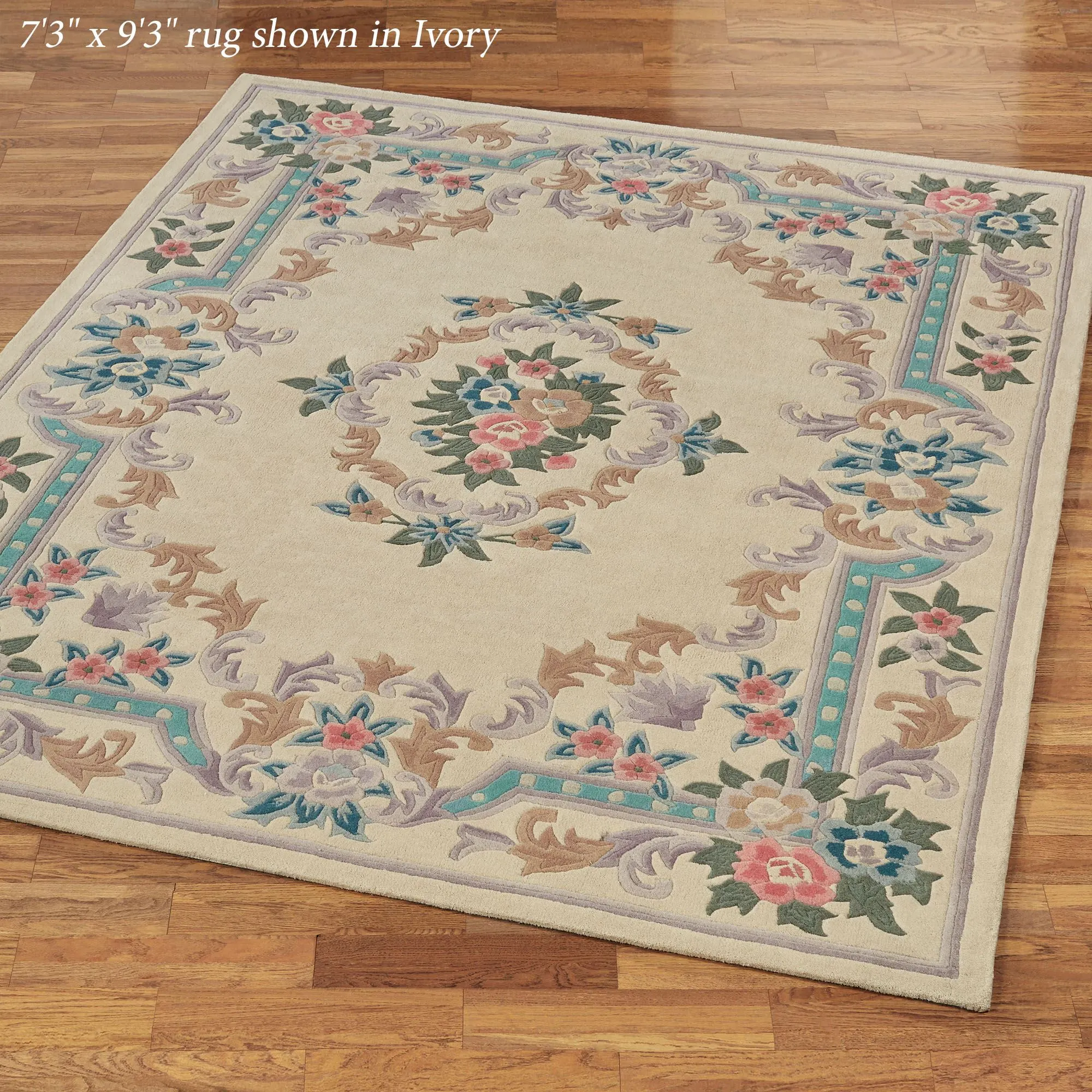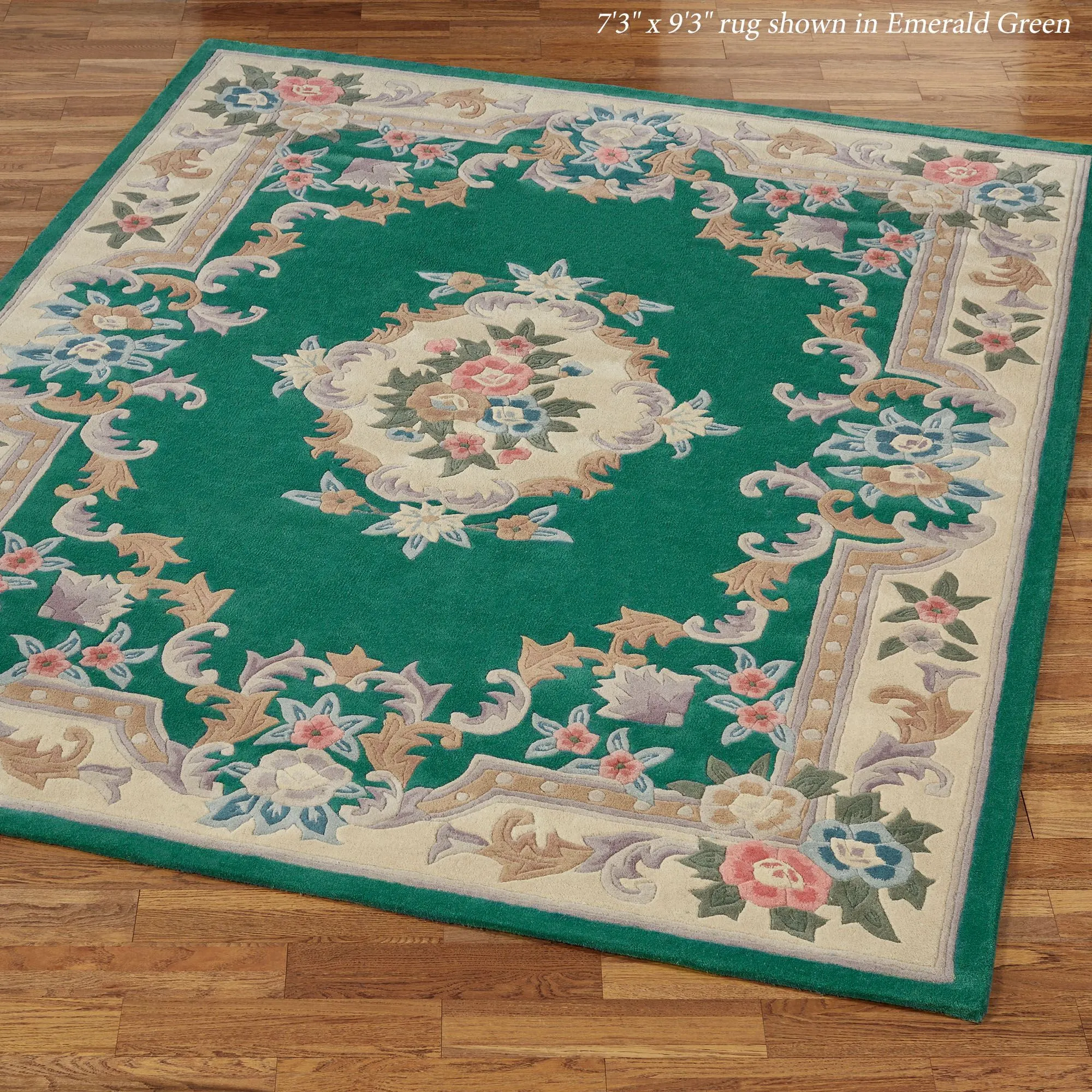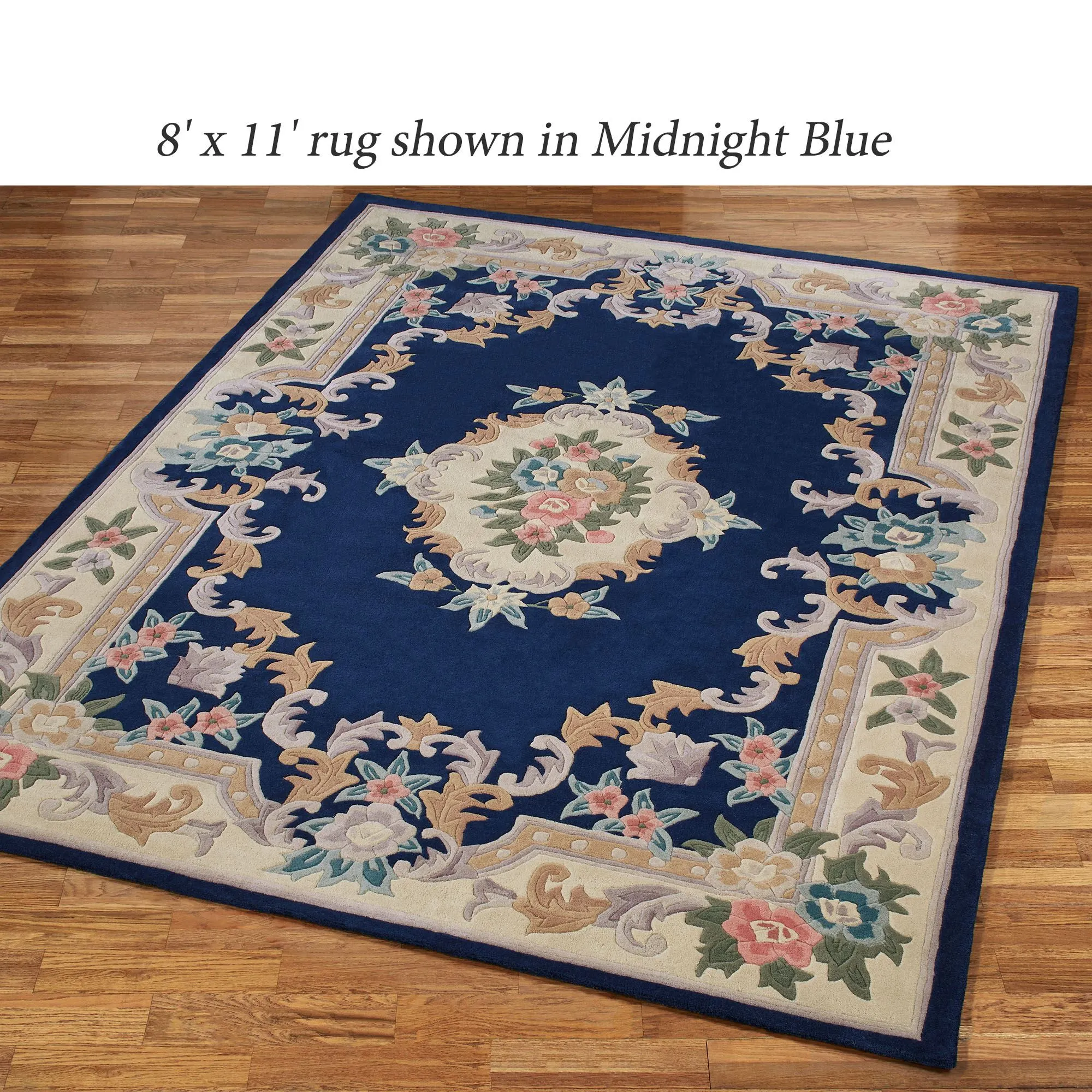 Timeless tradition and a sweet elegance grace the Serena Aubusson II Area Rugs with charming beauty. These luster-washed wool rugs, .5" thick, wear well and feel soft underfoot. The lovely Aubusson design has intricate detailing of roses, florals, acanthus leaves, and scrolls. A high standard of depth and detail, accomplished through intricate handcarving, makes the designs spring vividly to life. Backing is cloth-covered latex. Due to the handcrafted nature, slight variations in size, color, and design are inherent. Specify Ivory, Burgundy, Emerald Green, Midnight Blue, Parisian Blue, or Rose. We recommend professional cleaning by a rug cleaner. Imported.