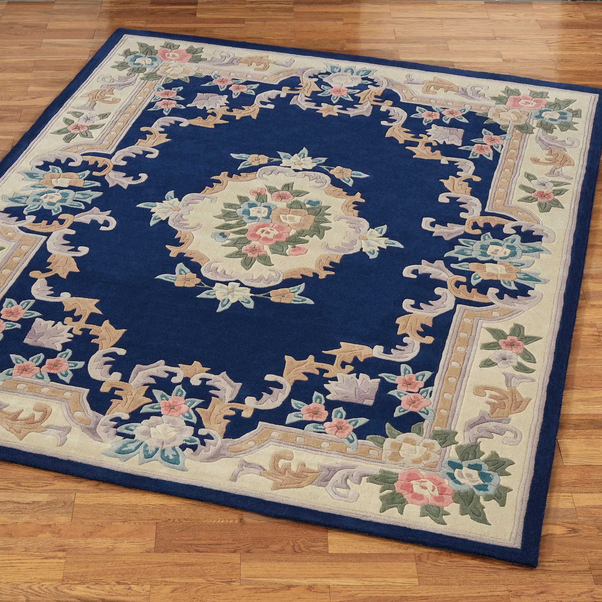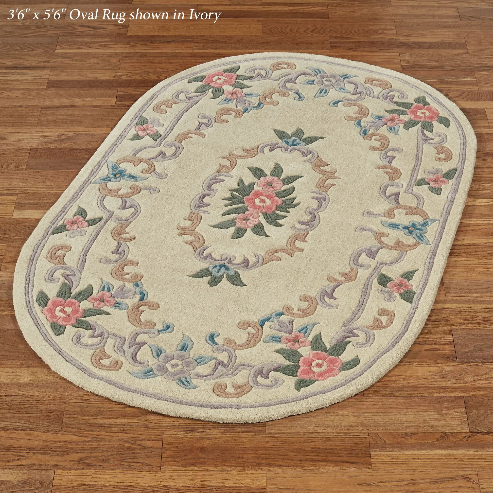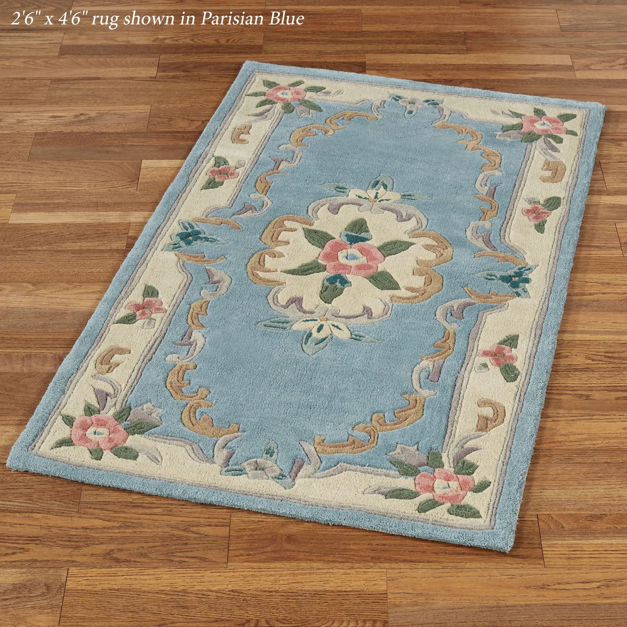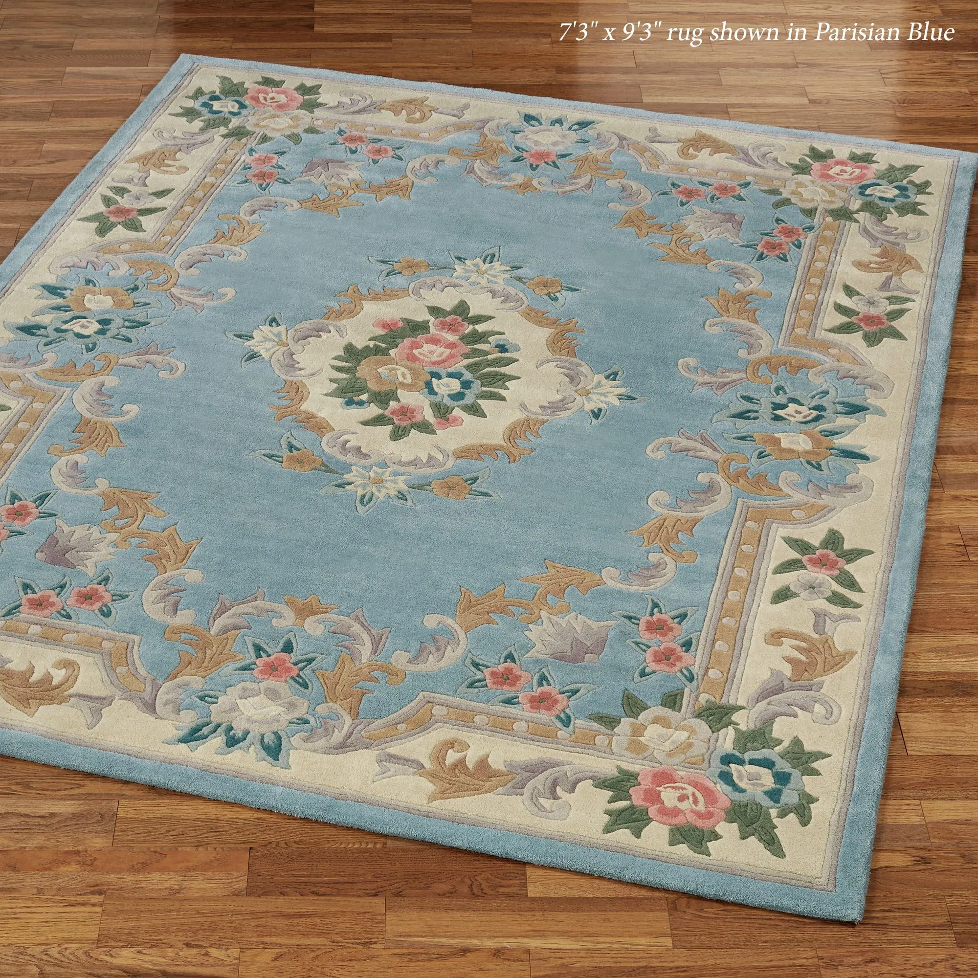 Timeless tradition and a sweet elegance grace the Serena Aubusson II Area Rugs with charming beauty. These luster-washed wool rugs, .5" thick, wear well and feel soft underfoot. The lovely Aubusson design has intricate detailing of roses, florals, acanthus leaves, and scrolls. A high standard of depth and detail, accomplished through intricate handcarving, makes the designs spring vividly to life. Backing is cloth-covered latex. Due to the handcrafted nature, slight variations in size, color, and design are inherent. Specify Ivory, Burgundy, Emerald Green, Midnight Blue, Parisian Blue, or Rose. We recommend professional cleaning by a rug cleaner. Imported.
