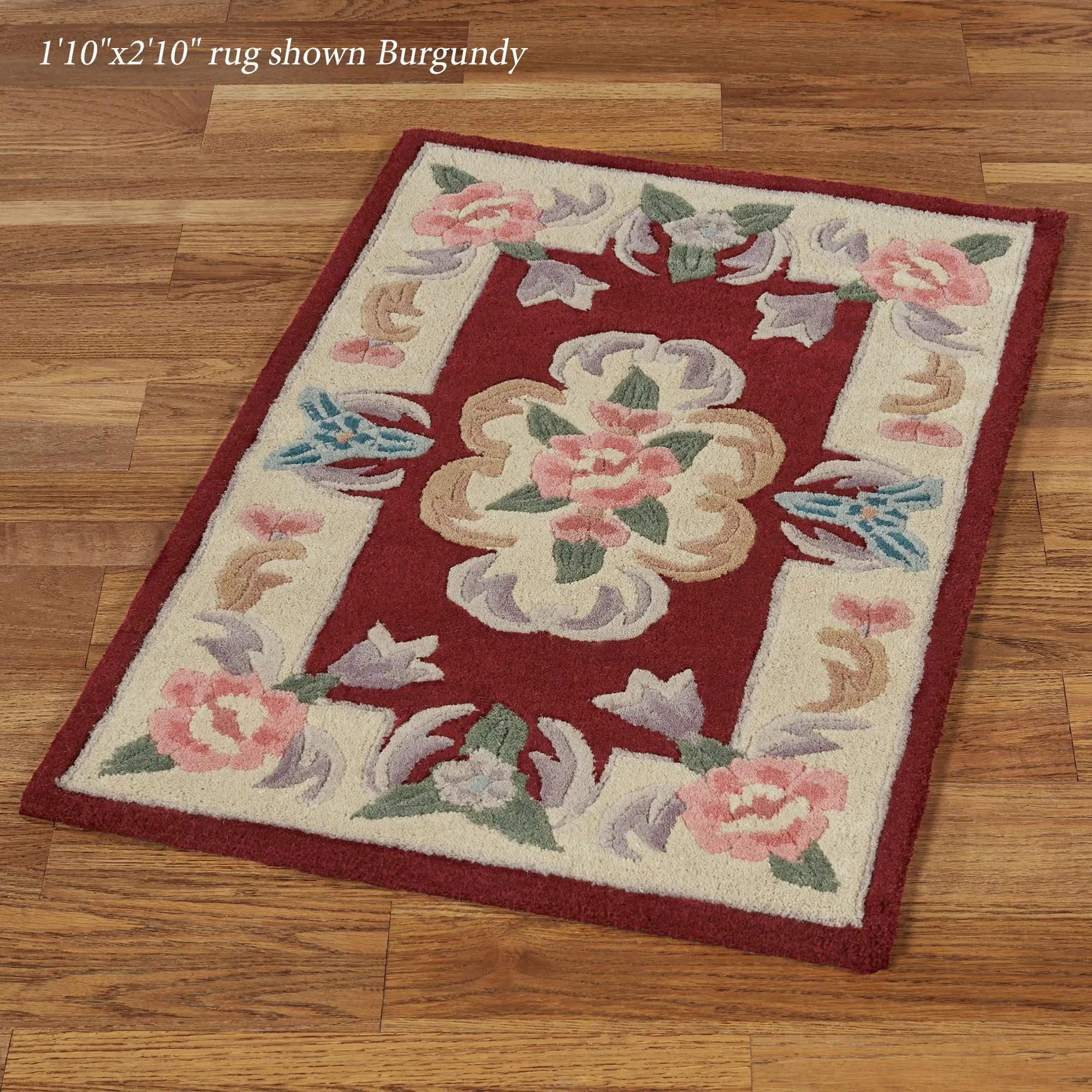 Flowers and leaves accent the corners of rectangles and are interspersed with smaller florals on the oval and round rugs. These hand-tufted rugs offer a wide range of colors and sizes to coordinate room-size rugs with smaller accent or area rugs. Runners may be used to create a smooth visual transition from room to room; round rugs look elegant beneath tables. Design will vary by size.