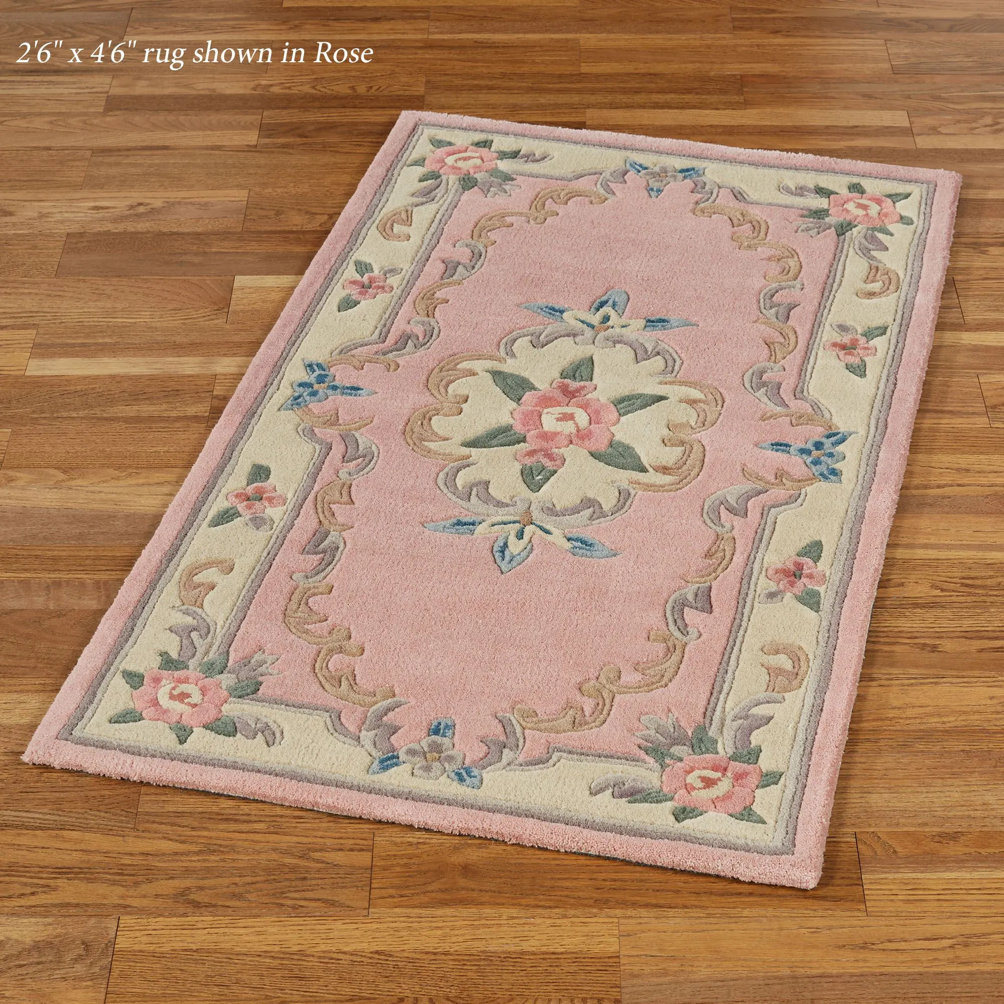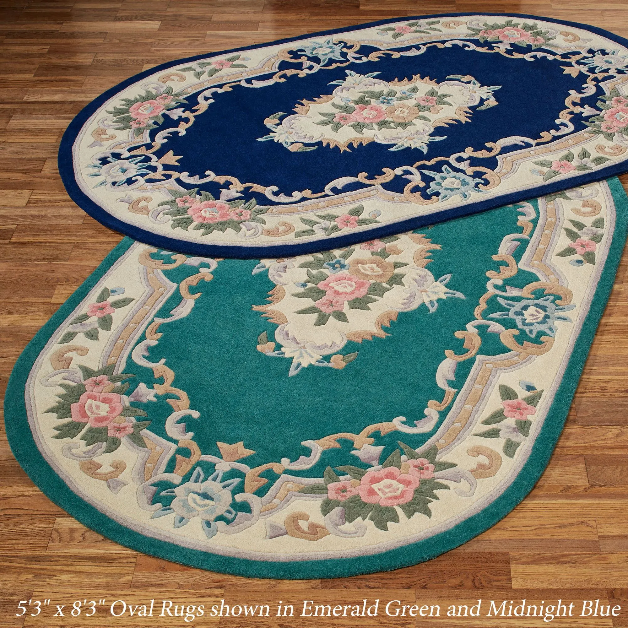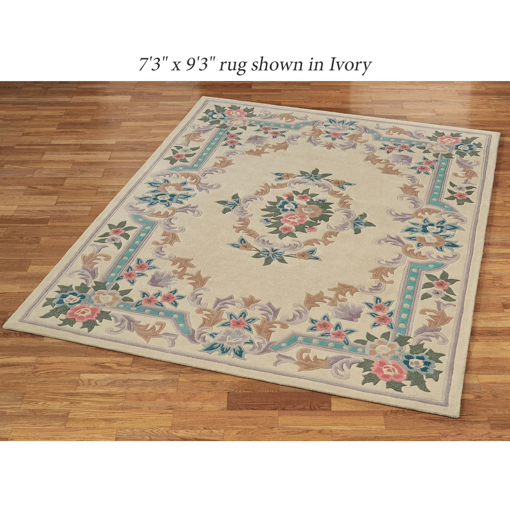 Timeless tradition and a sweet elegance grace the Serena Aubusson II Rugs with charming beauty. These luster-washed wool rugs, .5" thick, wear well and feel soft underfoot. The lovely Aubusson design has intricate detailing of roses, florals, and acanthus leaves; some sizes also have scrolls. A high standard of depth and detail, accomplished through intricate handcarving, makes the designs spring vividly to life. Backing is cloth-covered latex. Due to the handcrafted nature, slight variations in size, color, and design are inherent. Specify Midnight Blue, Burgundy, Emerald Green, Ivory, Parisian Blue, or Rose. We recommend professional cleaning by a rug cleaner. Imported.