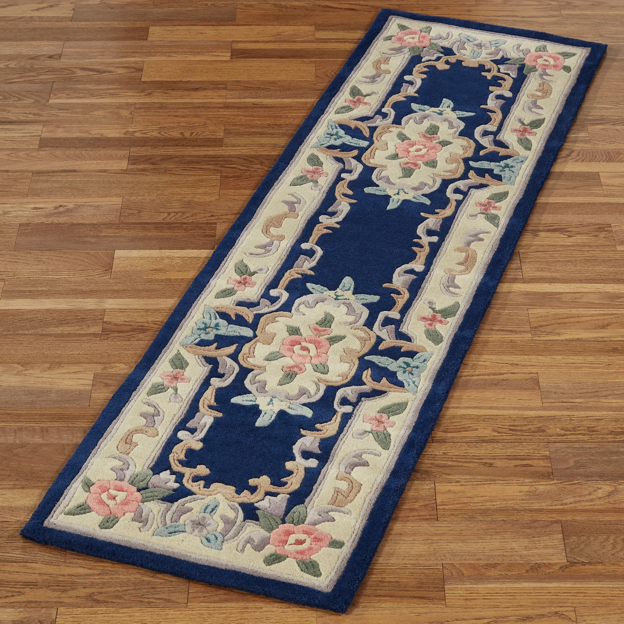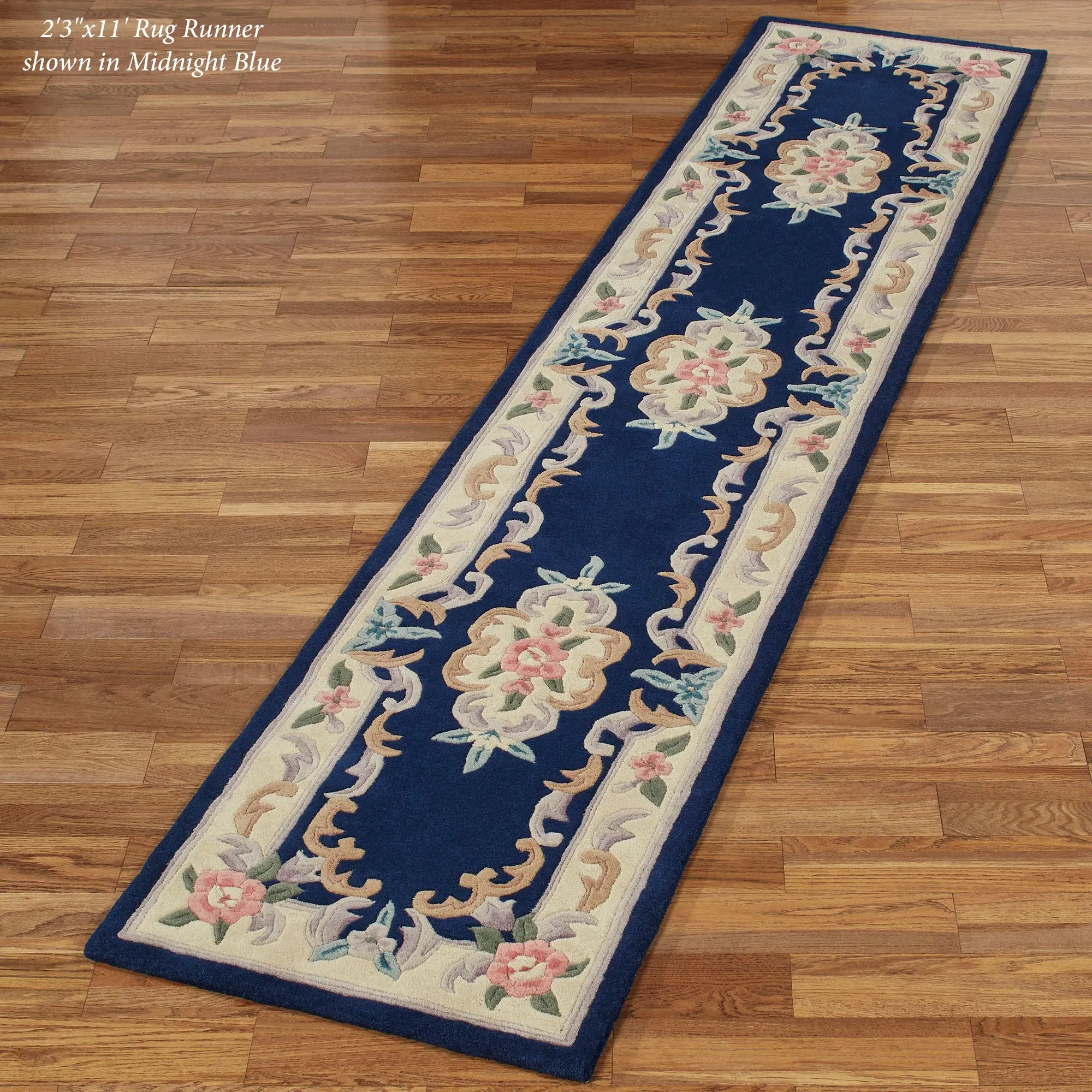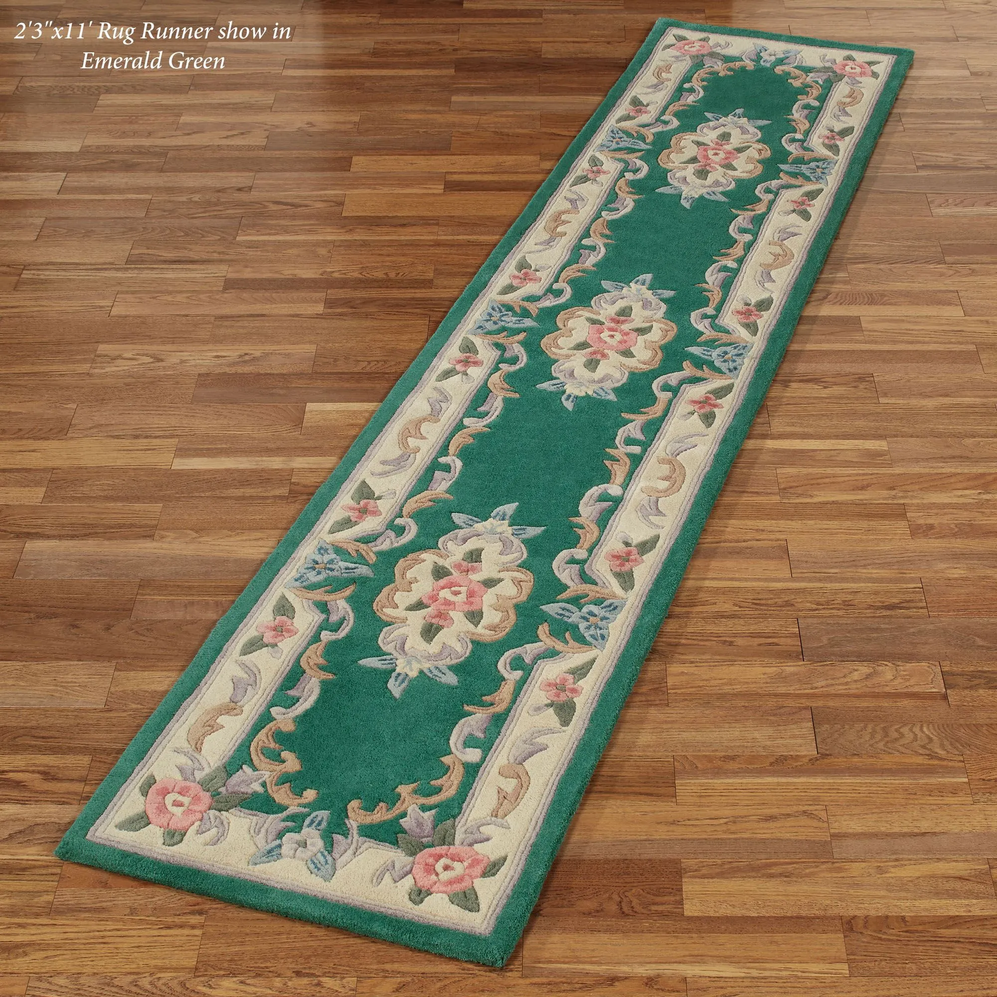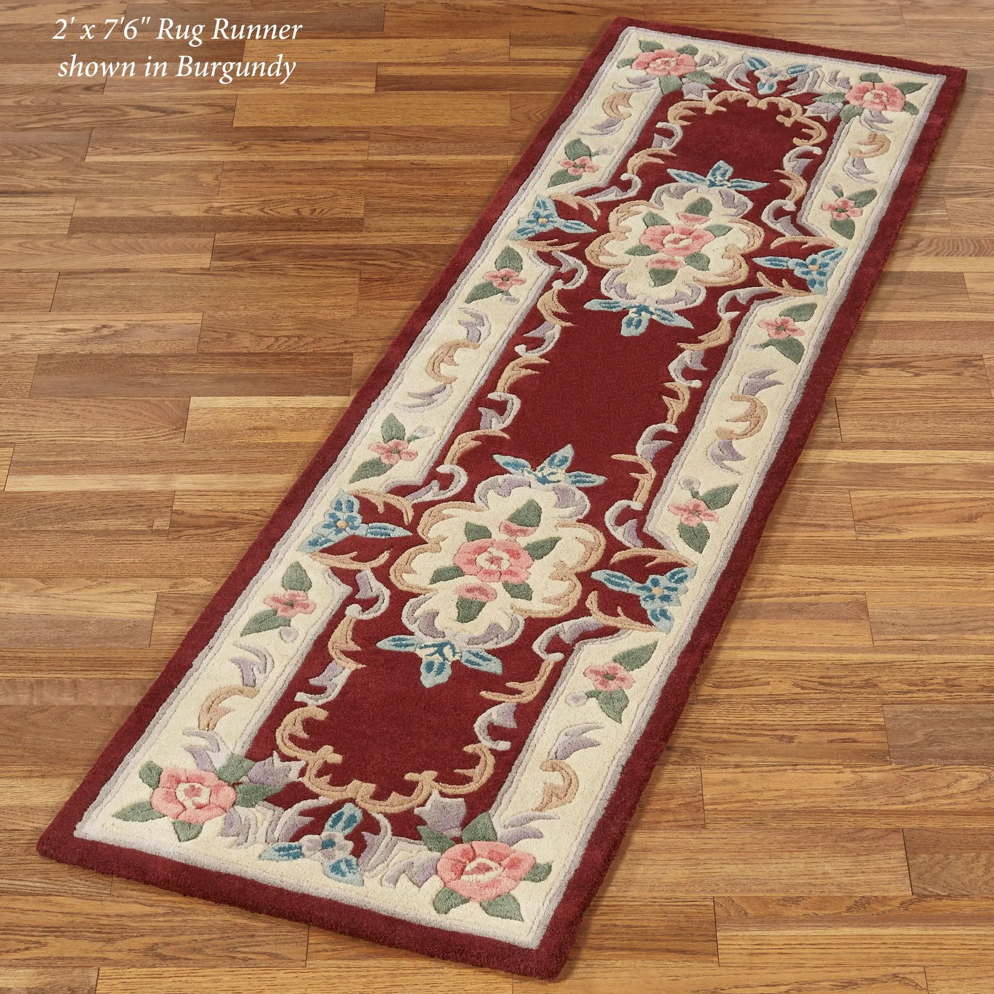 Timeless tradition and a sweet elegance grace the Serena Aubusson II Runner Rugs with charming beauty. These luster-washed wool runner rugs, .5" thick, wear well and feel soft underfoot. The lovely Aubusson design has intricate detailing of roses, florals, acanthus leaves, and scrolls. A high standard of depth and detail, accomplished through intricate handcarving, makes the designs spring vividly to life. Backing is cloth-covered latex. Due to the handcrafted nature, slight variations in size, color, and design are inherent. Specify Emerald Green, Burgundy, Ivory, Midnight Blue, Parisian Blue, or Rose. We recommend professional cleaning by a rug cleaner. Imported.