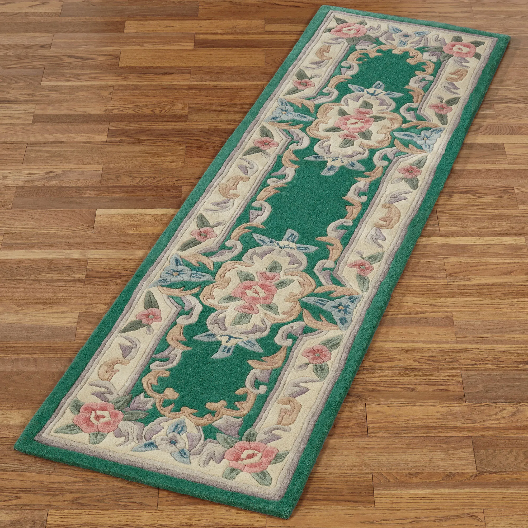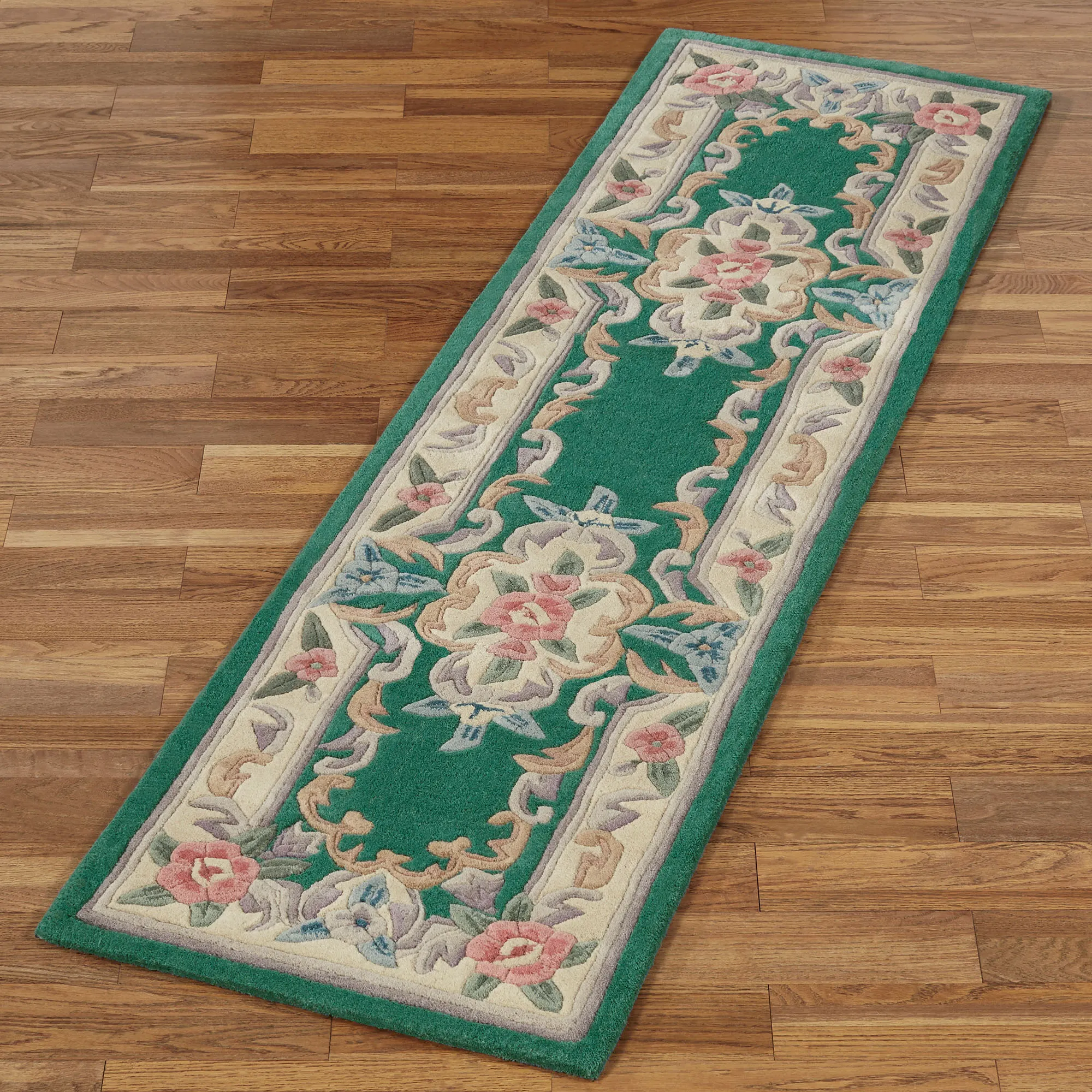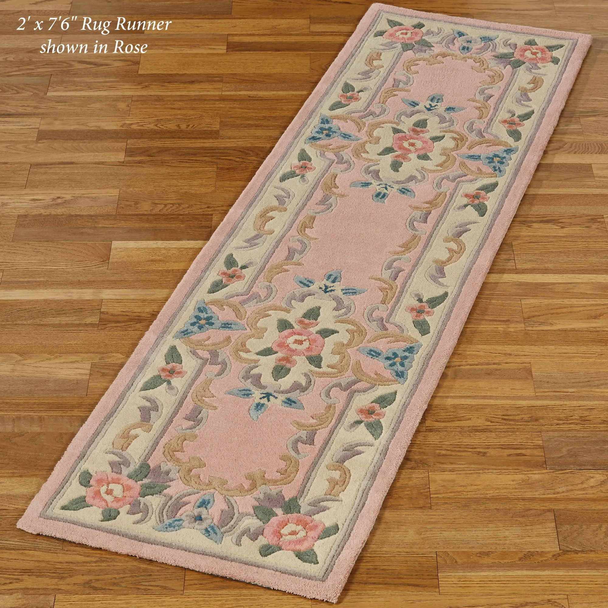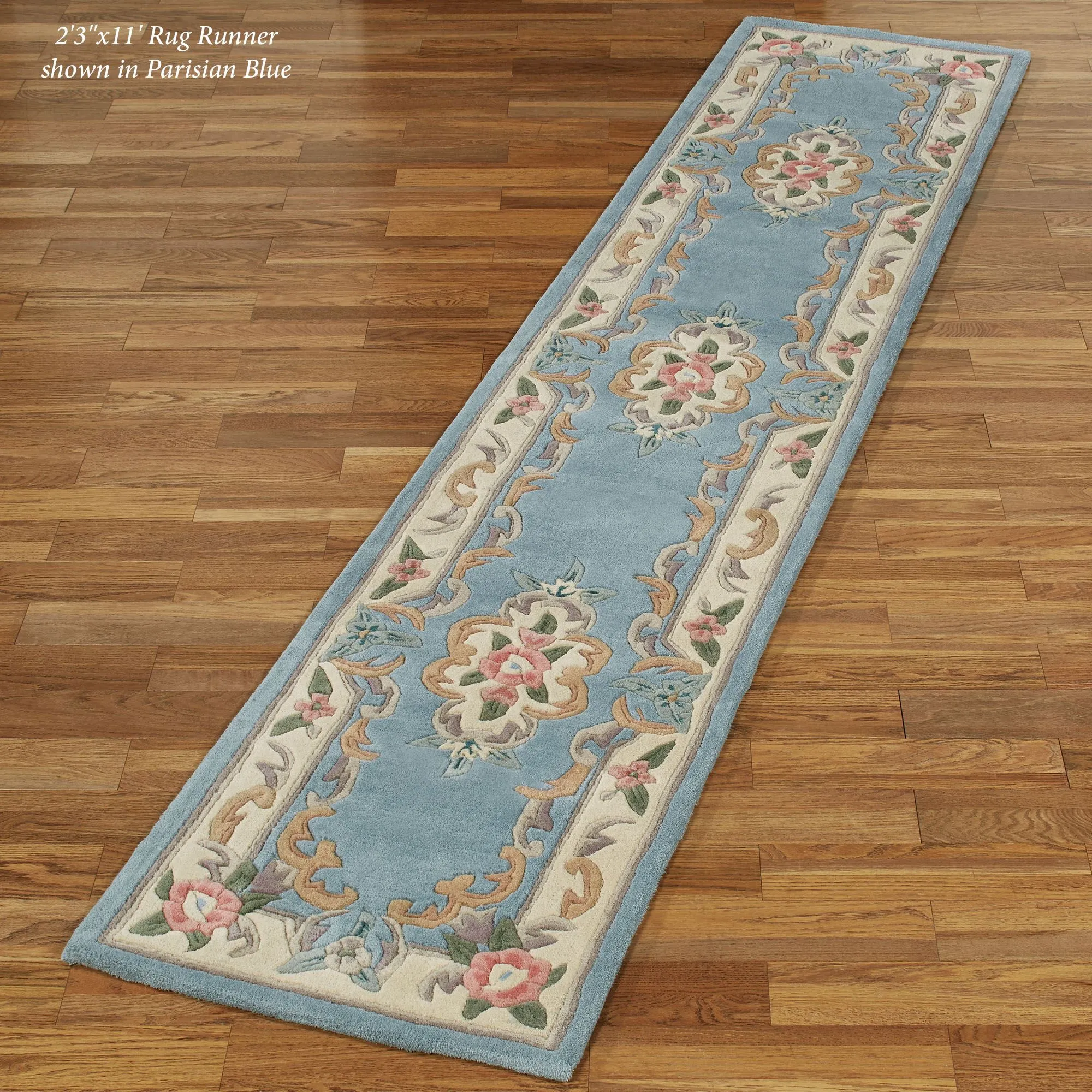 Timeless tradition and a sweet elegance grace the Serena Aubusson II Runner Rugs with charming beauty. These luster-washed wool runner rugs, .5" thick, wear well and feel soft underfoot. The lovely Aubusson design has intricate detailing of roses, florals, acanthus leaves, and scrolls. A high standard of depth and detail, accomplished through intricate handcarving, makes the designs spring vividly to life. Backing is cloth-covered latex. Due to the handcrafted nature, slight variations in size, color, and design are inherent. Specify Emerald Green, Burgundy, Ivory, Midnight Blue, Parisian Blue, or Rose. We recommend professional cleaning by a rug cleaner. Imported.