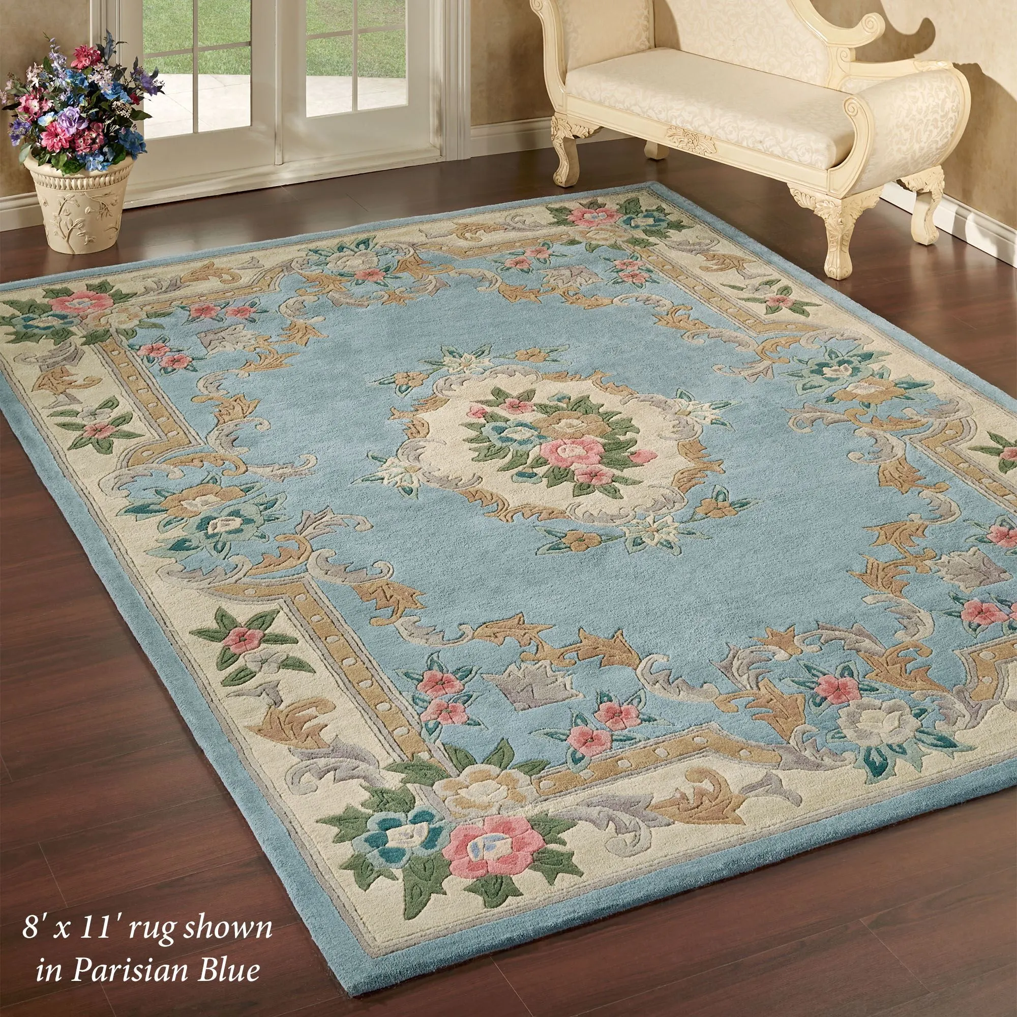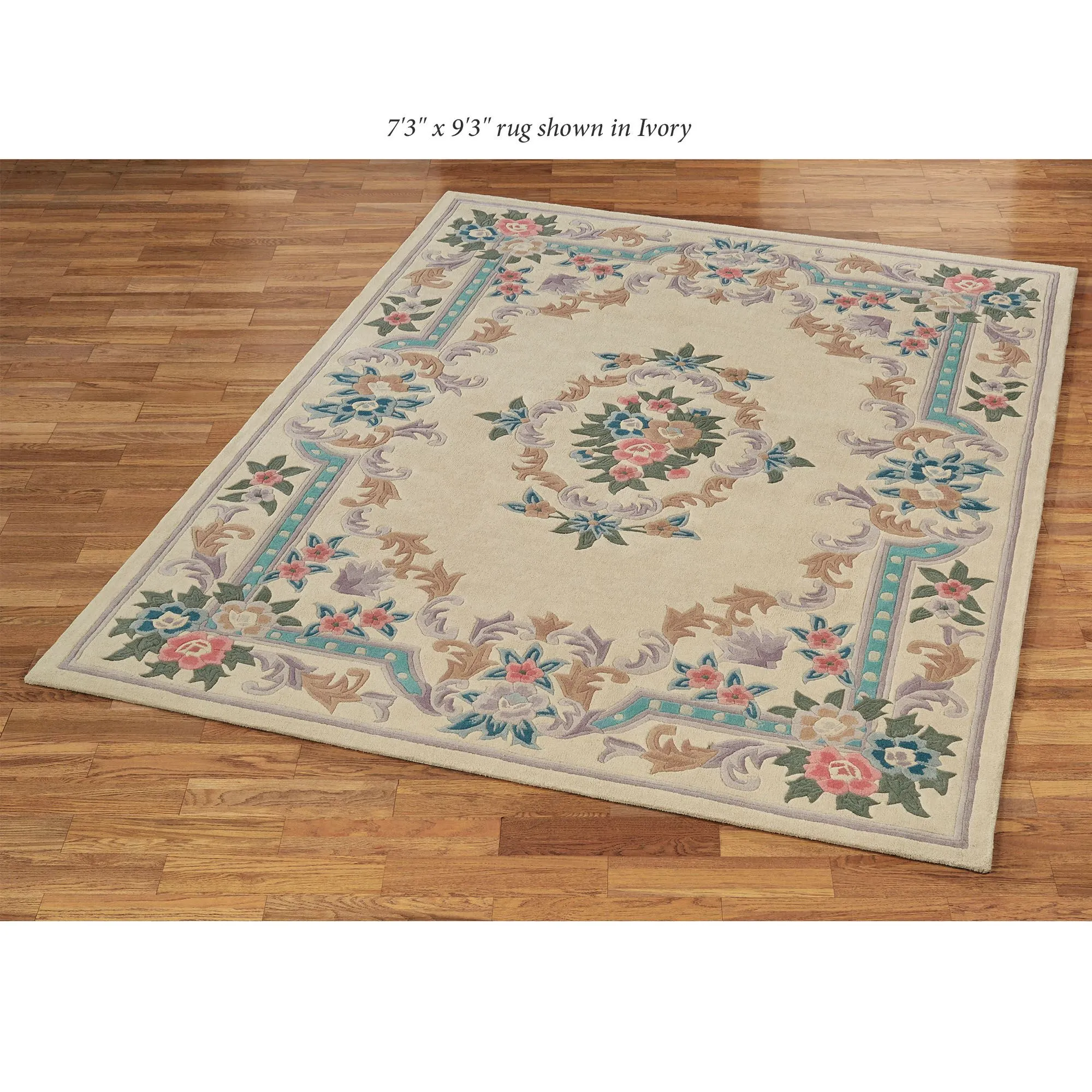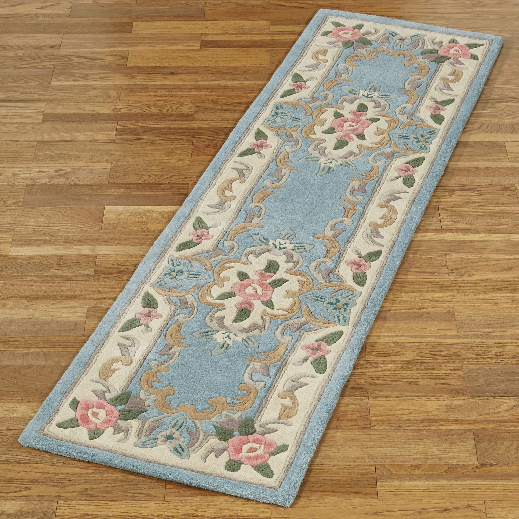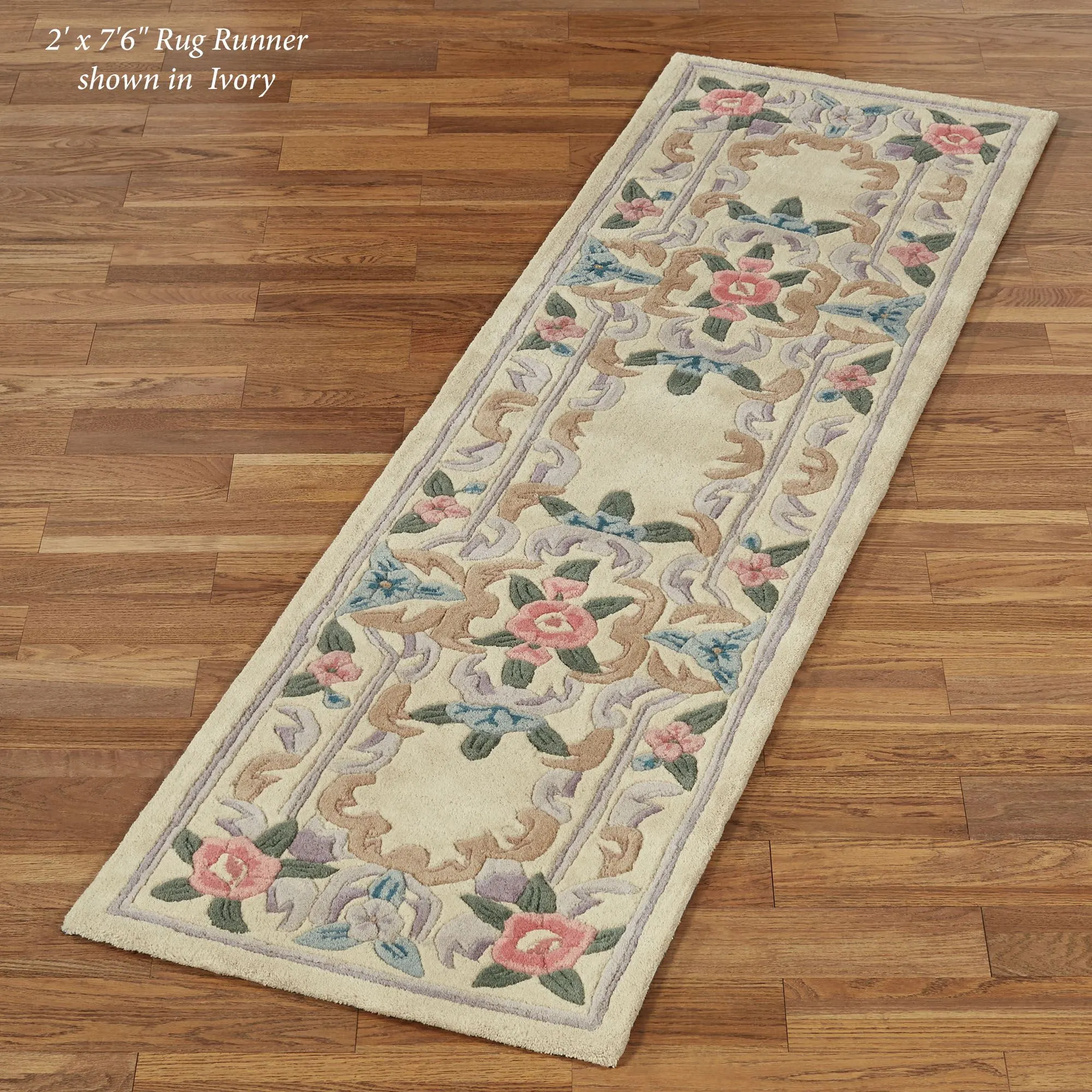 Timeless tradition and a sweet elegance grace the Serena Aubusson II Runner Rugs with charming beauty. These luster-washed wool runner rugs, .5" thick, wear well and feel soft underfoot. The lovely Aubusson design has intricate detailing of roses, florals, acanthus leaves, and scrolls. A high standard of depth and detail, accomplished through intricate handcarving, makes the designs spring vividly to life. Backing is cloth-covered latex. Due to the handcrafted nature, slight variations in size, color, and design are inherent. Specify Emerald Green, Burgundy, Ivory, Midnight Blue, Parisian Blue, or Rose. We recommend professional cleaning by a rug cleaner. Imported.