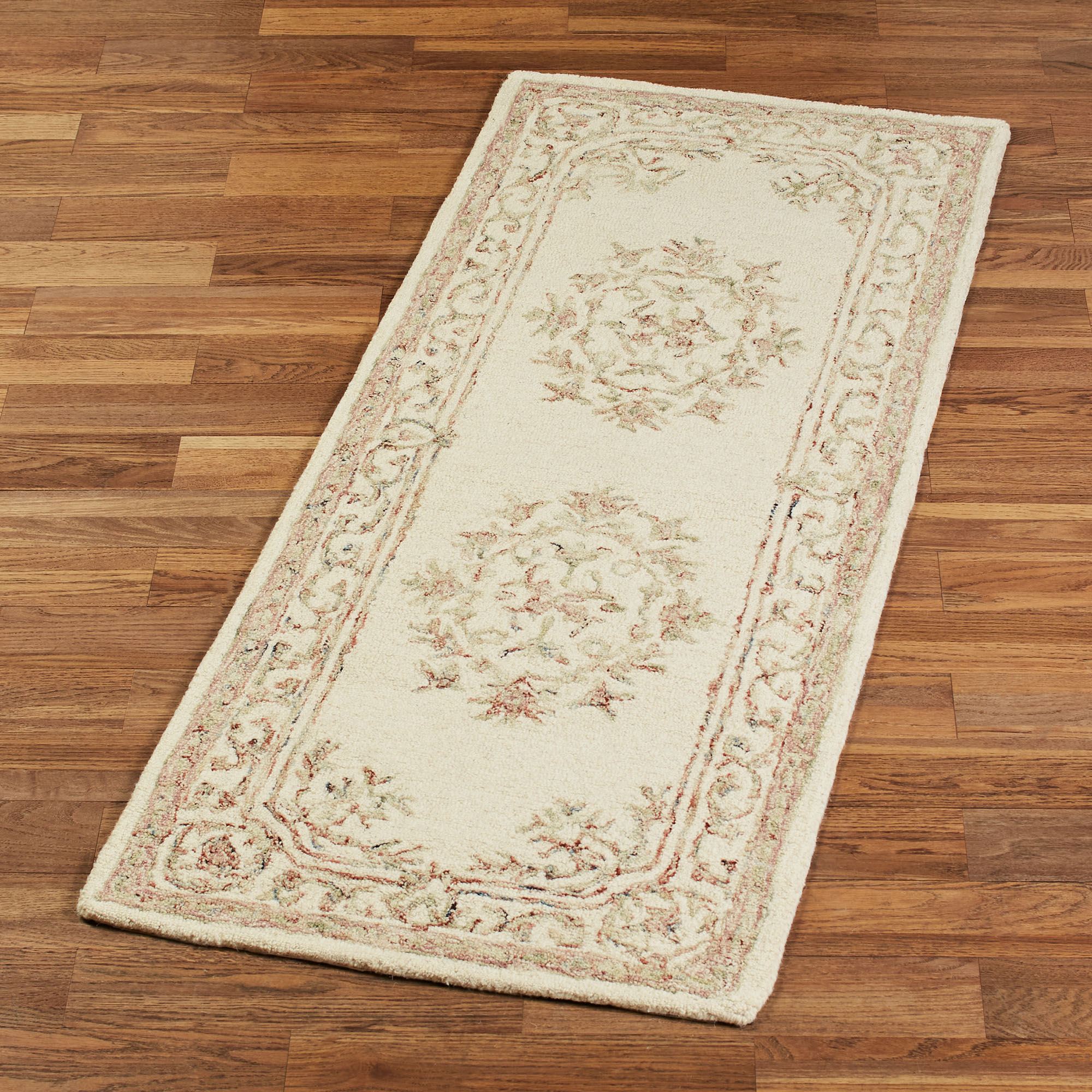 Serenade your space with the subtle symphony of color found within this handcrafted rug. Hand-tufted from wool, the .5" thick floorcovering features an ivory ground filled with classical floral and leaf medallions, scrollwork, and elaborate borders. Pastel shades of pink, green, blue, and beige enliven the neutral design. Backing is cloth-covered latex. We recommend professional cleaning by a rug cleaner. Imported.