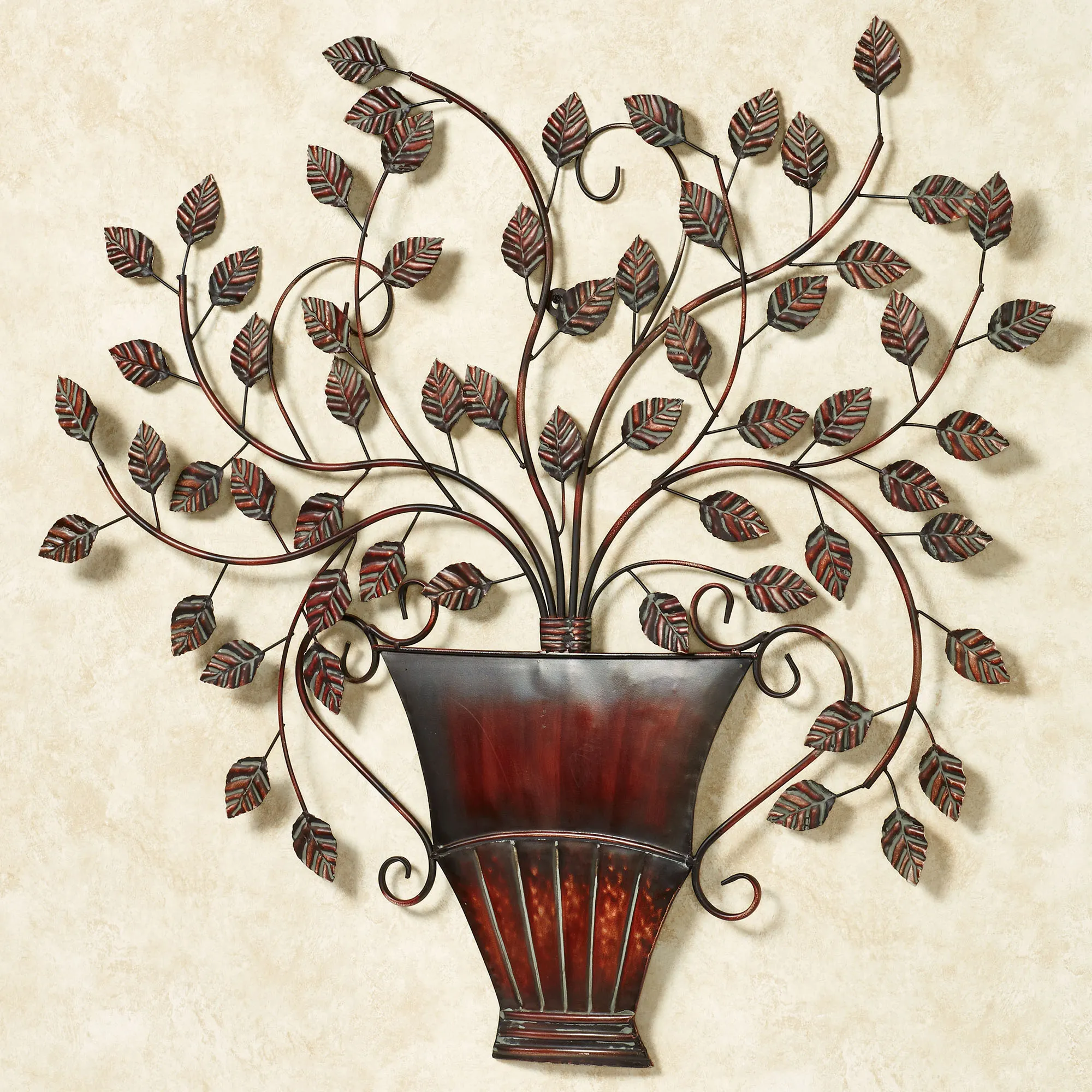 Serene Boughs Wall Sculpture features leafy vining branches spilling over an ornamental urn with a decorative fluted bottom and scrolling handles. Metal wall sculpture is available in two finishes with a slight verdi wash. Measures approx. 27"x28".