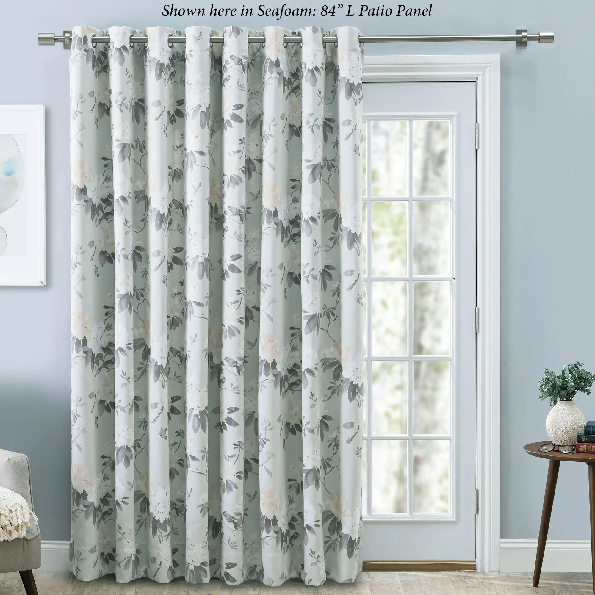 Meditate with the beautiful flow of nature in the Serene Garden. This room darkening, polyester patio panel features an all-over floral pattern accented with butterflies. The patio panel is lined with a room darkening woven liner to reduce light, save energy, and create a barrier from drafts. Metal grommets, 1.5" dia., have a matte silver finish. Patio panel is 104"Wx84"L and includes a drawing wand that can be attached to either side. Machine washable. Imported.