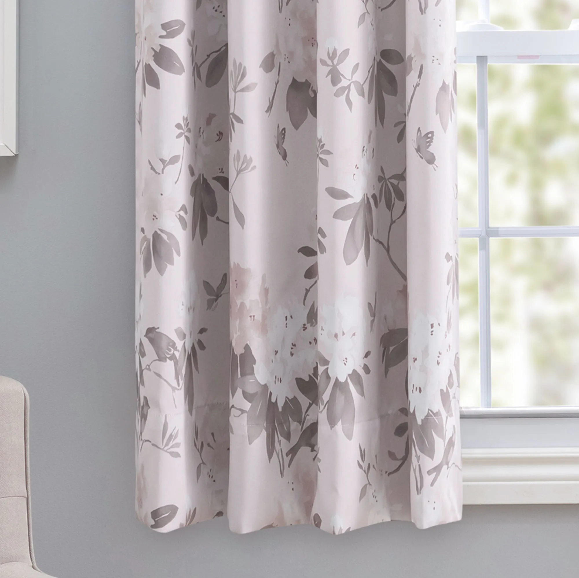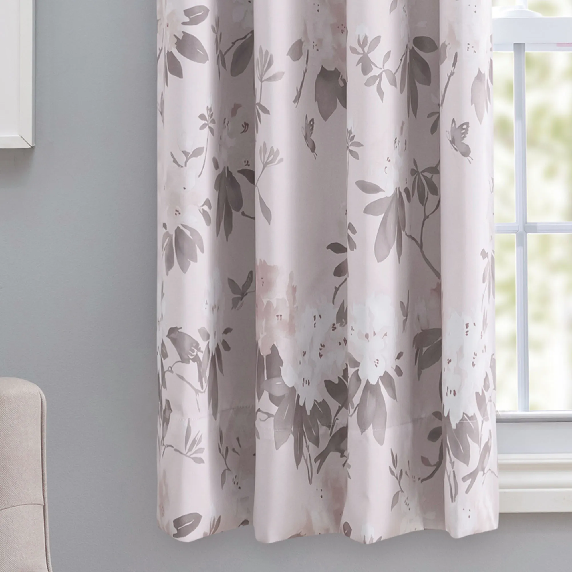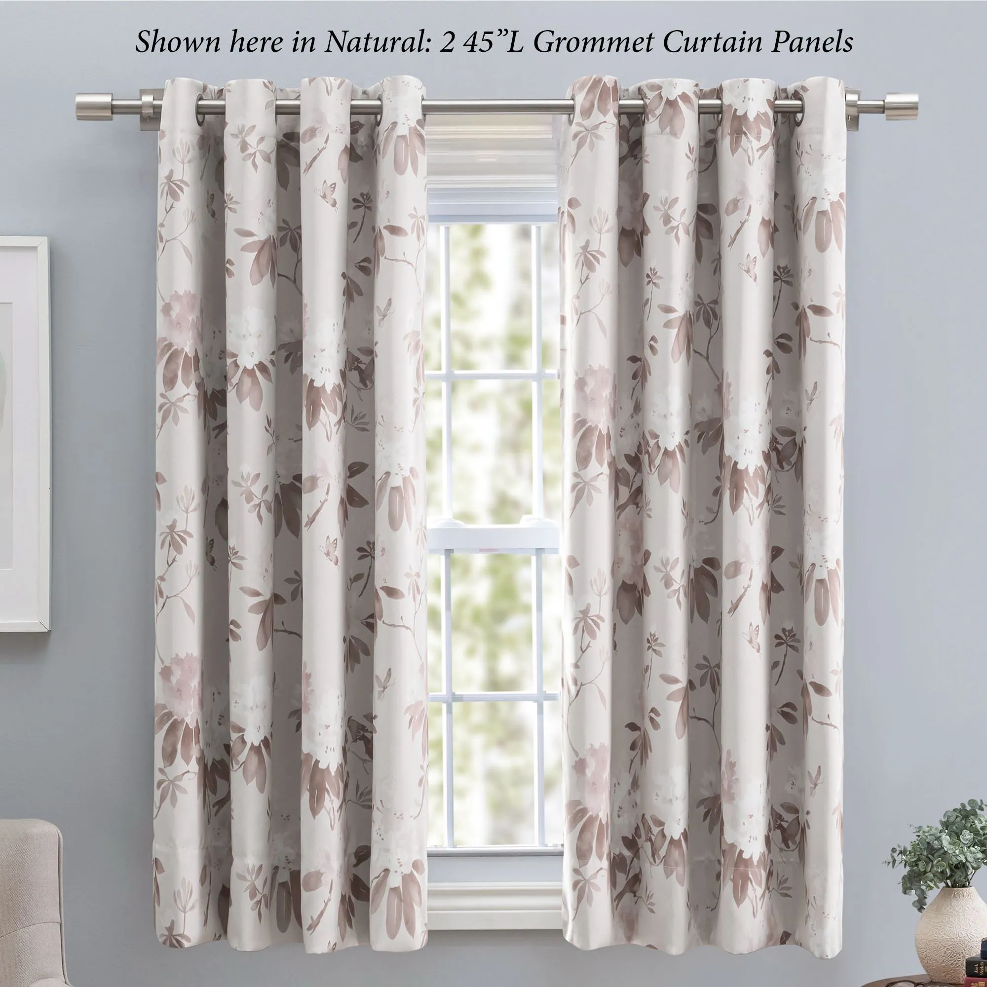 Meditate with the beautiful flow of nature in the Serene Garden. This room darkening, polyester window treatment features an all-over floral pattern accented with butterflies. Each curtain panel is lined with a room darkening woven liner to reduce light, save energy, and create a barrier from drafts. Metal grommets, 1.5" dia., have a matte silver finish. Curtain panel, 52"W, is sold individually. The 36"L, 45"L, and 54"L short curtain panels all have a drawing wand that can be attached to either side. Machine washable. Imported.