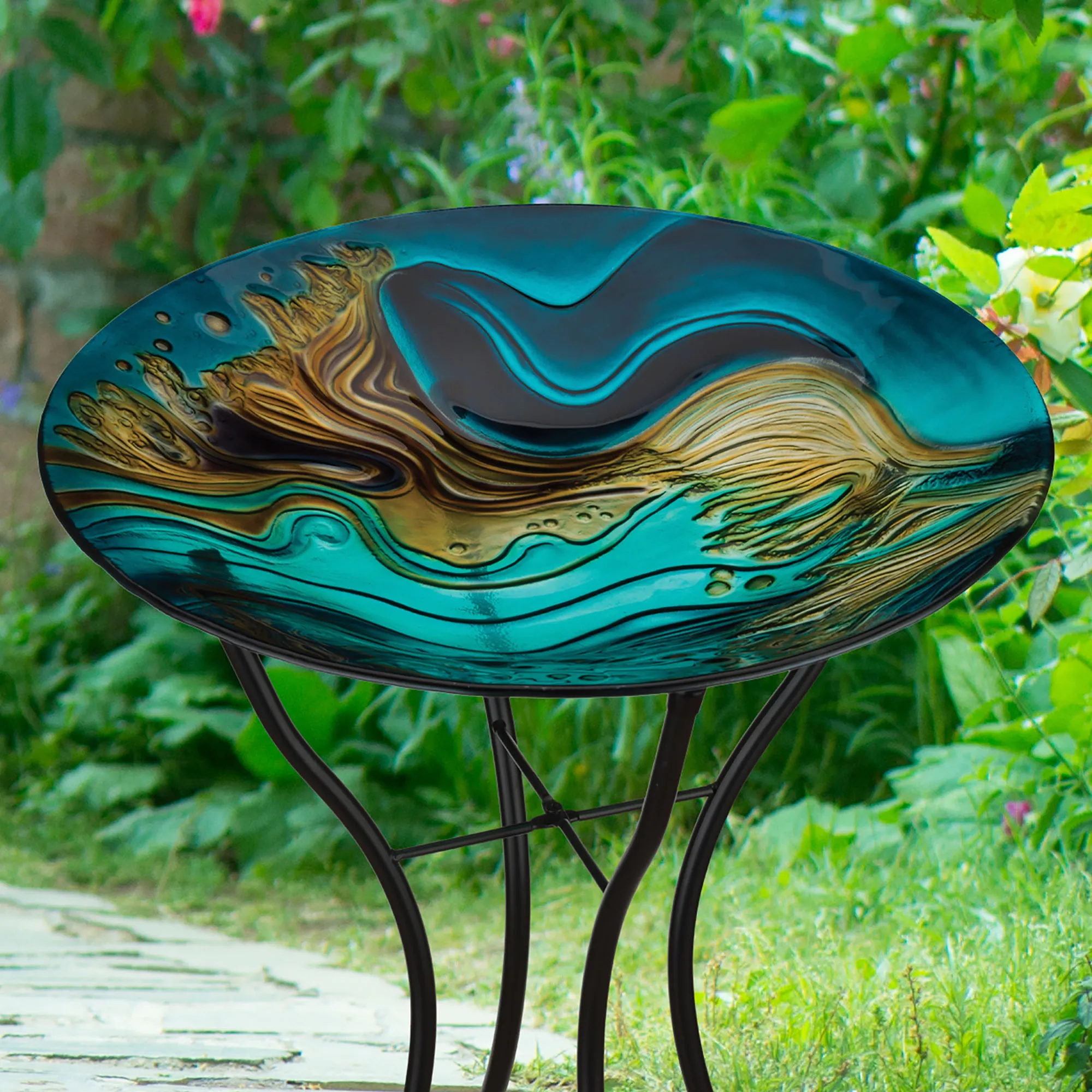 Birds will love the look of the Serene Harmony Birdbath with Stand. The large, textured molded art glass bowl is .25" thick and includes weather- and fade-resistant painted shades of green, blue, and brown. The bowl may also be used as a feeder and has non-slip rubber pads. The sturdy metal stand is black. May be used outdoors seasonally; do not expose this item to freezing temperatures. Measures 18"dia.x23"H.