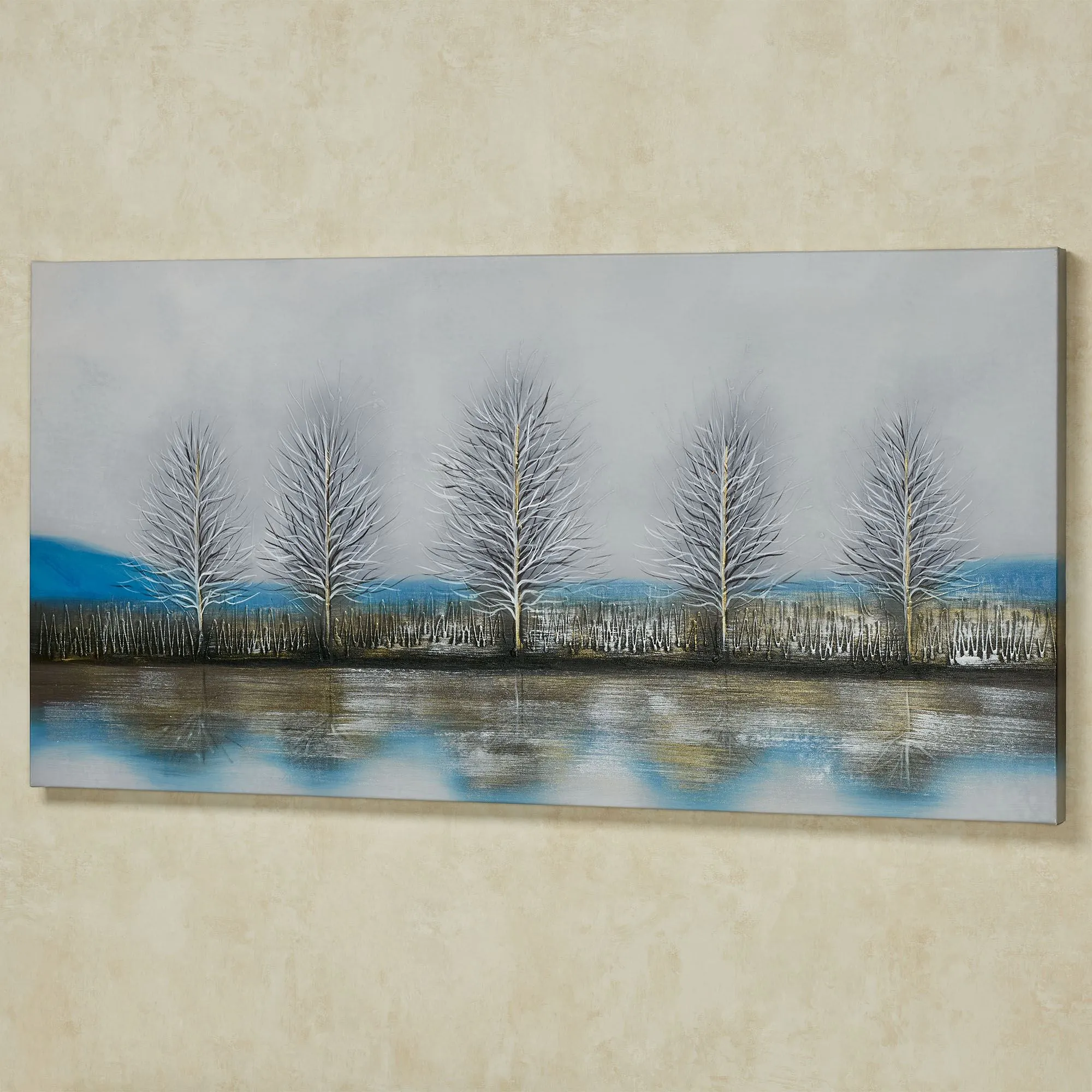 Bask in the beauty of a Serene Morning as a pale winter sun rises. Gallery-wrapped over a wood frame, the handpainted oil on canvas features five barren trees reflected in the lake's surface on a crisp, frosty morning. Cool shades of blue, white, gold, and silver add a brisk air. Due to the handpainted nature of this item, minor variations may occur. Measures 48"Wx1.5"Dx24"H.