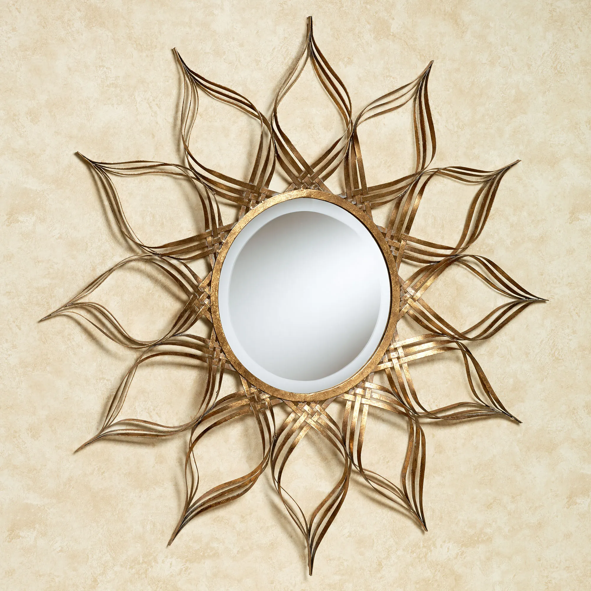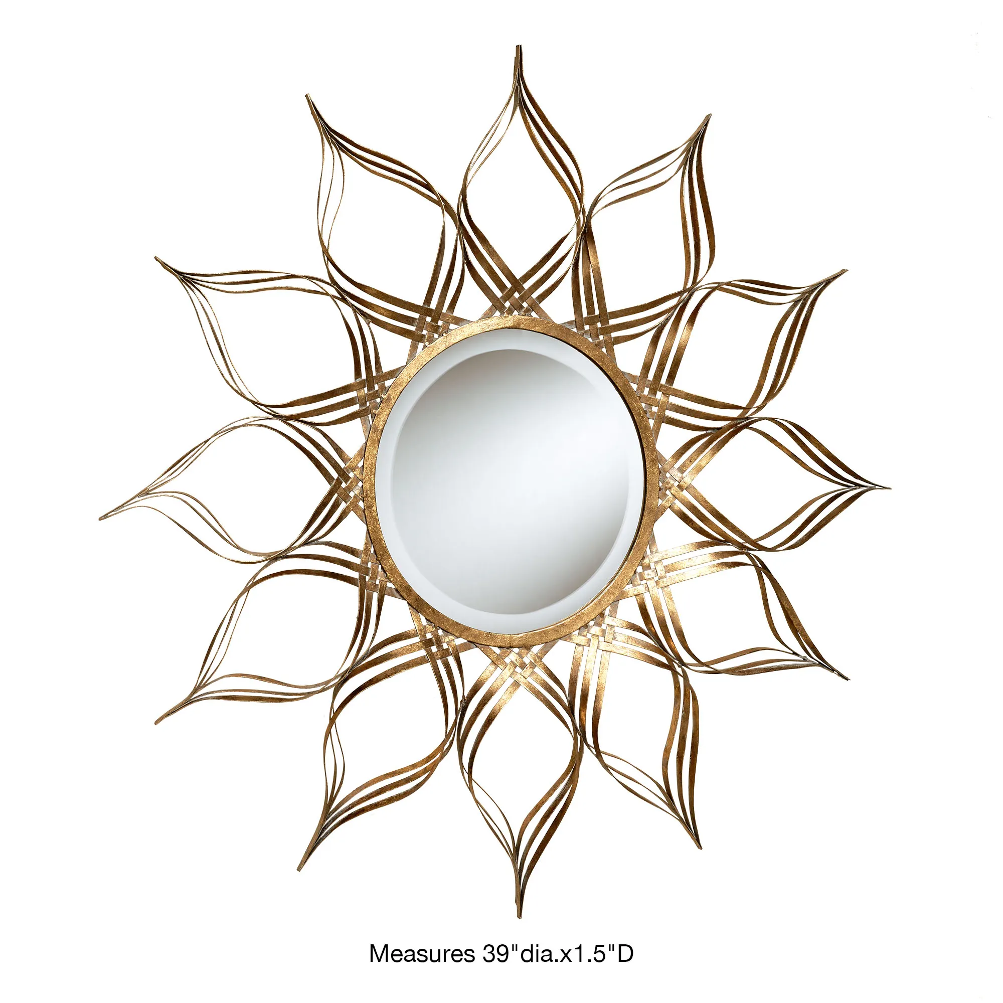 Resembling a magnificent open bloom, the Serenity Blossom Mirrored Metal Wall Sculpture shines a touch of brilliance upon your home. Surrounding a center beveled glass mirror, the handcrafted frame features strips of metal interwoven and then looped to form fantastic petal-like rays hand-finished in antique gold with a gray wash. Measures 39"dia.x1.5"D.