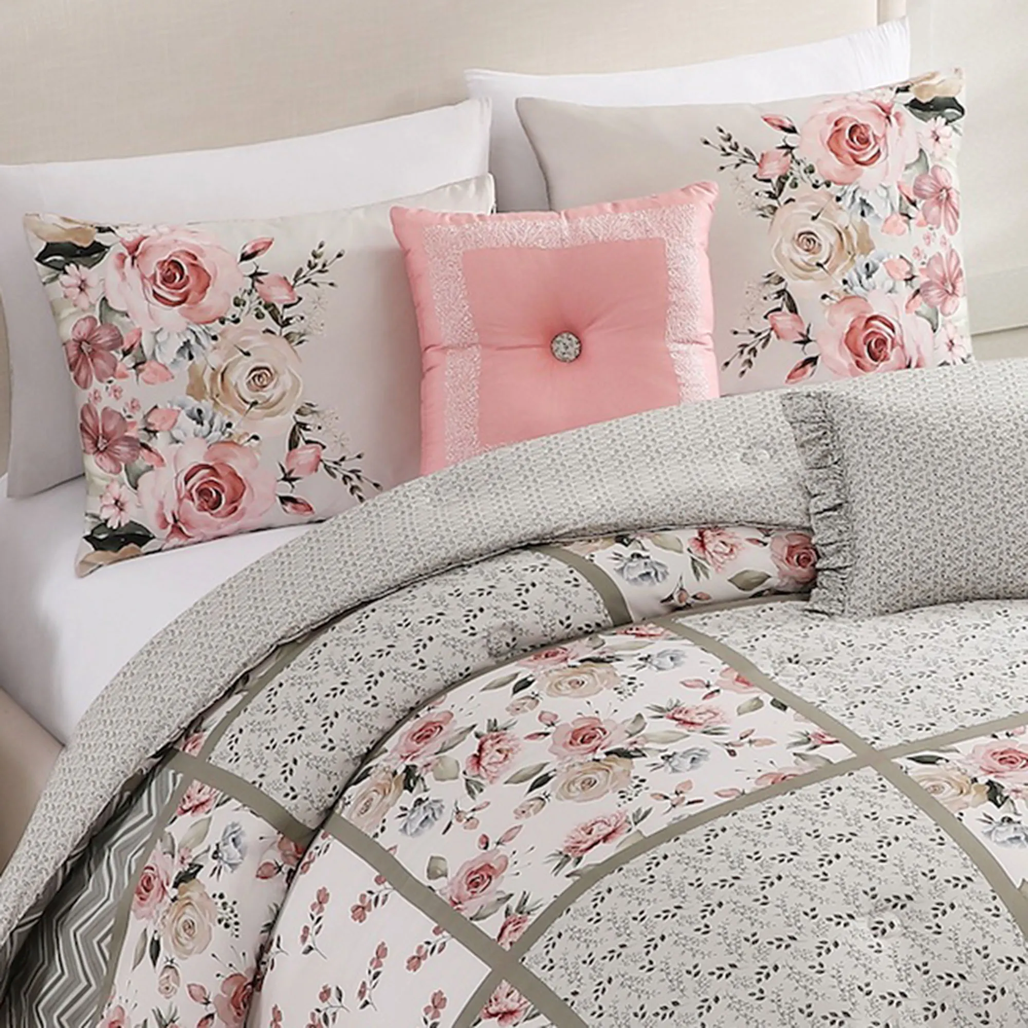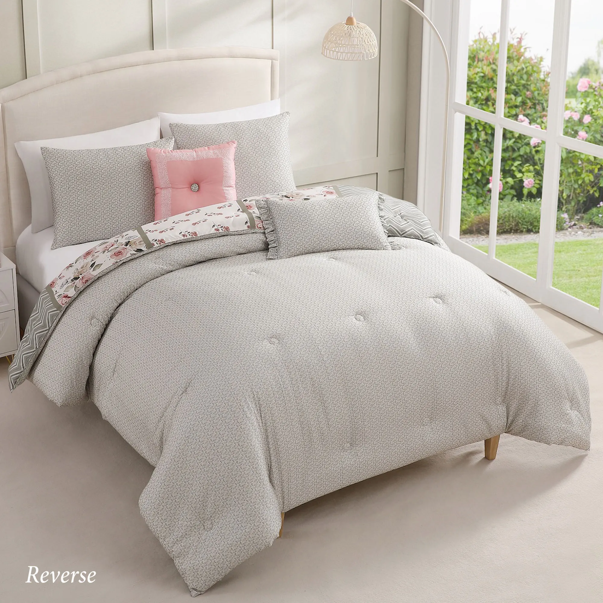 • Shams have florals on ivory