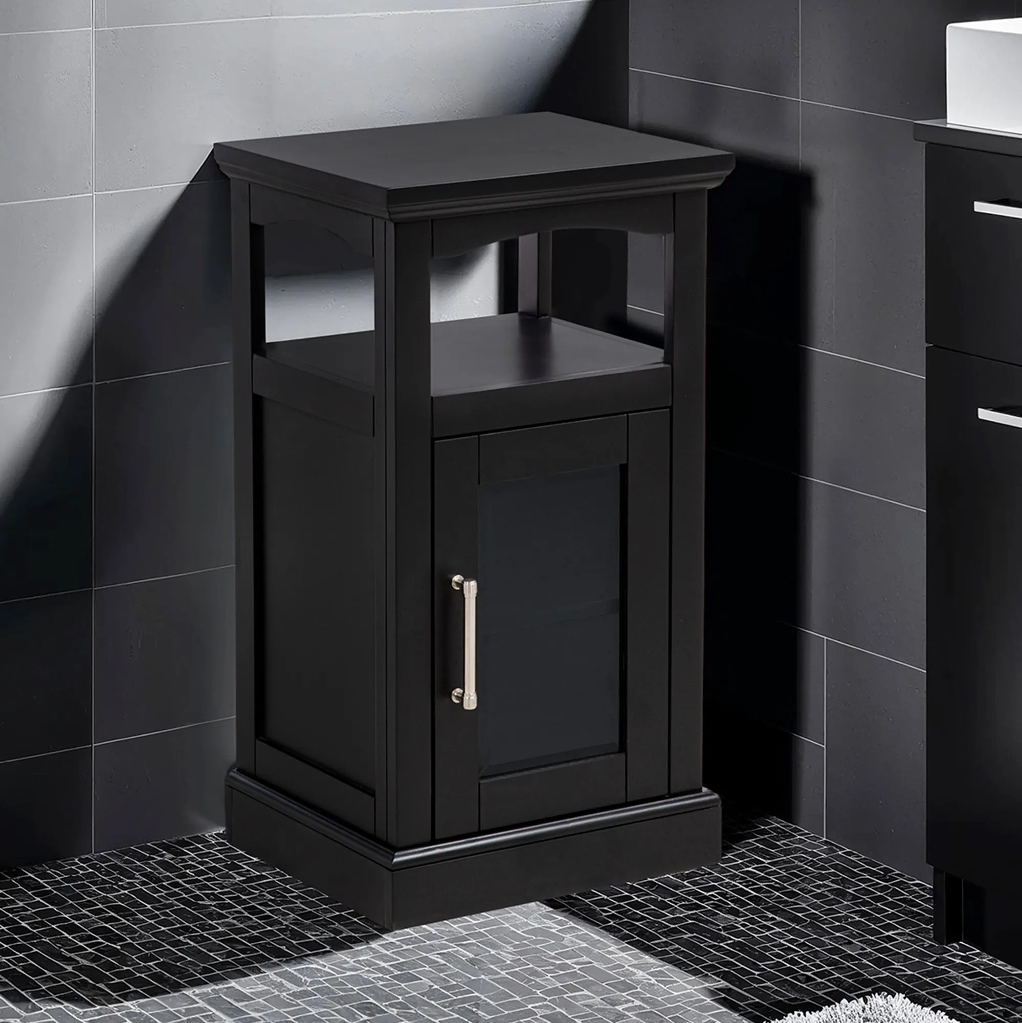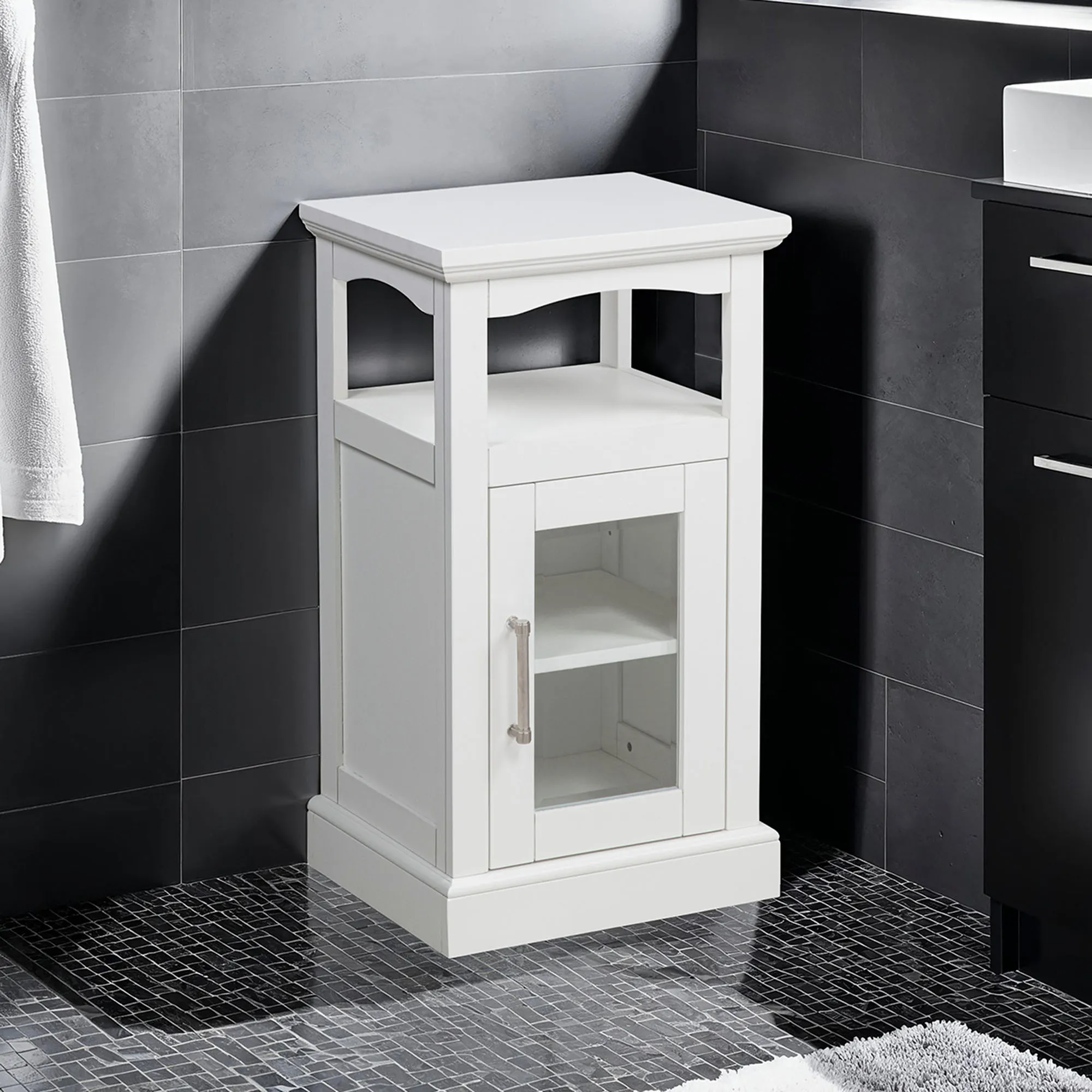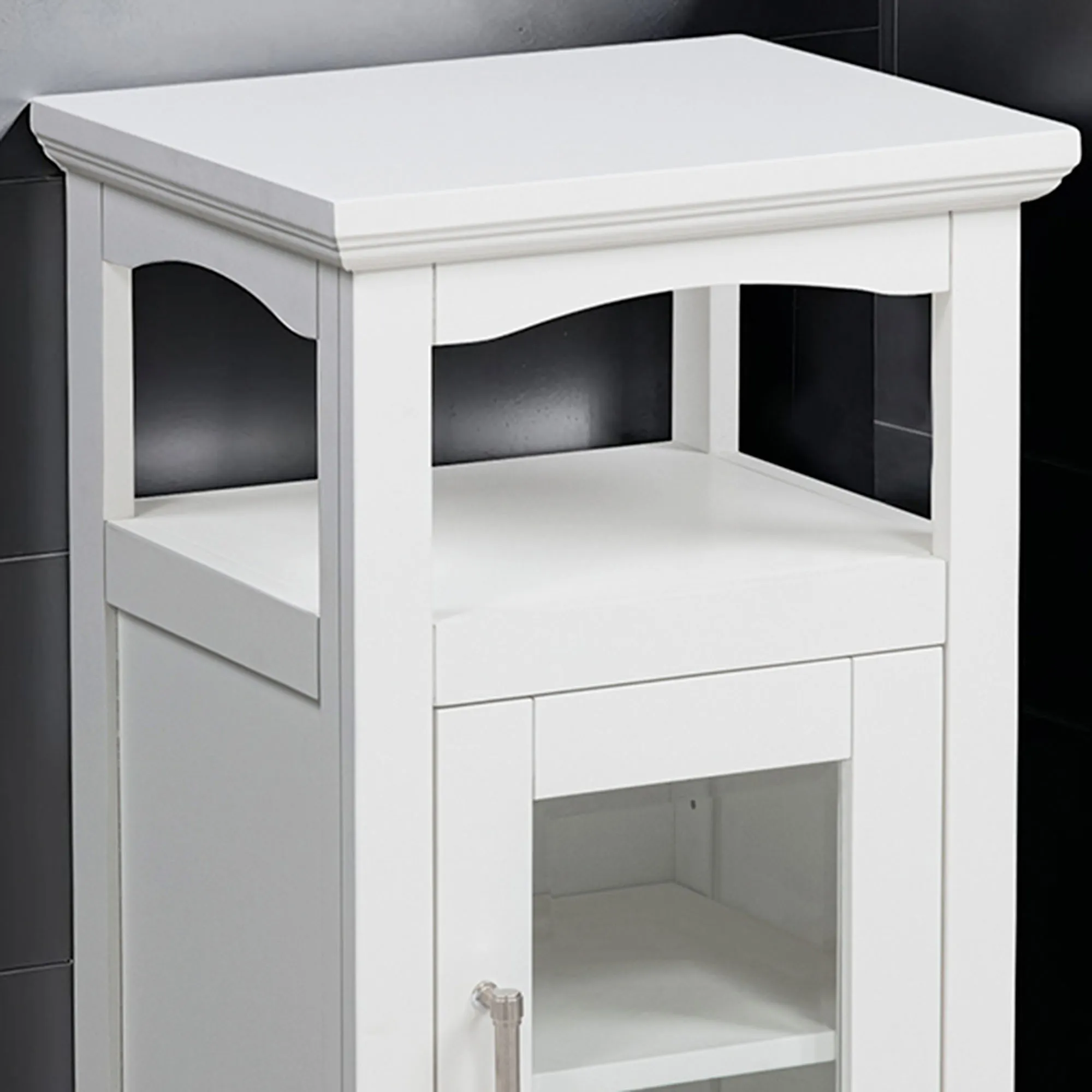 The Serenity Demi Cabinet provides sleek, modern storage. With beveled detailing, the wooden cabinet features a display top, openwork shelf, and lower cabinet. The lower cabinet has shelves behind a clear tempered glass door with a chrome metal handle. Each shelf is 13"Wx11.5"D. Each shelf holds 30 lbs. maximum. Perfect for ample storage in smaller spaces, the cabinet measures 16"Wx13.5"Dx29"H overall and weighs approx. 28 lbs.