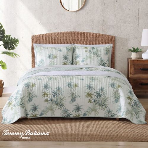 The Serenity Palms Quilt provides a calming ambiance and tropical beauty. This pre-washed cotton quilt, from Tommy Bahama, features all-over printed palm trees and leaves in shades of green and blue on ivory. Quilt has channel quilting, bound ends, and a backing with a jagged blue design on ivory. Fill is cotton/polyester. Machine washable. Imported.