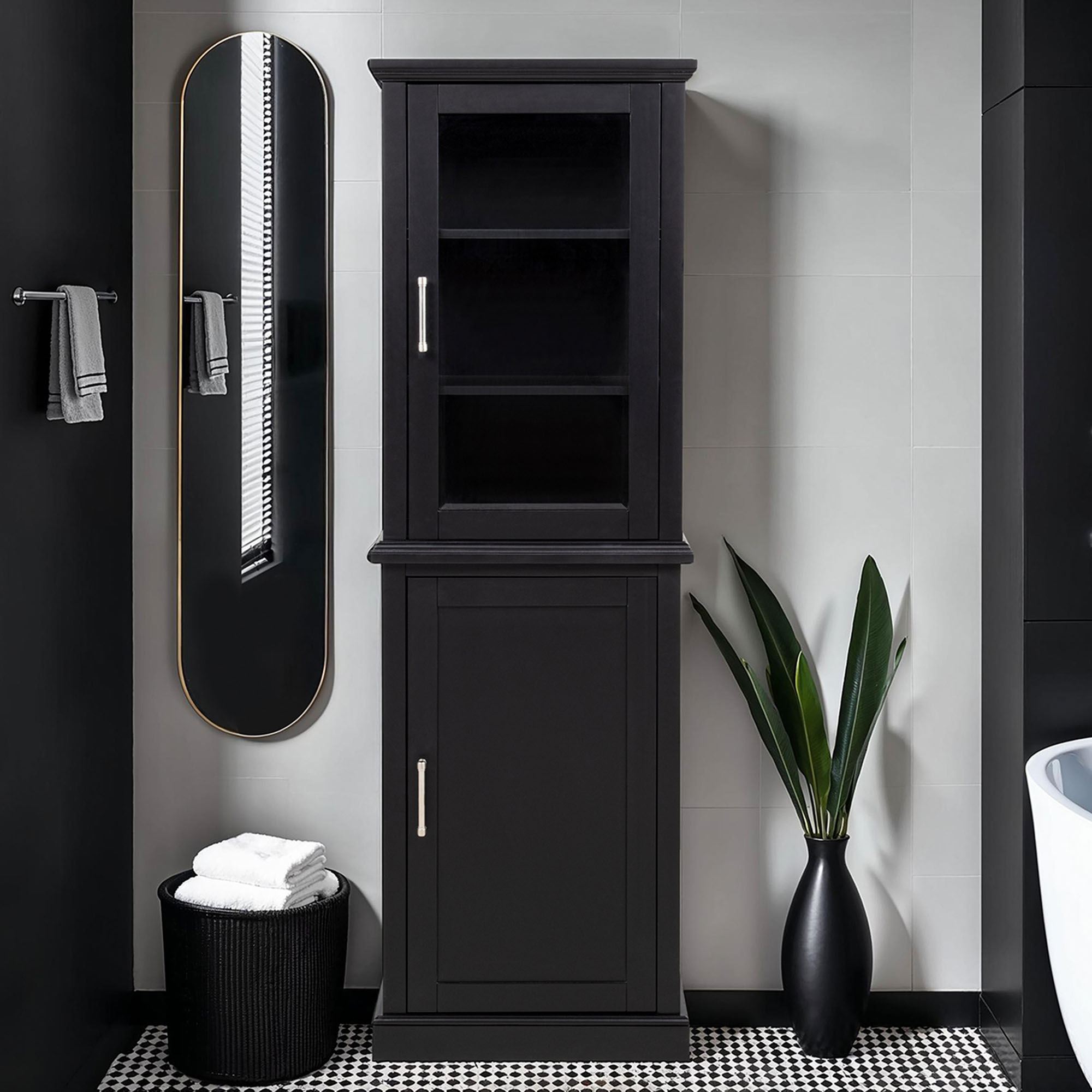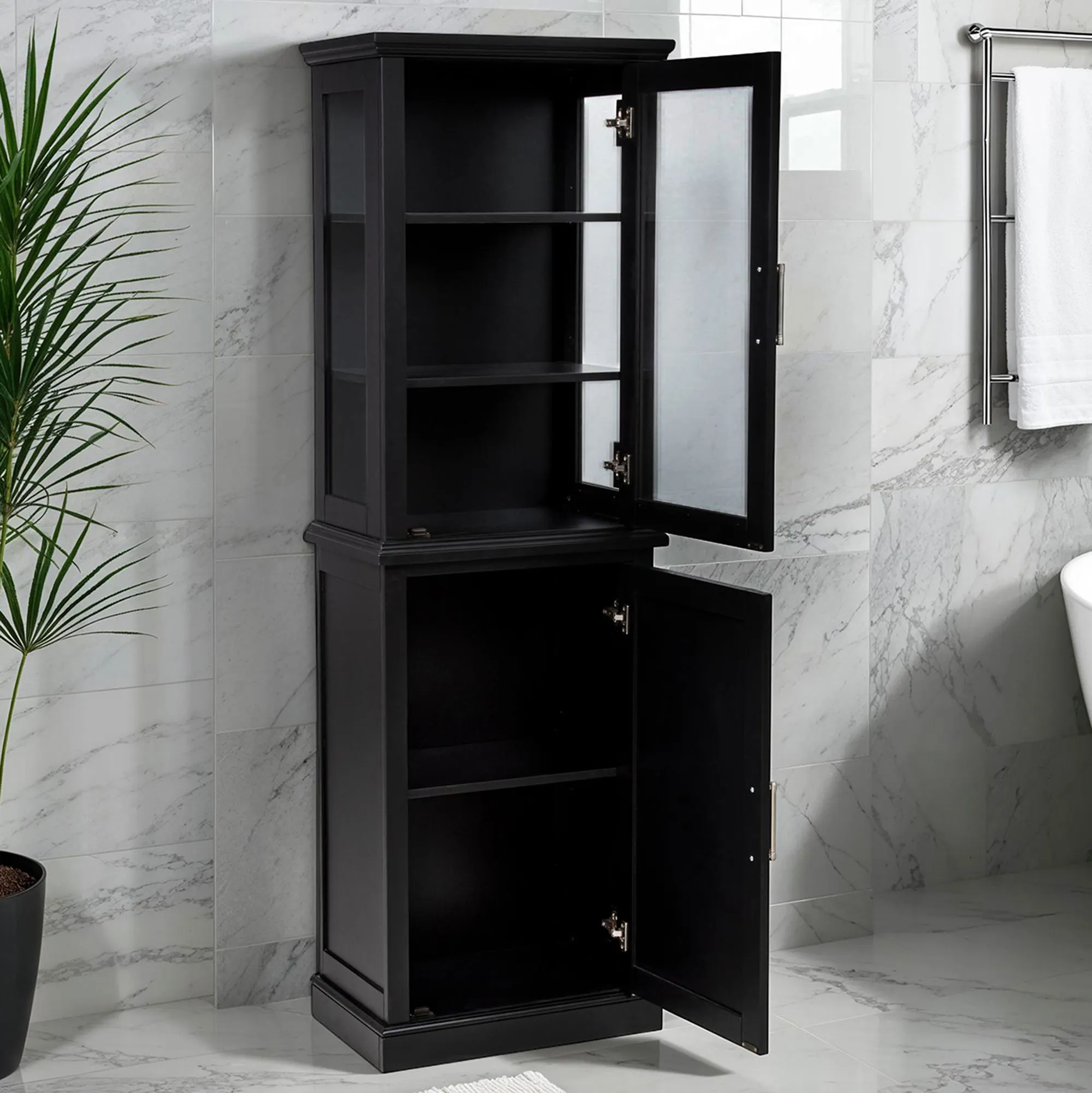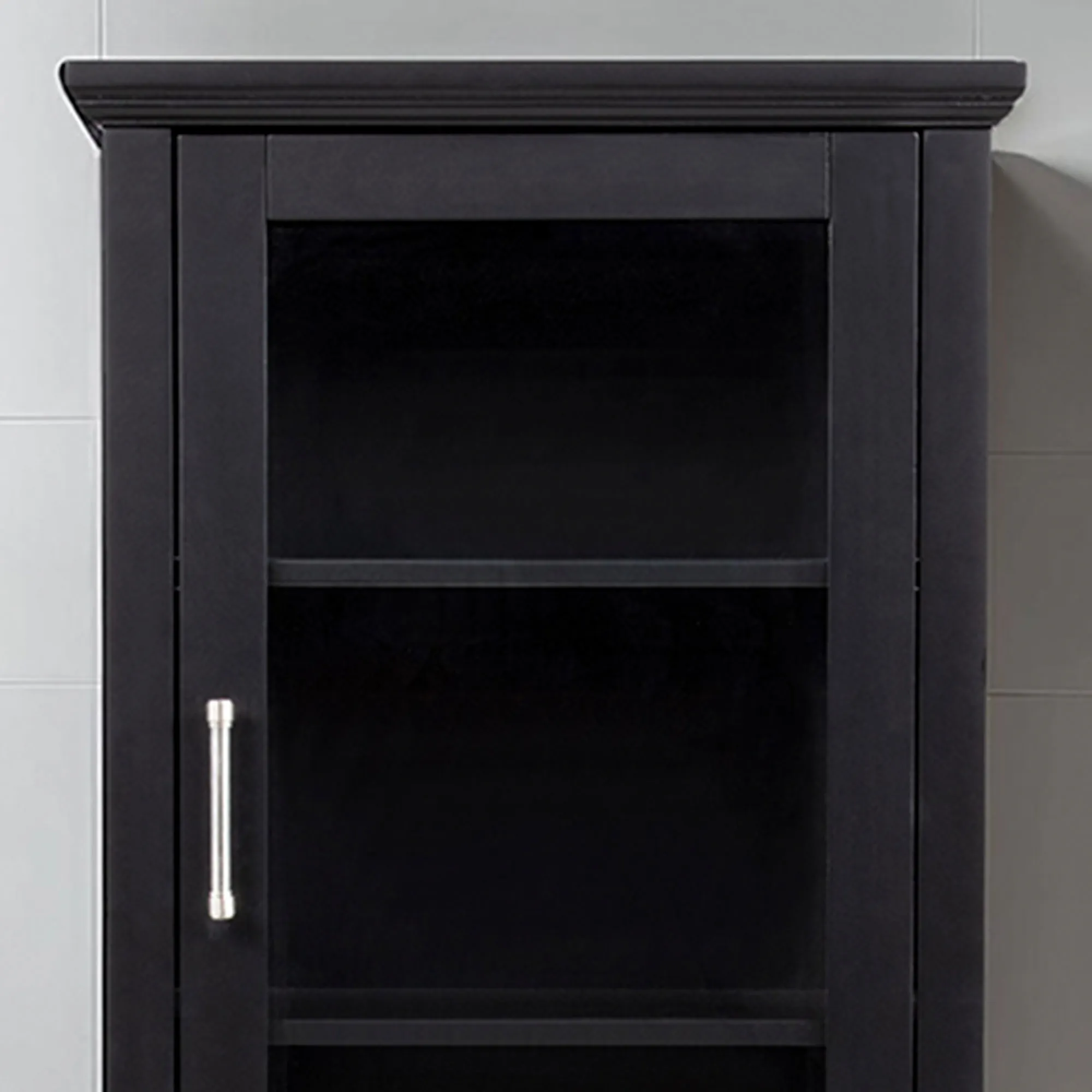 The Serenity Storage Cabinet provides a sleek, modern storage option. With beveled detailing, the wooden furnishing features a stacked, tiered design perfect for displaying or storing your items away. The lower cabinet features two fixed shelves behind a solid door. The upper cabinet has three fixed shelves, clear tempered glass sides, and a clear tempered glass door. A brushed chrome metal handle adorns each door. Each shelf measures 18.5"Wx11.5"D and holds up to 30 lbs. Overall, the storage cabinet measures 21.5"Wx13"Dx68.5"H and weighs approx. 77 lbs.