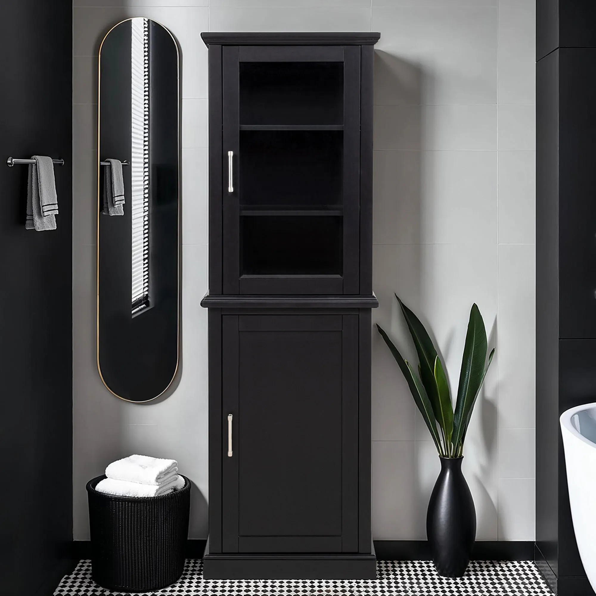 The Serenity Storage Cabinet is wooden, glass, and metal.