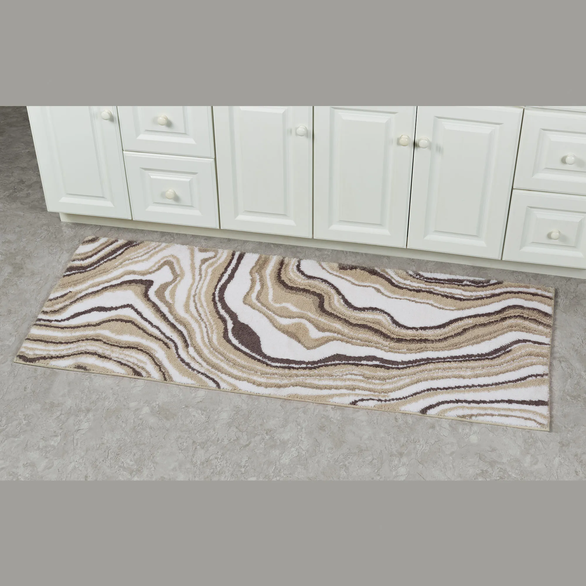 Serpentine marbled hues add intrigue to this super-soft bath rug. With a cushioned feel, the .5" thick rug features a micro denier polyester face backed in a thick gel foam latex that creates a nonslip, skid-resistant surface. Beige and light taupe colors combine with off-white and dark gray to create an abstract marbled design. Rectangle Rug is available in two sizes. Runner is 24"x60" (2'x5'). One-year limited manufacturer defects warranty. Machine washable. Imported.