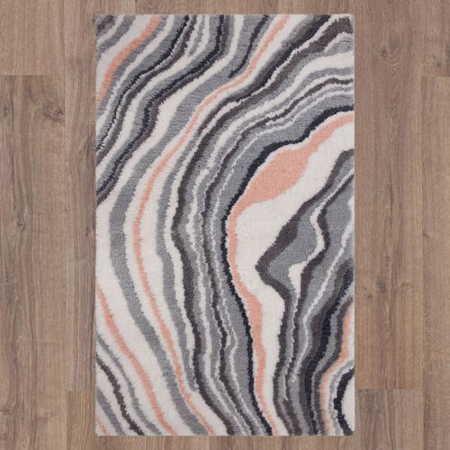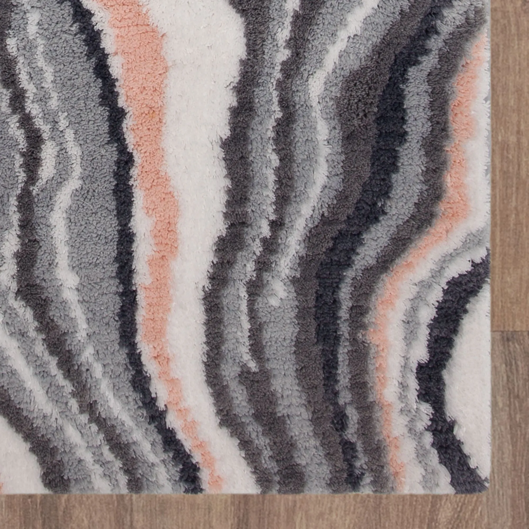 Serpentine marbled hues add intrigue to this super-soft bath rug. With a cushioned feel, the .5" thick rug features a micro denier polyester face backed in a thick gel foam latex that creates a nonslip, skid-resistant surface. Coral pink and charcoal colors combine with off-white and dark gray to create an abstract marbled design. Rectangle Rug is available in two sizes. Runner is 24"x60" (2'x5'). One-year limited manufacturer defects warranty. Machine washable. Imported.