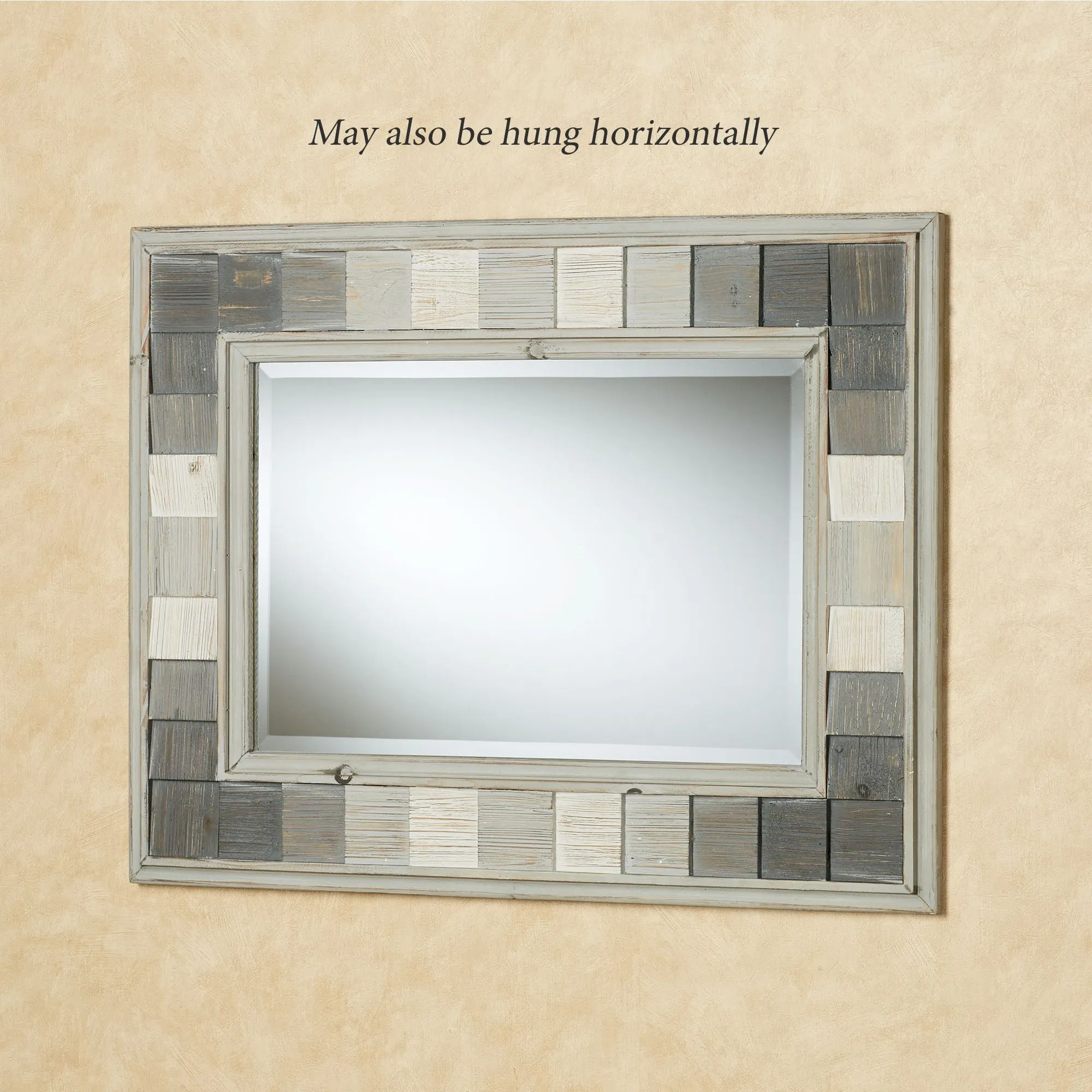 Chic Shades of Gray color this wall mirror with dynamic style. With a rustic, distressed palette, the wood frame features a layered plank design and a center beveled glass mirror. Mirror may hang vertically or horizontally. Overall, the wall mirror measures 26"Wx1.5"Dx34"H and weighs 15 lbs.