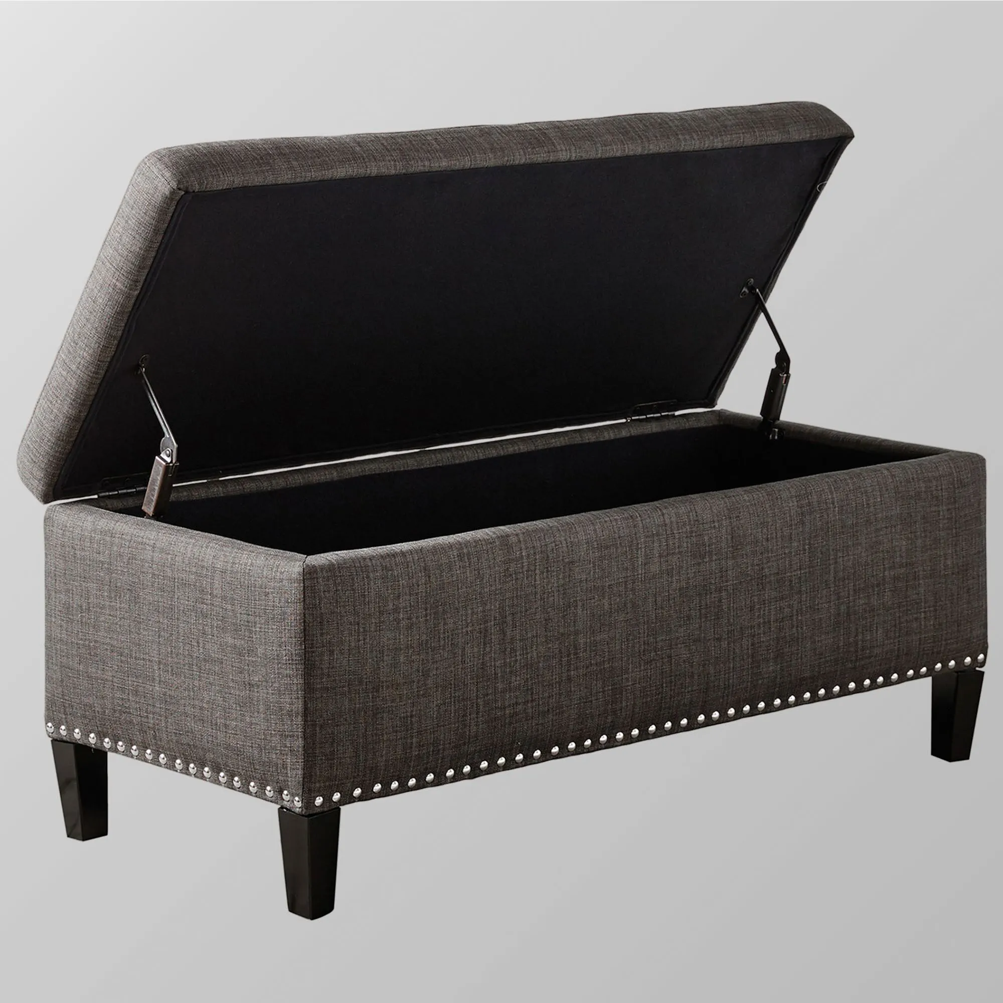 The Shandra II Storage Bench provides a charming storage and sitting space. Accented with metal nailhead trim, the polyester linen upholstered bench features a button-tufted, polyurethane foam-filled top that opens on easy-close hinges to reveal 38"Wx13.5"Dx9.5"H of space. Solid birch wood legs complete the bench. Gray has black legs and silver nailheads. Light Taupe has reclaimed natural wood-hued legs and copper nailheads. Overall, the storage bench measures 42"Wx18"Dx18"H and weighs approx. 26 lbs. Spot clean the fabric.