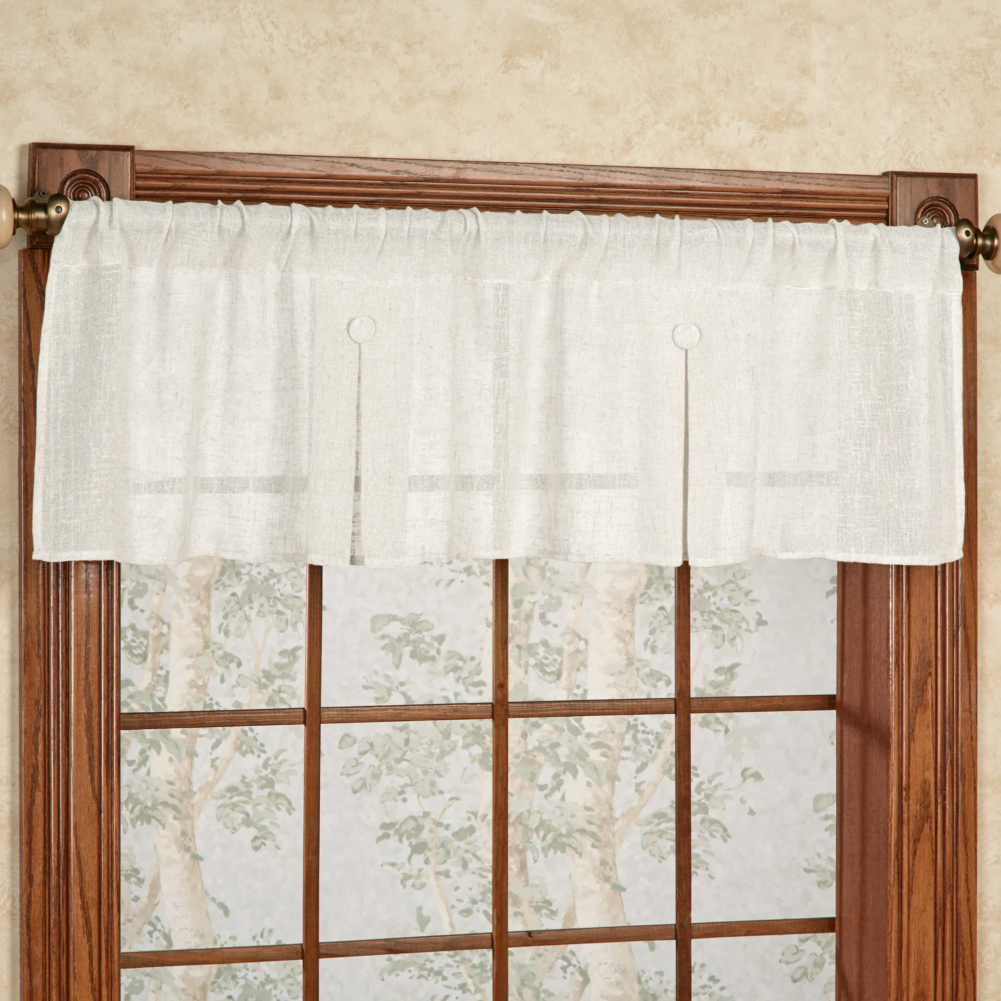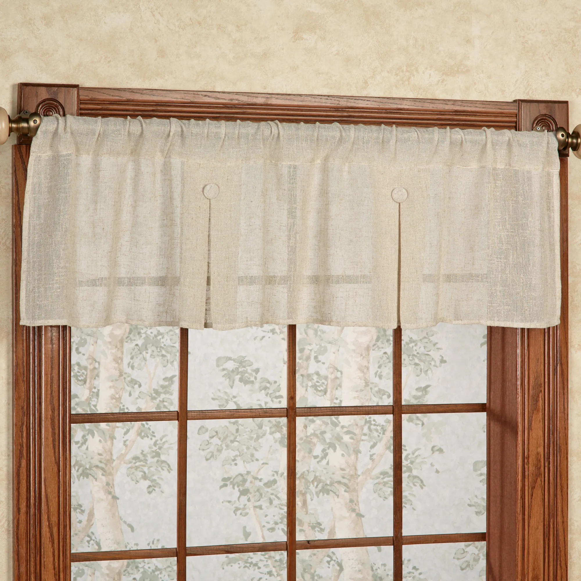 The polyester/linen Shannon Semi-Sheer Box-Pleated Valance will be the perfect complement to your decor. This pre-washed, solid color, semi-sheer window valance has a woven, linen-like texture. Box-pleated valance has two pleats in the center, accented with coordinating fabric-covered buttons. Valance has a 3" rod pocket and measures 52"Wx15"L. Machine wash. Imported.
