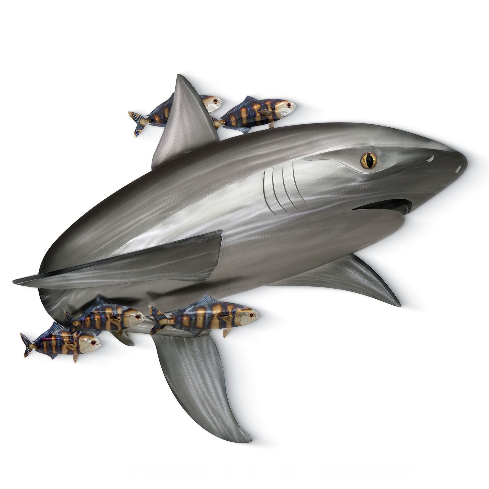 Be sure to navigate the ocean with the Shark and Friends by your side. Handcrafted of stainless steel, this wall sculpture, by M. Malizia, features a silver shark and a school of pilot fish. Wall art is hand-grinded, hand-flamed, and hand-dyed. Indoor or covered outdoor use. Shark wall sculpture measures 38"Wx4.5"Dx31"H.