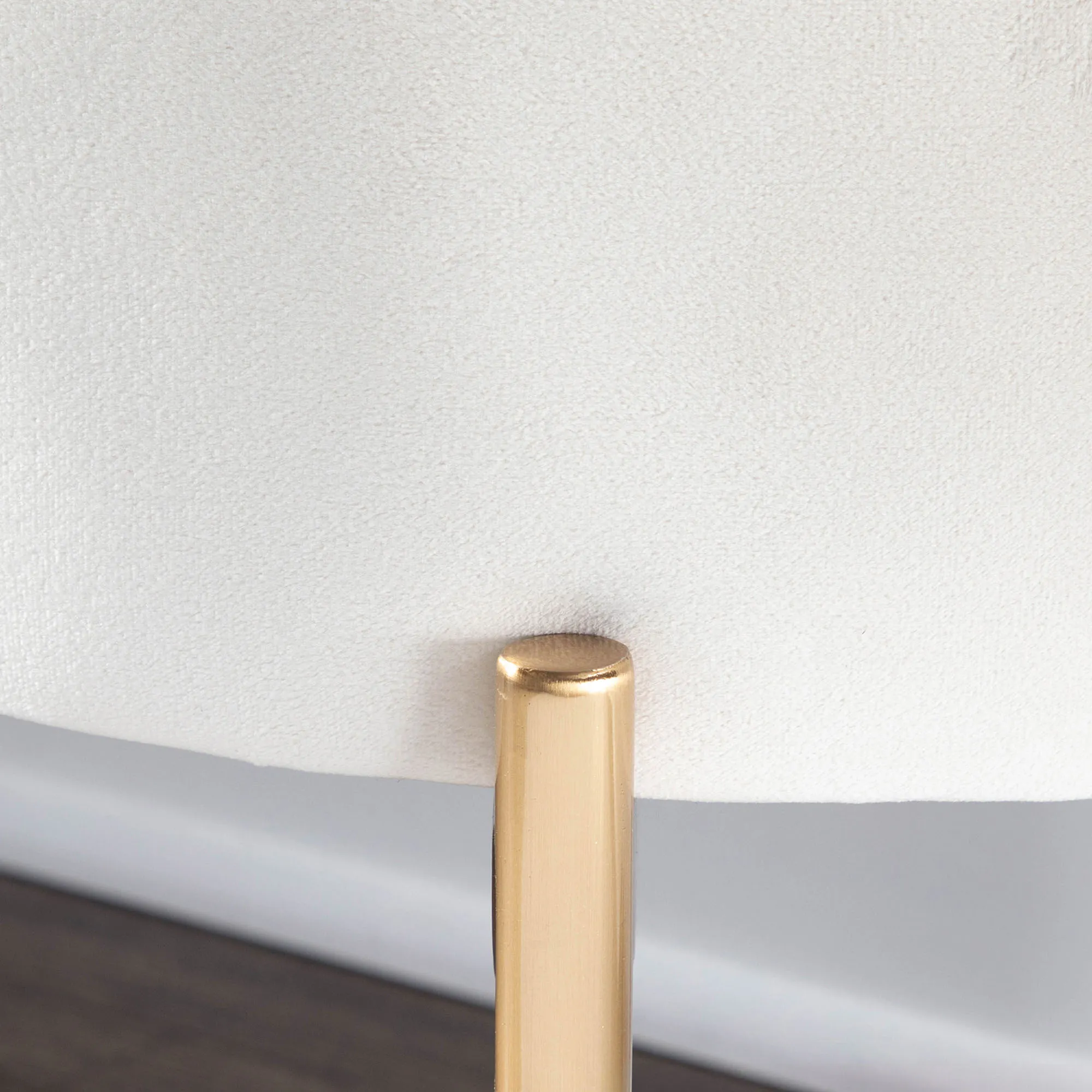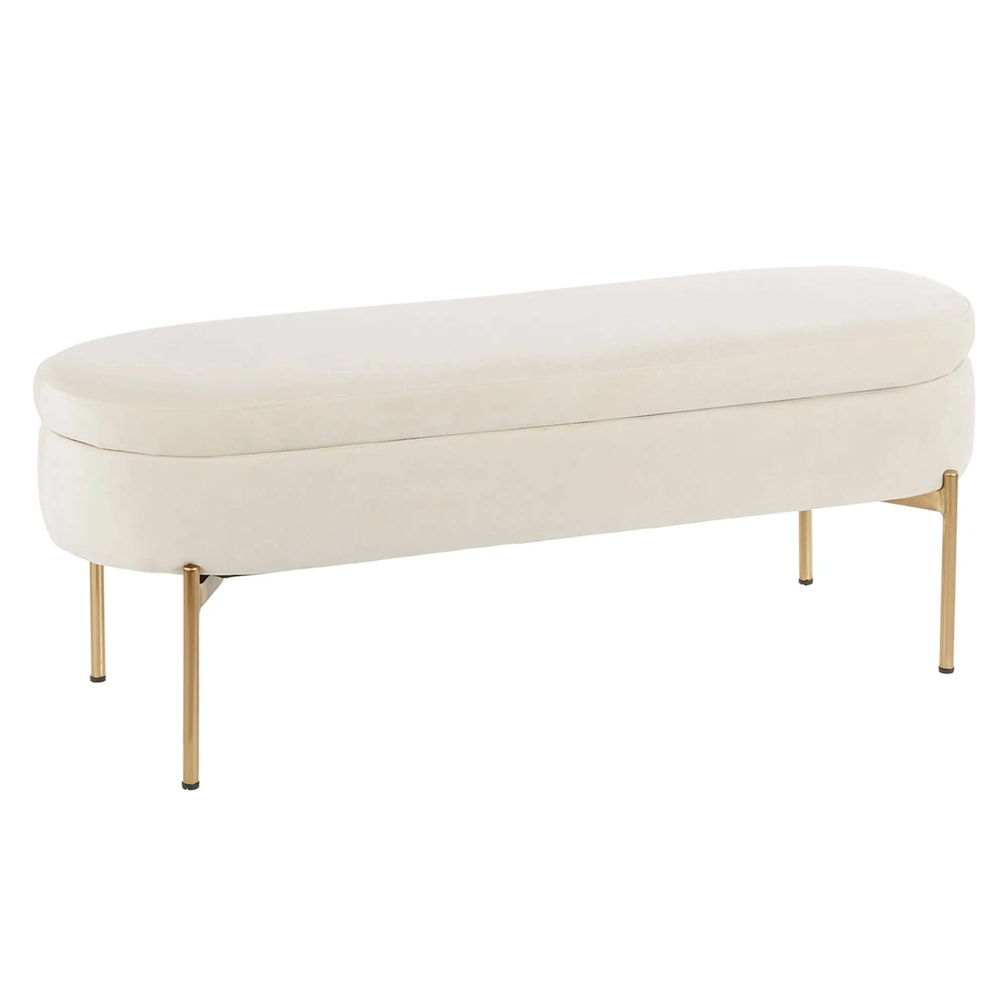 The Shea Storage Bench provides a chic, stylish storage and seating solution. In soothing solid off-white hue, the velvet upholstered design features a long rounded shape on gold-finished straight metal legs. The foam-cushioned lid flips up to reveal a roomy, lined storage area measuring 46"Wx15"Dx7"H. Maximum recommended weight is 500 lbs. Overall, the storage bench measures 48"Wx17"Dx18.5"H and weighs approx. 28 lbs. Spot clean the fabric.
