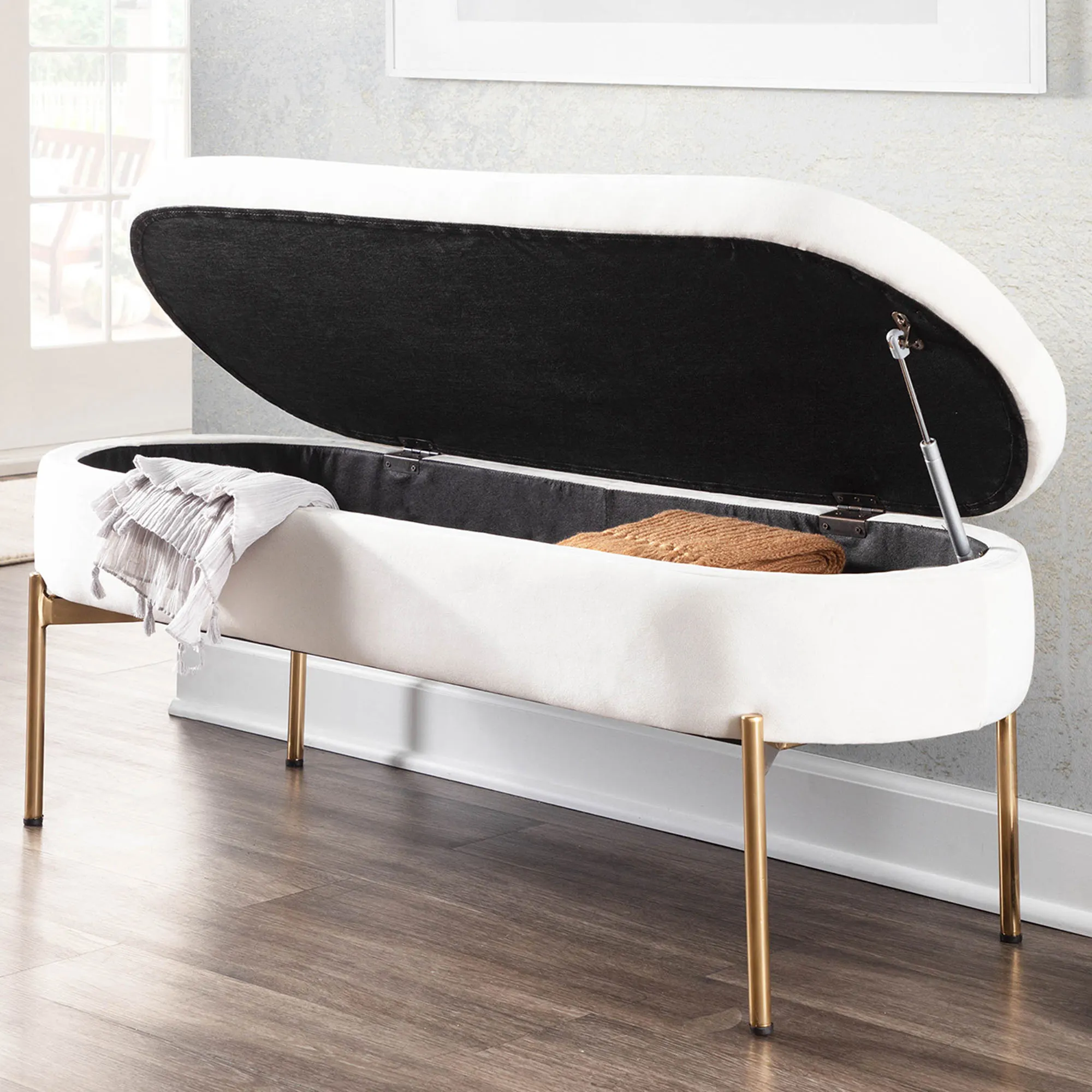 Shea 4 Foot Wide Off White Velvet Upholstered Oval Storage Bench