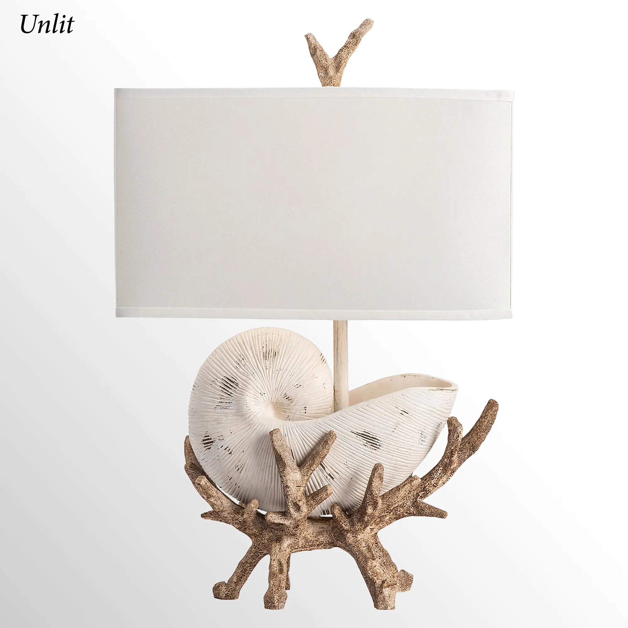 The Shell and Driftwood Table Lamp resembles a unique sculpture of beachcombing treasures. Cast from resin, the table lamp features a distressed antique ivory nautilus seashell nestled among a driftwood-like branch base. A 2"H driftwood finial and bright white linen rectangular shade complete the coastal table lamp. UL listed. Requires one 150W max. bulb. Overall, the table lamp measures 19"Wx10.5"Dx29"H and weighs approx. 13 lbs.