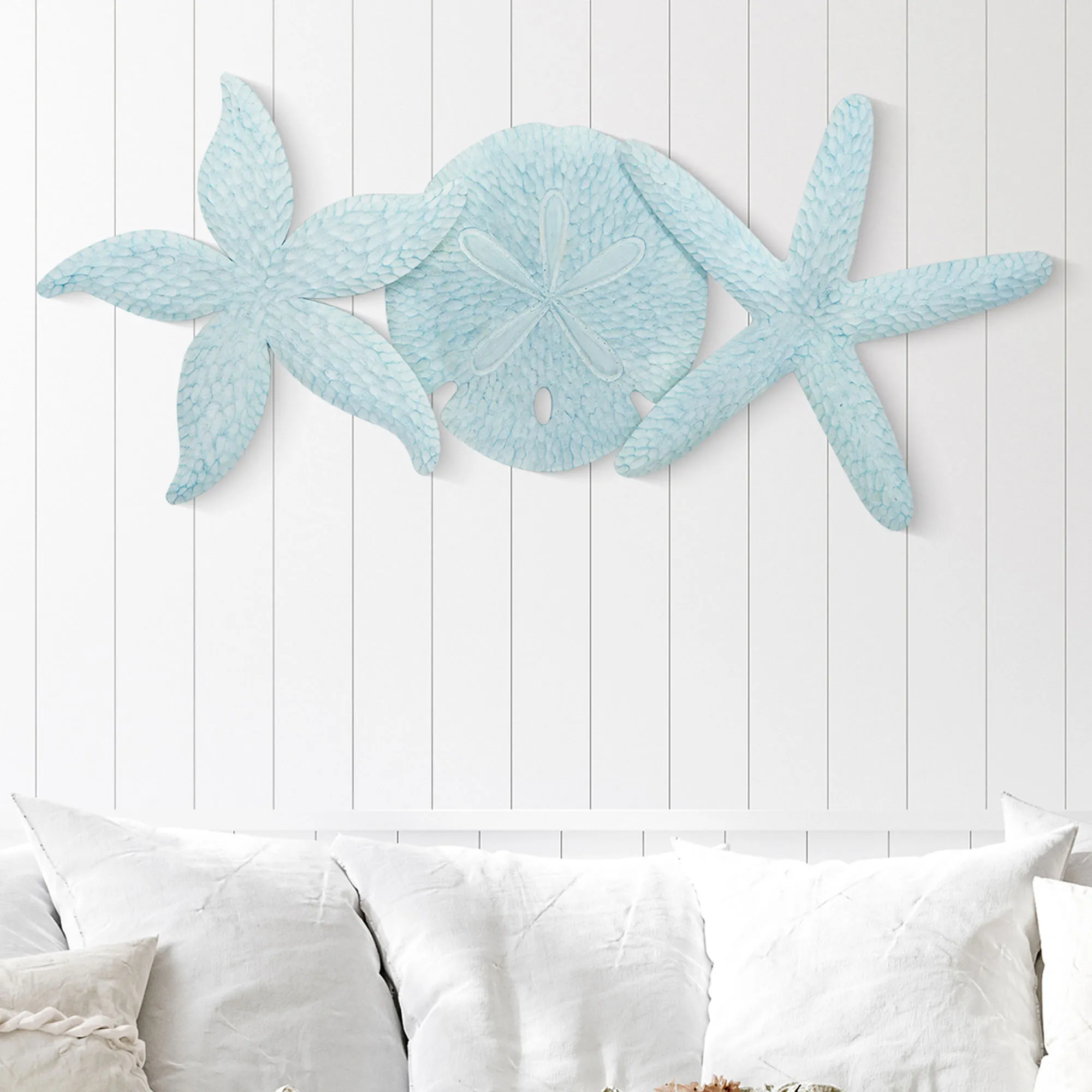 Pristine coastal treasures can be found along the Shell Cove. Designed by artist Joanne Ferrara, the handcarved wood wall sculpture features a sand dollar and two starfish with a hand-finished color-washed design. Due to the handcrafted nature of this item, minor variations in size and color may occur. Perfect for your indoor space, covered porch, or enclosed patio, the coastal wall art measures 51"Wx3"Dx23"H and weighs approx. 15 lbs.