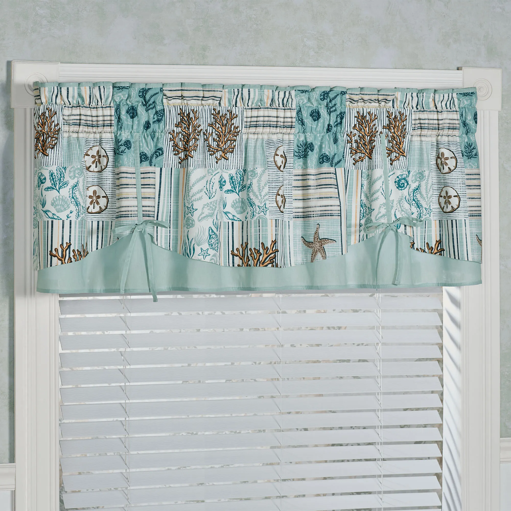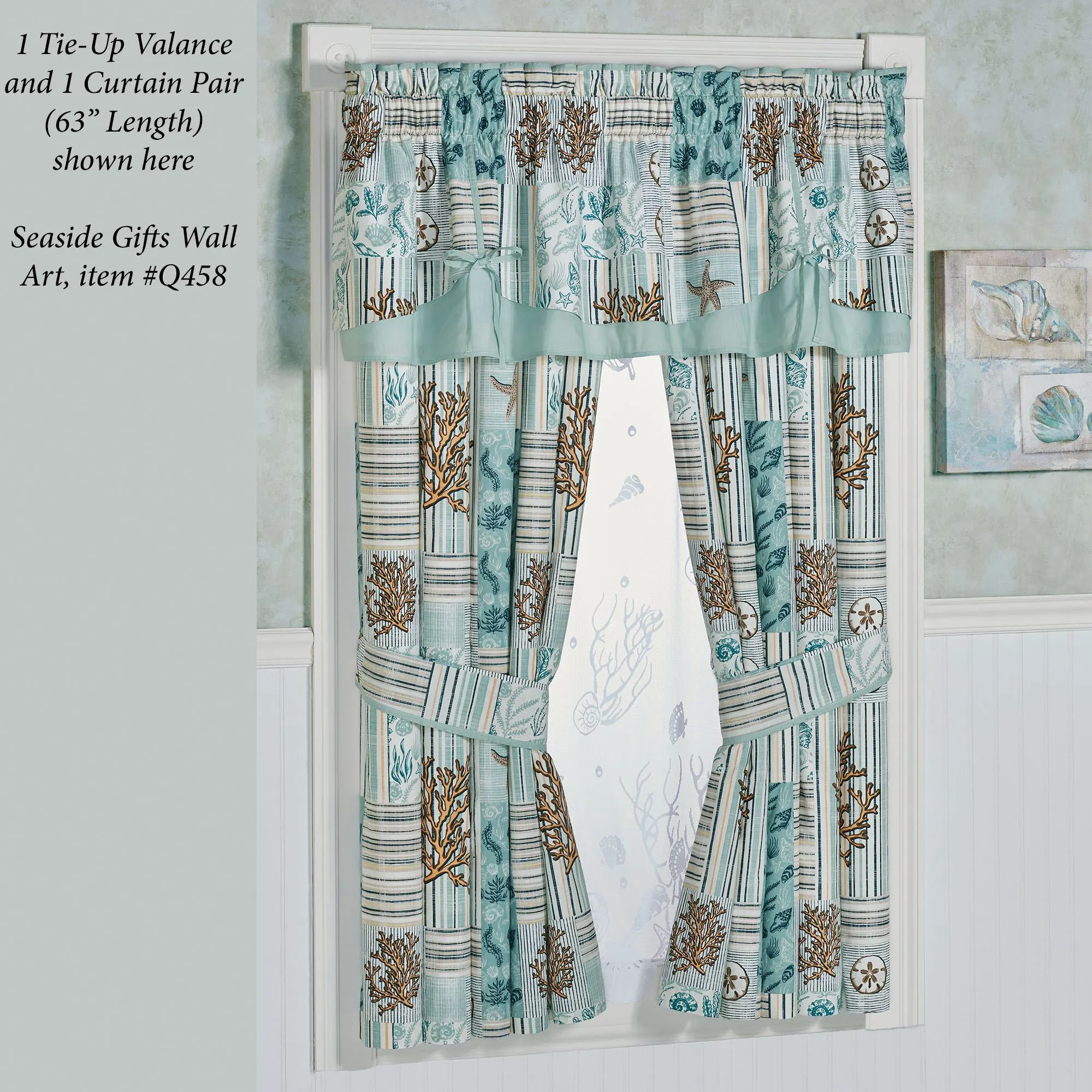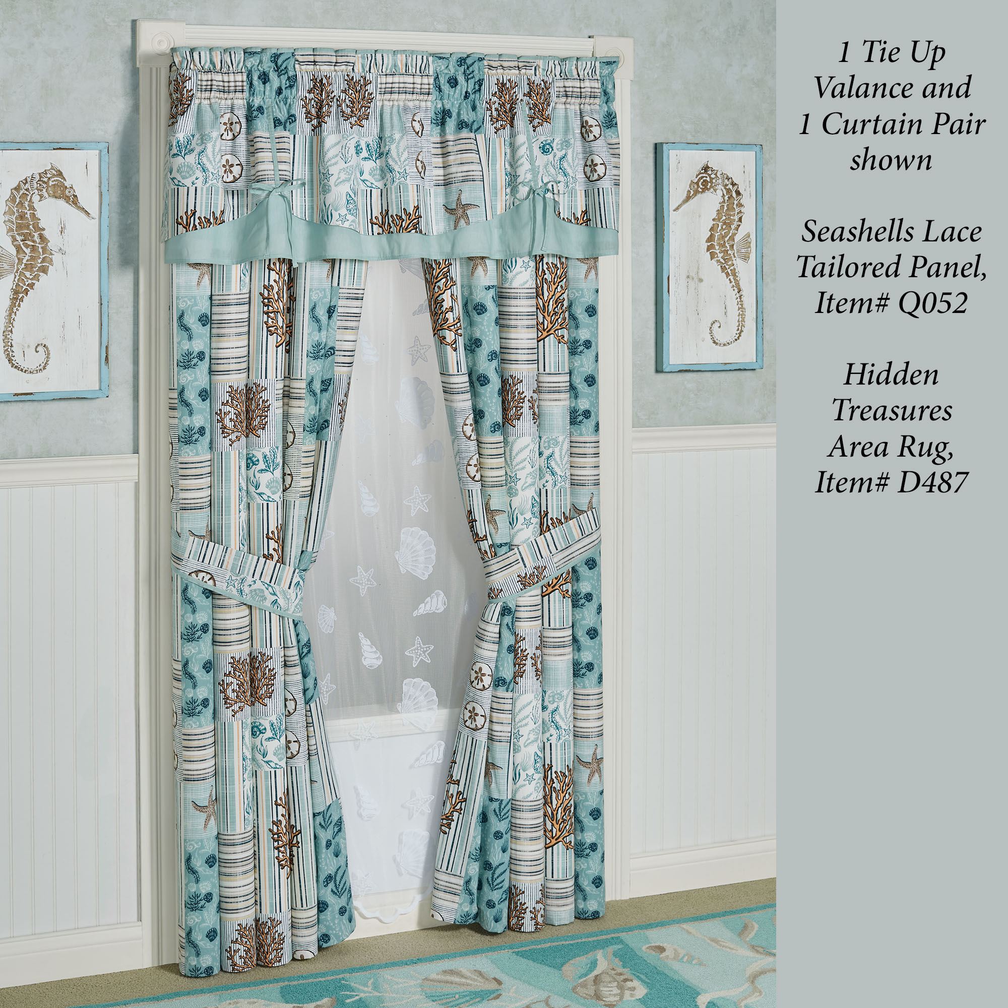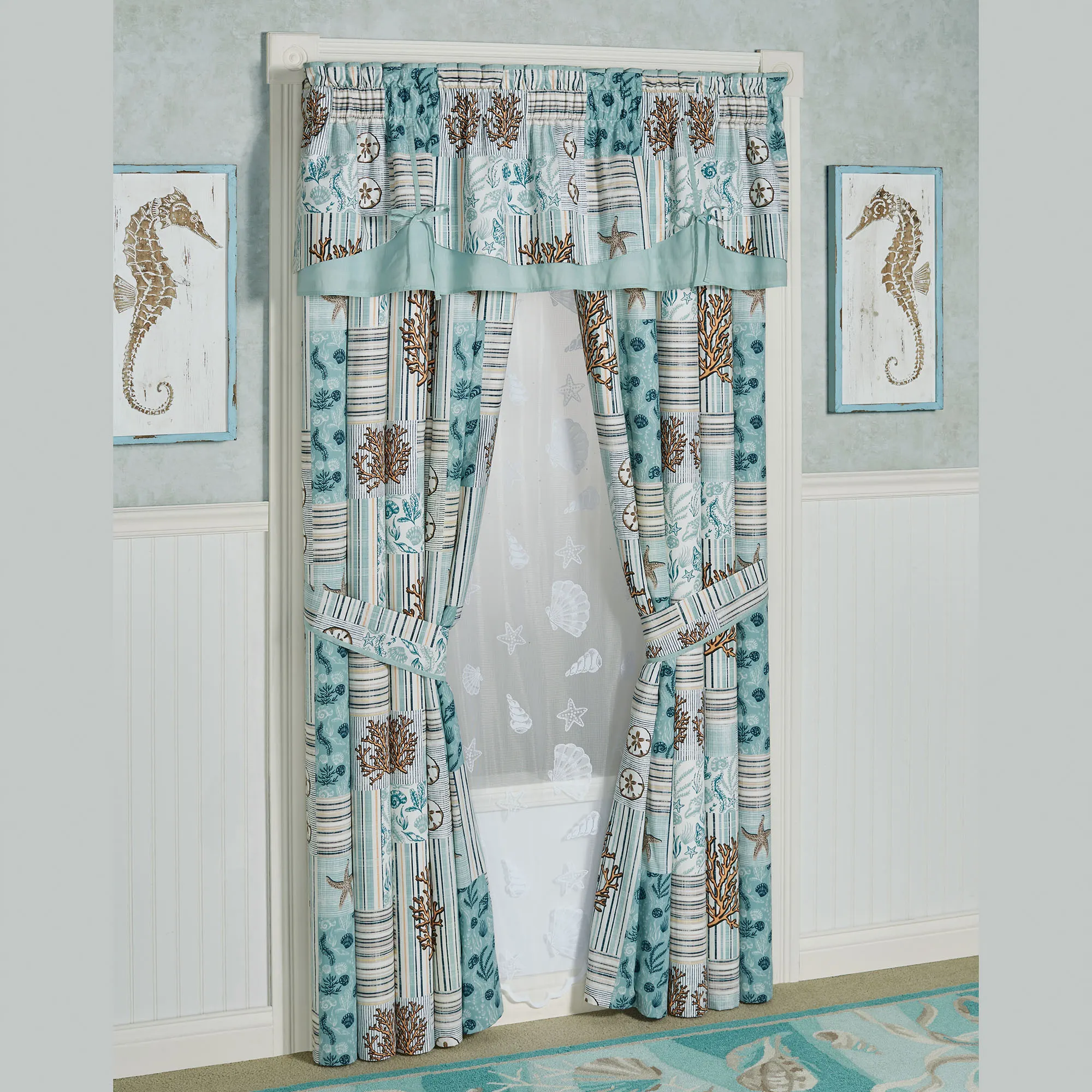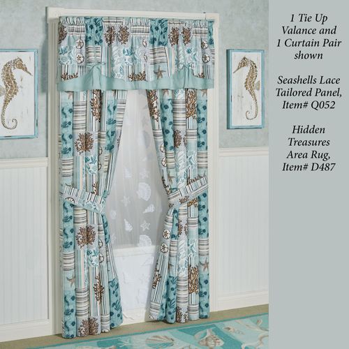 Create your own Shell Harbor! This lined window treatment features coastal motifs in a delightful collage style. Designs include coral, seashells, starfish, coastal motifs, and stripes printed in ivory, soft aqua, dark blue, yellow, pale taupe, natural, brown, and pale orange. Pre-washed coastal window treatment has 3" rod pockets. Specify Tie Valance or Curtain Pair. The cotton/polyester blend Tie Valance features a collage top layer with ties and a soft aqua bottom layer. The cotton Curtain Pair has tailored edges. Tiebacks are included. Machine washable. Imported. The curtain pair width is the total width of two panels together.