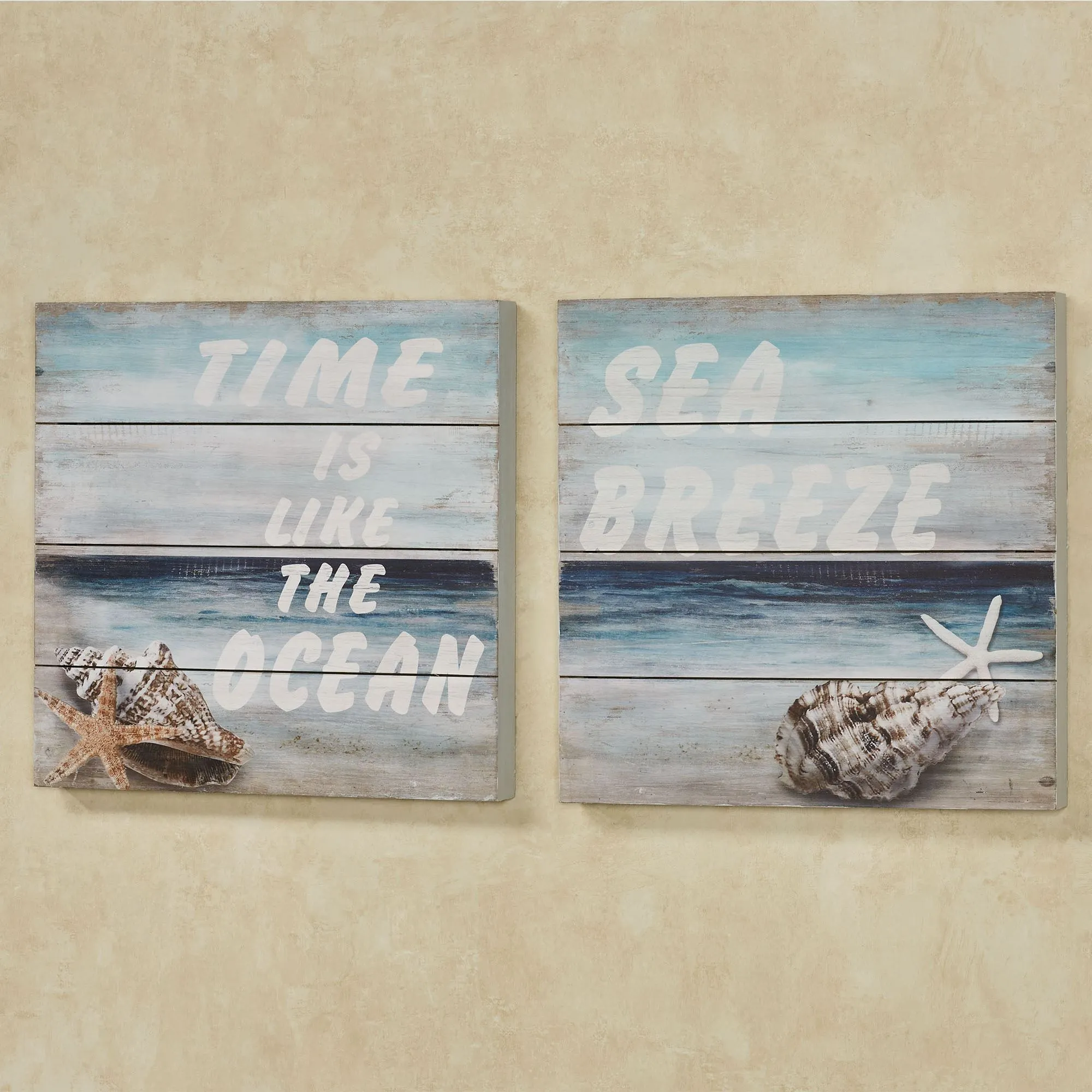 Discover that "Time Is Like the Ocean," enjoy a refreshing "Sea Breeze," and search for Shells on the Shore. This coastal wooden wall plaque set features the ocean, seashells, and starfish on a slatted wood background. Colors include shades of blue, white, and brown. Each coastal wall art plaque measures 16"sq.x2"D.