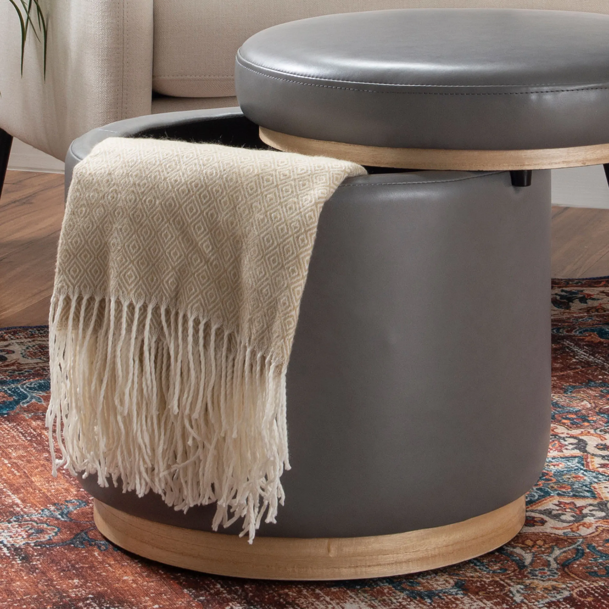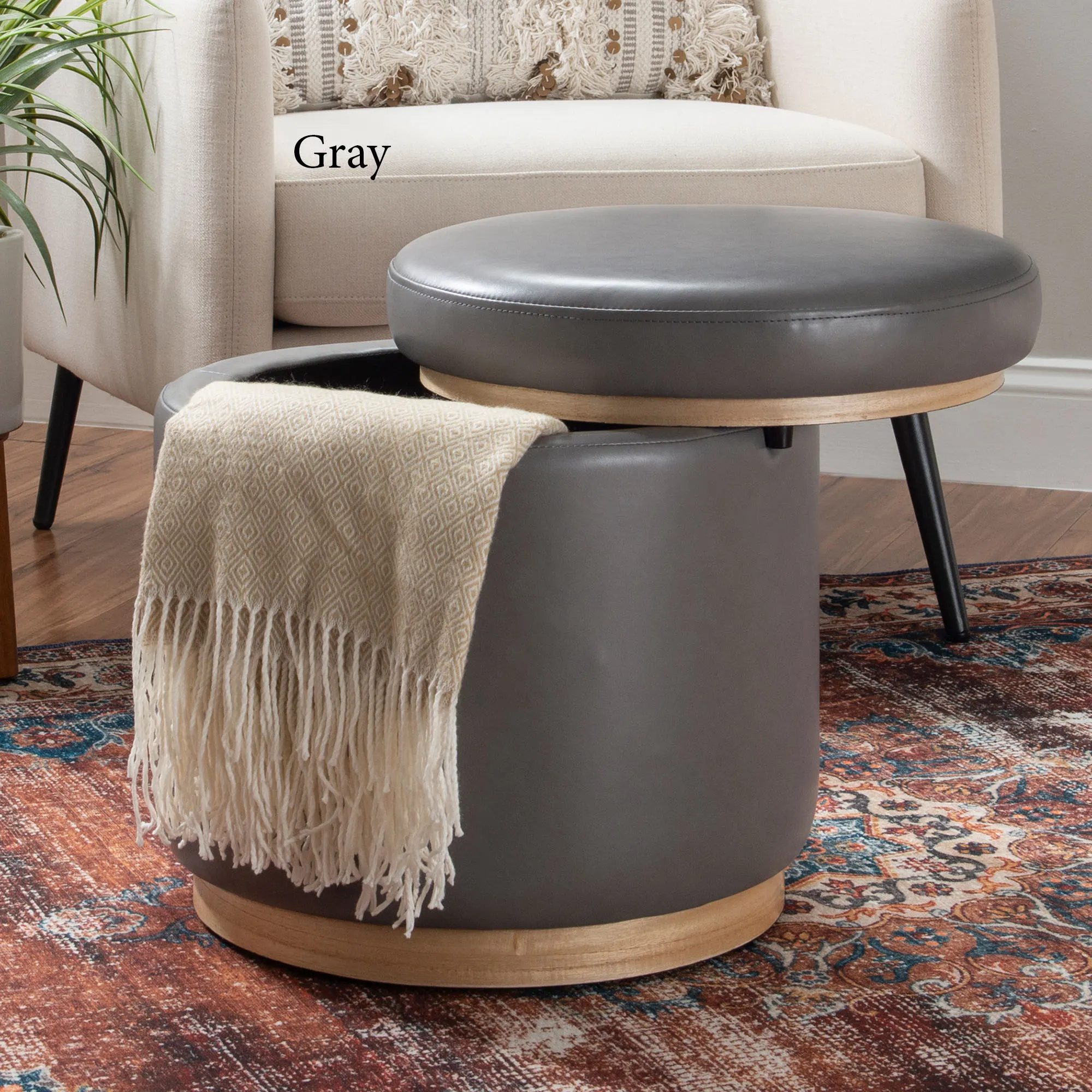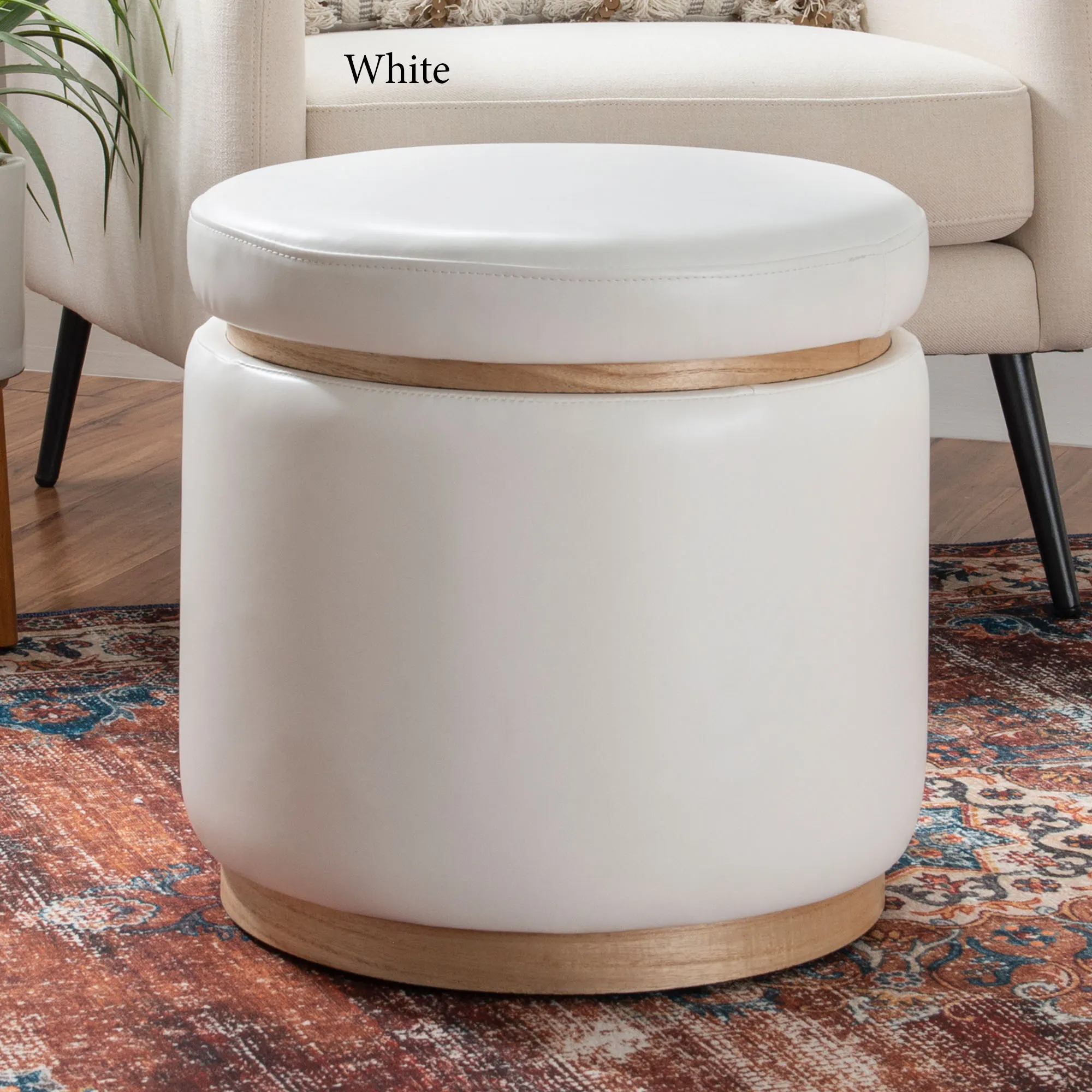 Gracefully complete a space with the Sheri Storage Ottoman. Accented by natural-hued pinewood trim, the ottoman features a solid color faux leather design with a removable lid that reveals 13.5"dia.x11.5"H of interior storage. The polyurethane foam cushion on the lid also provides comfortable extra seating. Weight capacity is up to 225 lbs. Overall, the storage ottoman measures 18"dia.x18"H and weighs approx. 18 lbs. Spot clean. Imported.