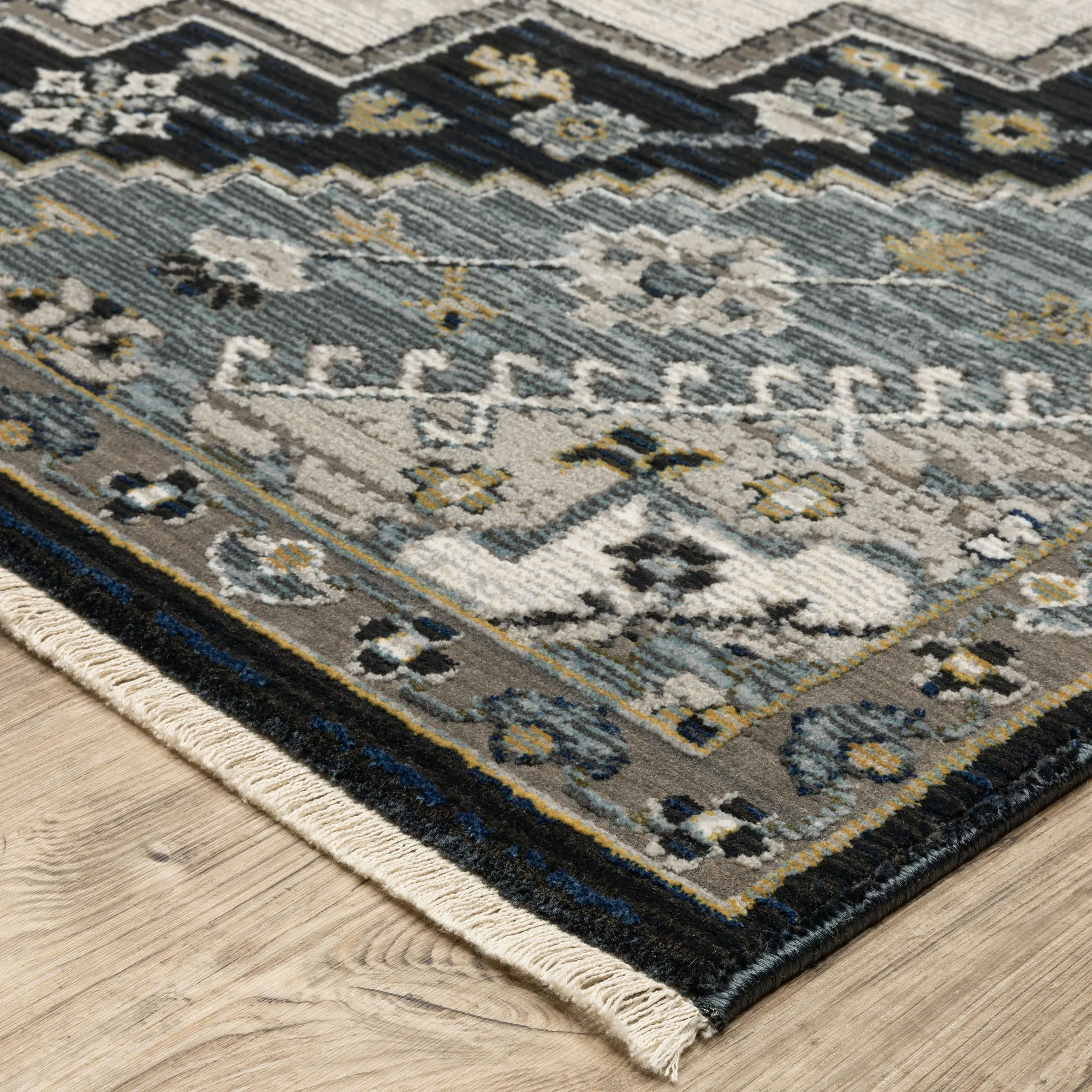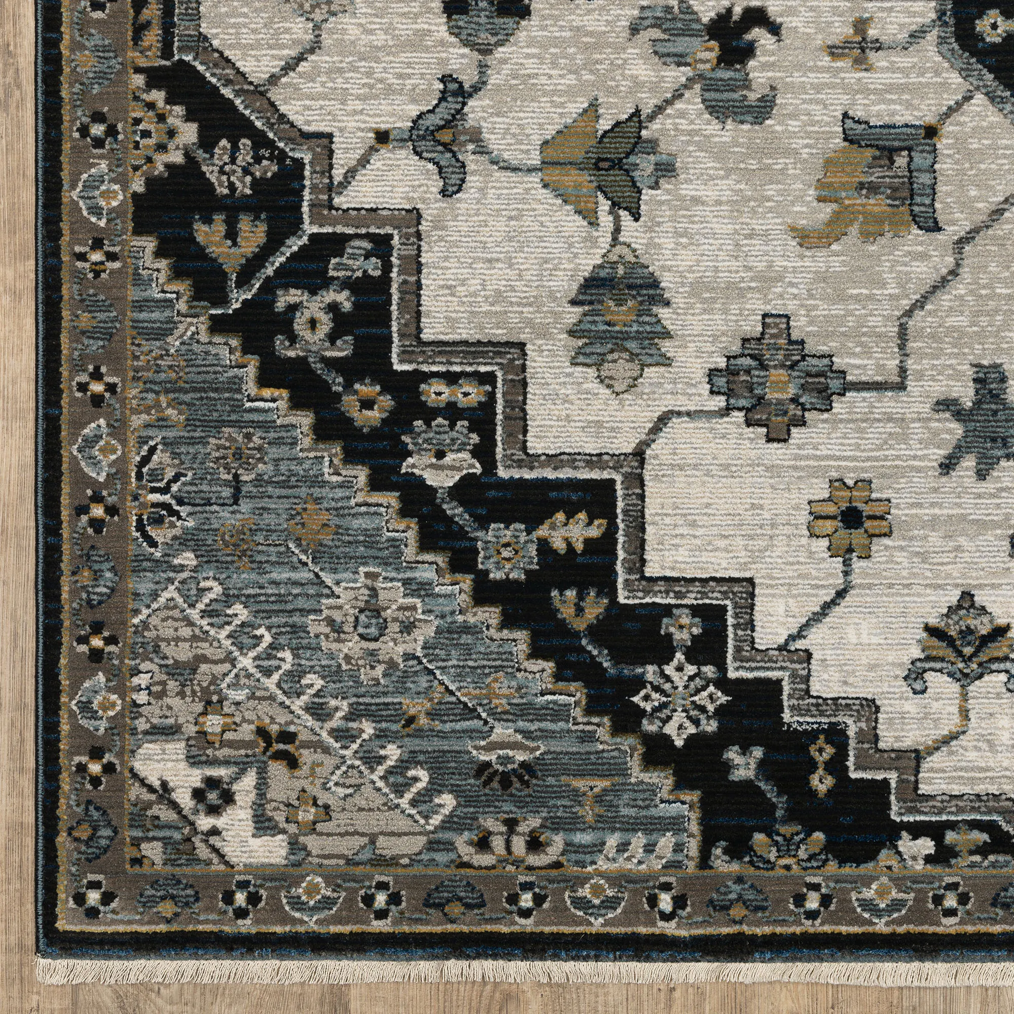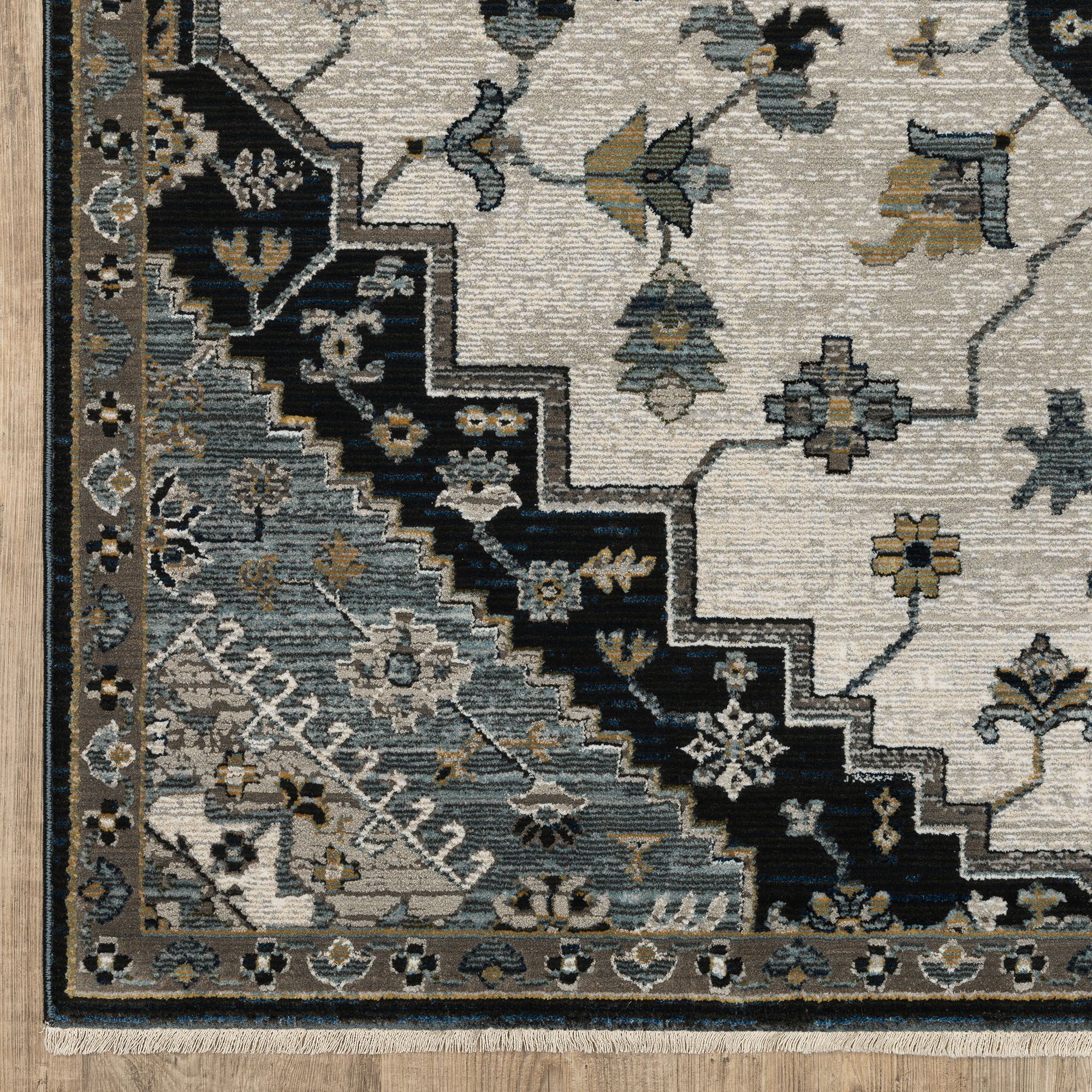 Classic beauty blossoms within the Sheridan Blue Rug. Power-loomed from polyester, the .31" thick rug features a floral-inspired design resplendent with unique blossoms, medallion framing, and Persian style. The blue coloration has a linen background with hues of ivory, off-white, cream, mustard, blue, eucalyptus, and dark gray. Ivory .5"L fringed ends add bohemian charm. Backing is woven polyester. We recommend professional cleaning by a rug cleaner. Imported.
