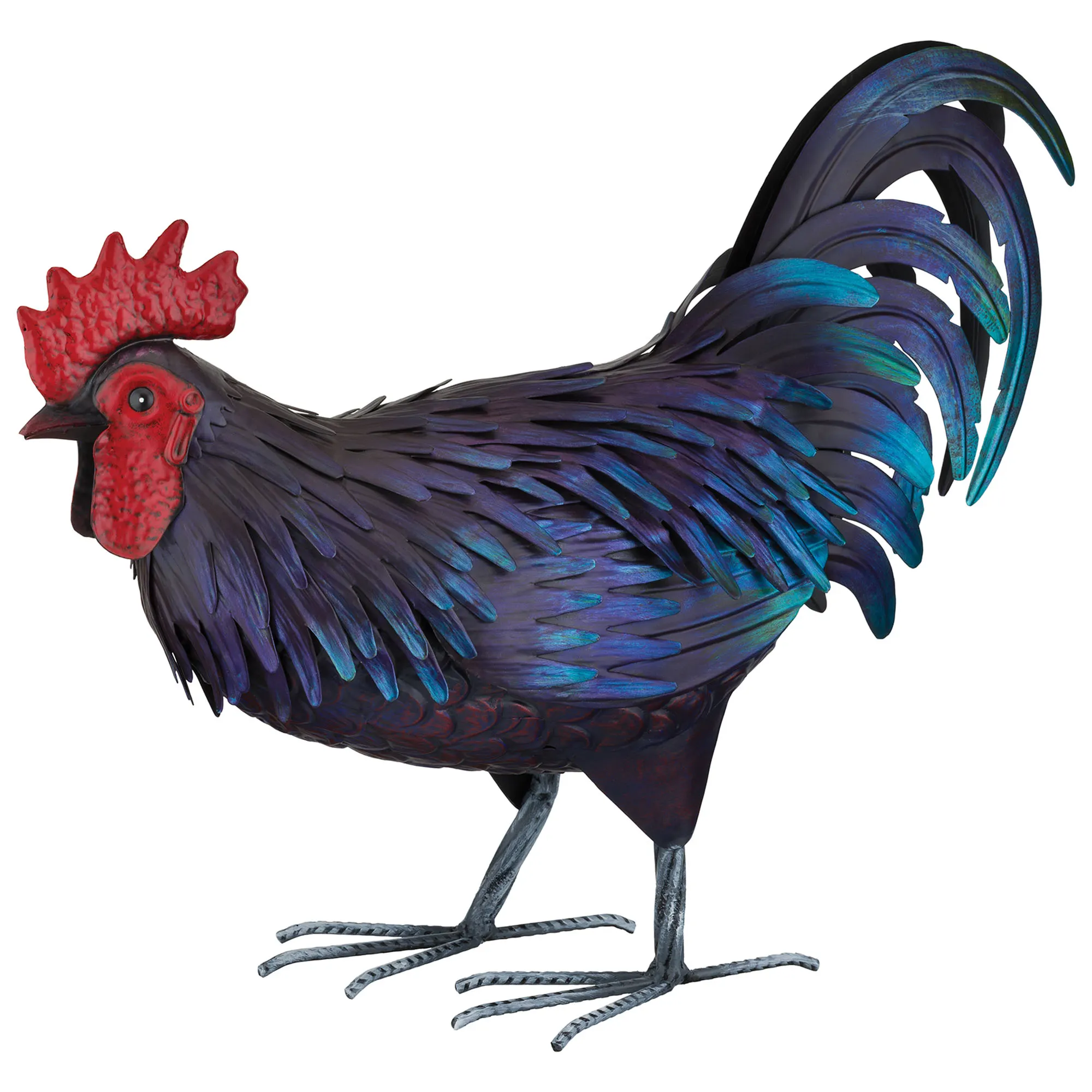 The Shetland Rooster is the beauty of the barnyard. The lifelike metal rooster sculpture shimmers in deep blue and teal tones and has a brilliantly painted red comb and wattle. This exotic rooster is weather- and fade-resistant and is built to withstand the elements. Indoor or outdoor year-round use. Measures 19.5"Wx7"Dx15"H.