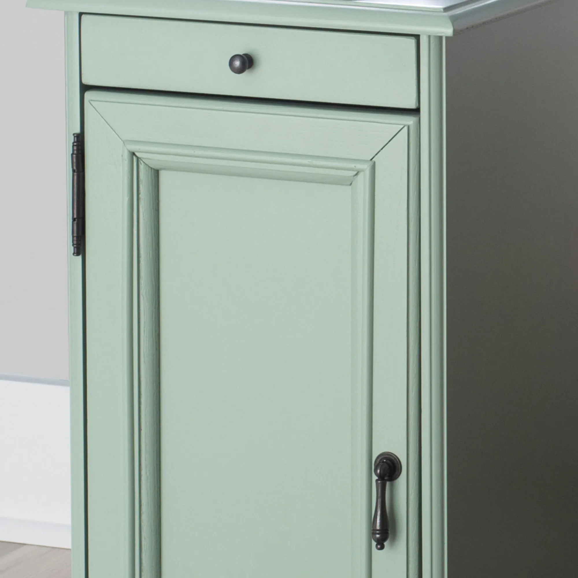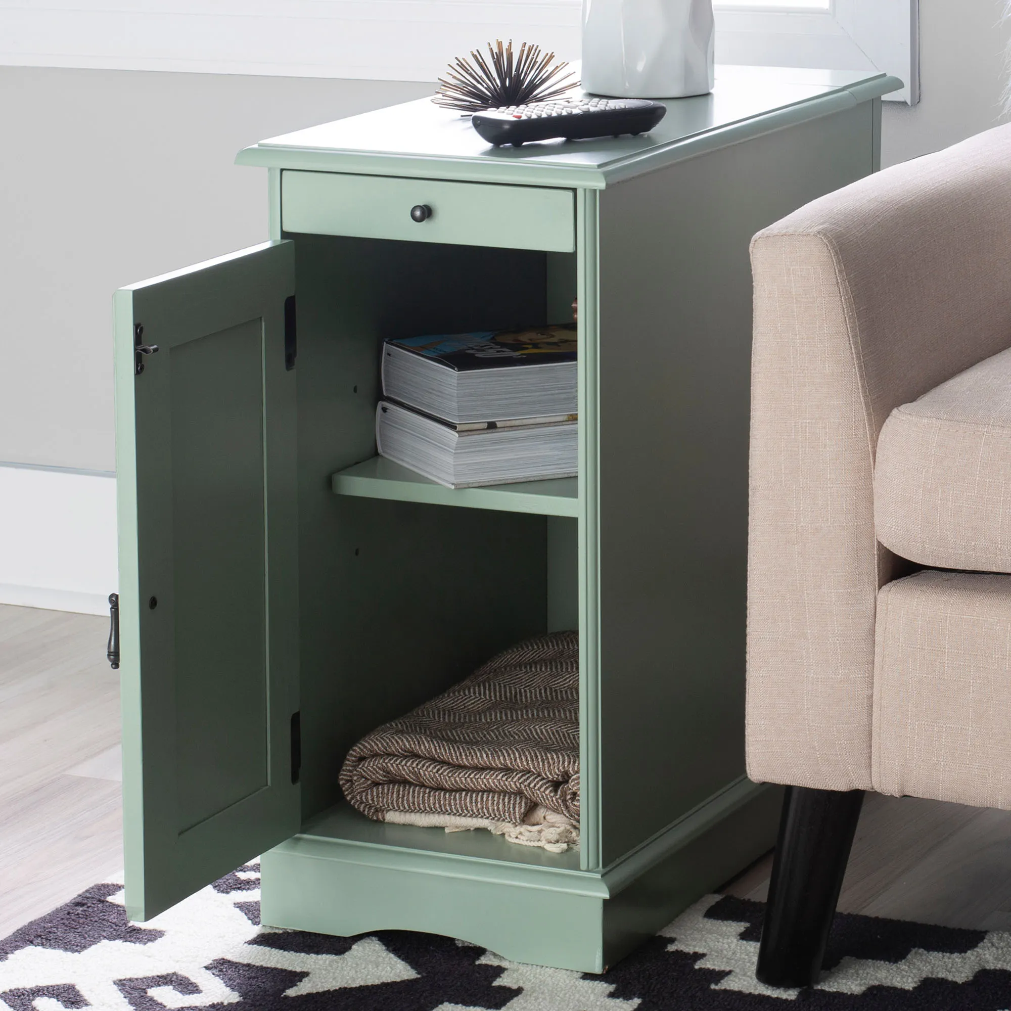 Make the most of any space with the Shiloh Aqua Chairside Table. Finished in aqua, this space-saving wooden table has a flip-open rear compartment with USB and two electrical outlets, plus a small area for a phone or remote. Sturdy table features a generous top and a pullout tray with built-in coasters that slides out from under the top. The closed storage behind the cabinet door is split with a single shelf, and there is a bonus storage space for books or magazines on the back of the table. The narrow design adds perfect function even in tight quarters. Metal hardware has an antique pewter finish. Overall, the side table measures 12"Wx24"Dx23.5"H; weighs 39 lbs.