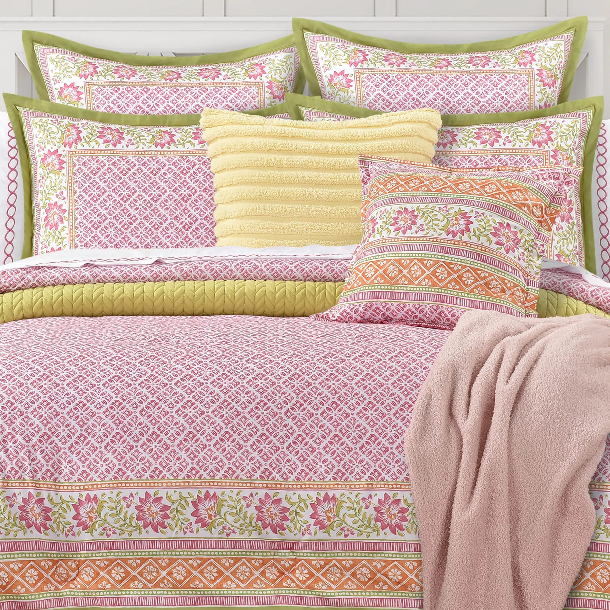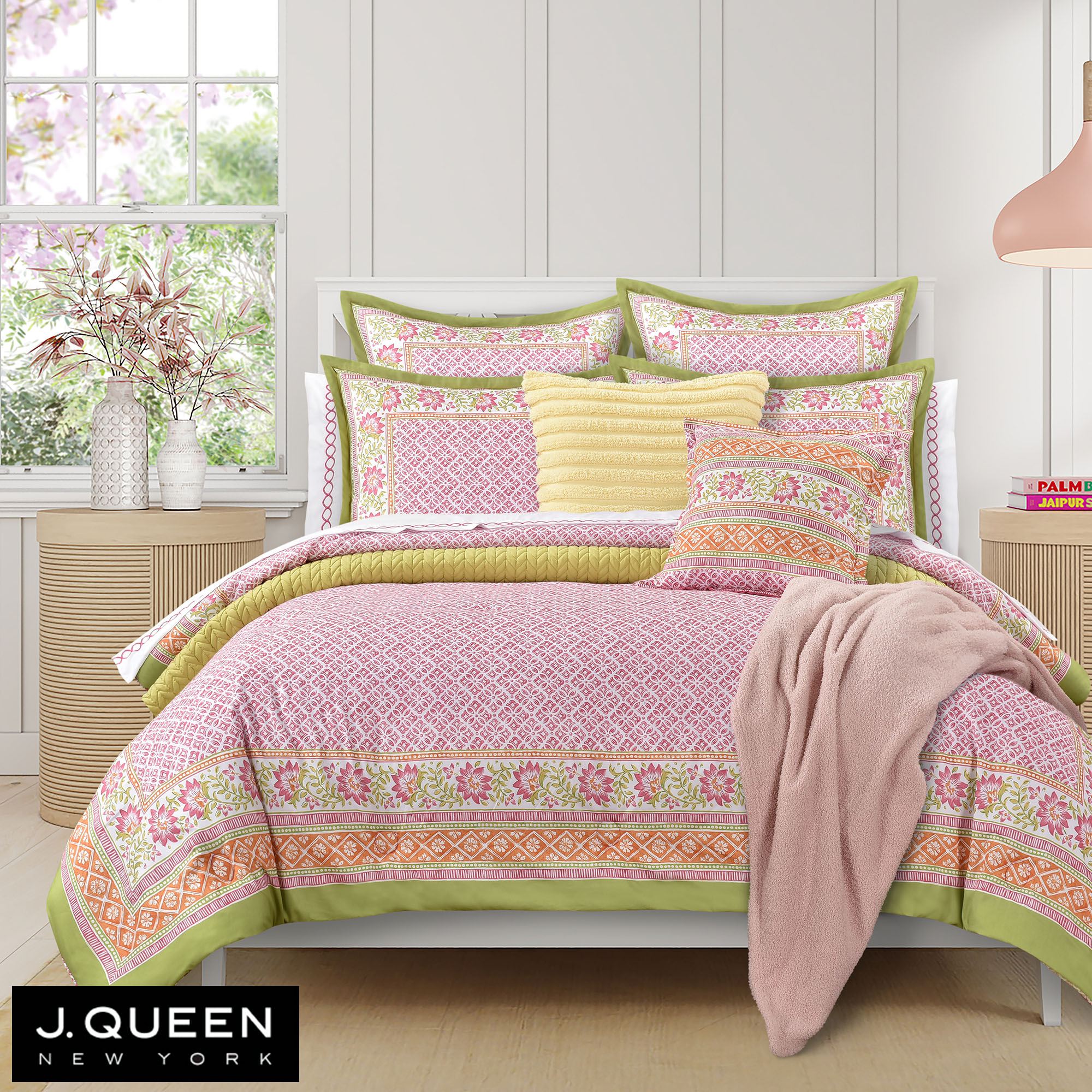 Decorate with the fresh, rejuvenating style of the Shiloh Bedding from J. Queen Bold. The Comforter Set includes a comforter and sham(s). In bright hues of pink, green, white, and orange, the polyester microfiber comforter features a medallion center framed in floral, stripe, dot, geometric, and solid borders. Oversized comforter has a pink microfiber polyester back. Bedding fill is polyester. Machine washable. Imported.