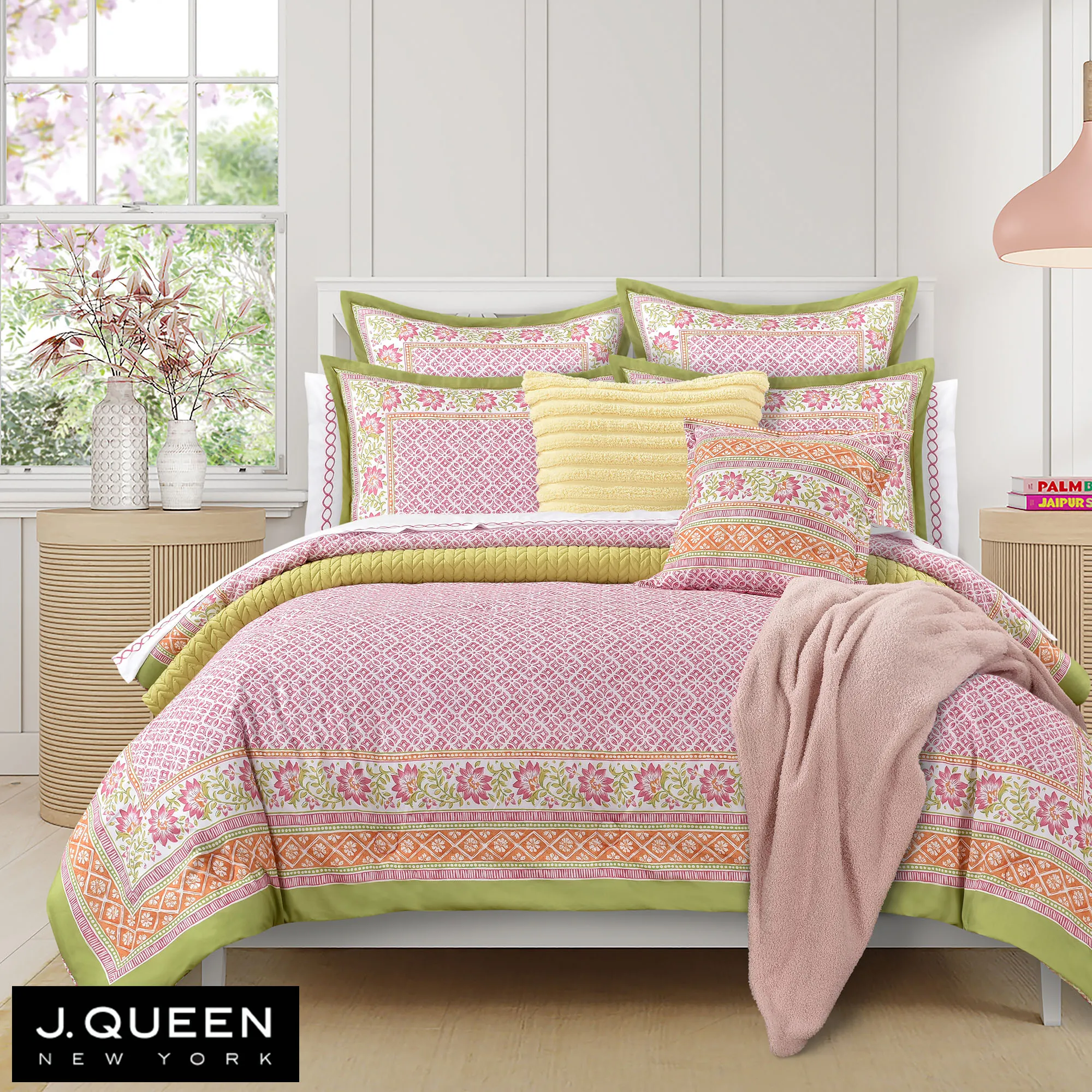 Infuse a vibrancy into your dreams with the Shiloh Bedding from J. Queen Bold. In bright hues of pink, green, white, and orange, the polyester microfiber ensemble features a medallion center framed in floral, stripe, dot, geometric, and solid borders in a fresh, rejuvenating style.