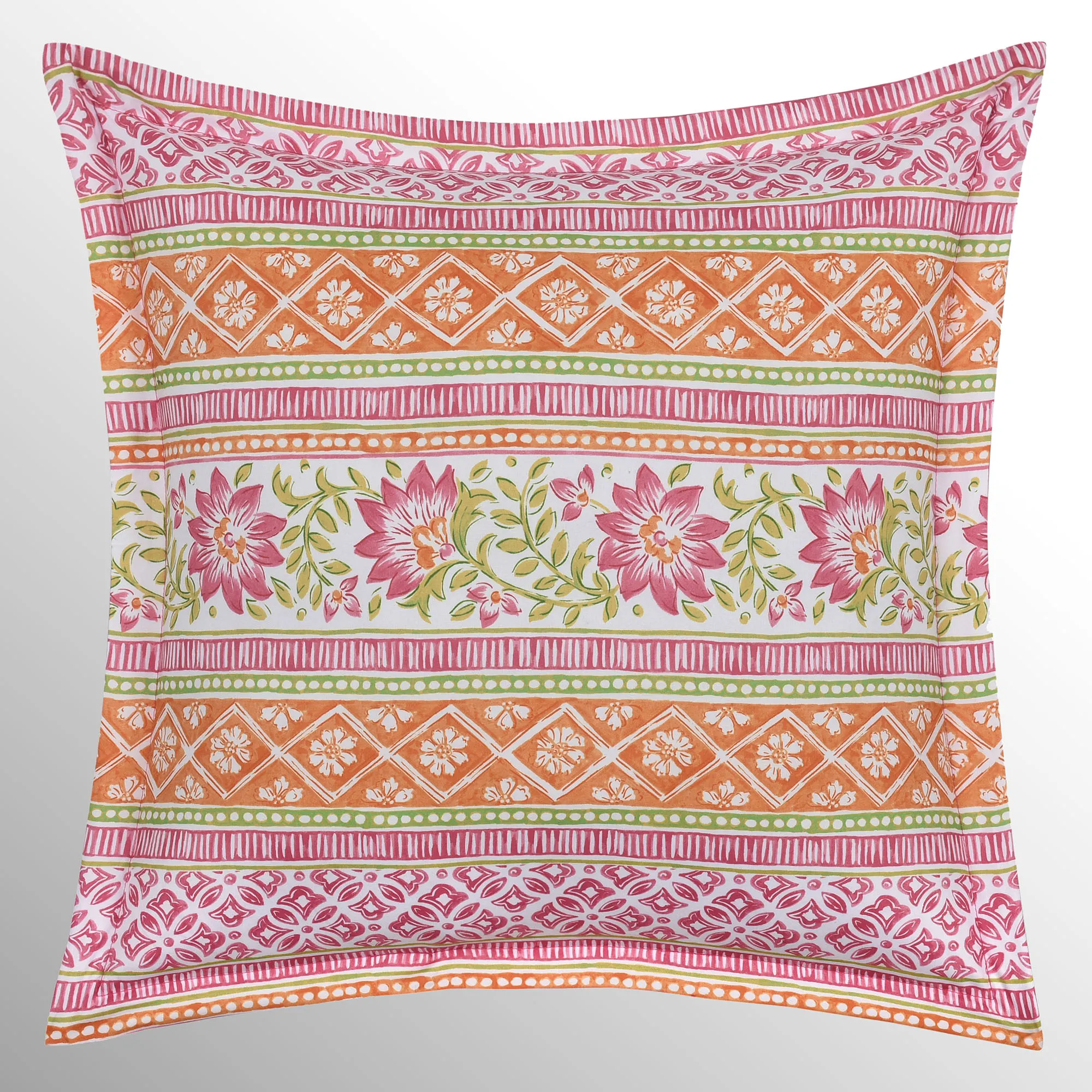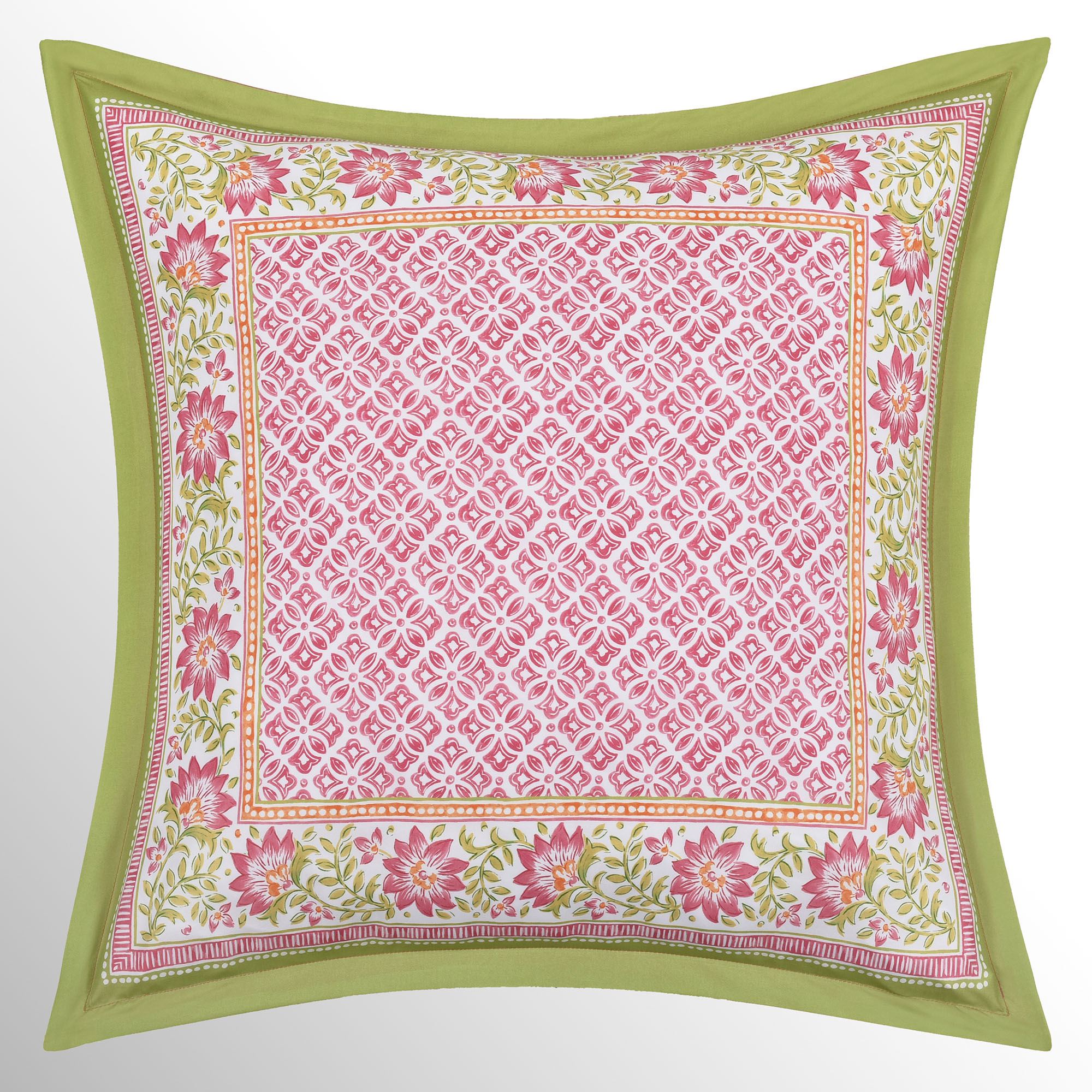 The flanged Shiloh Square Pillow has medallion, floral, stripe, dot, and geometric designs; backing is solid pink. Spot clean.