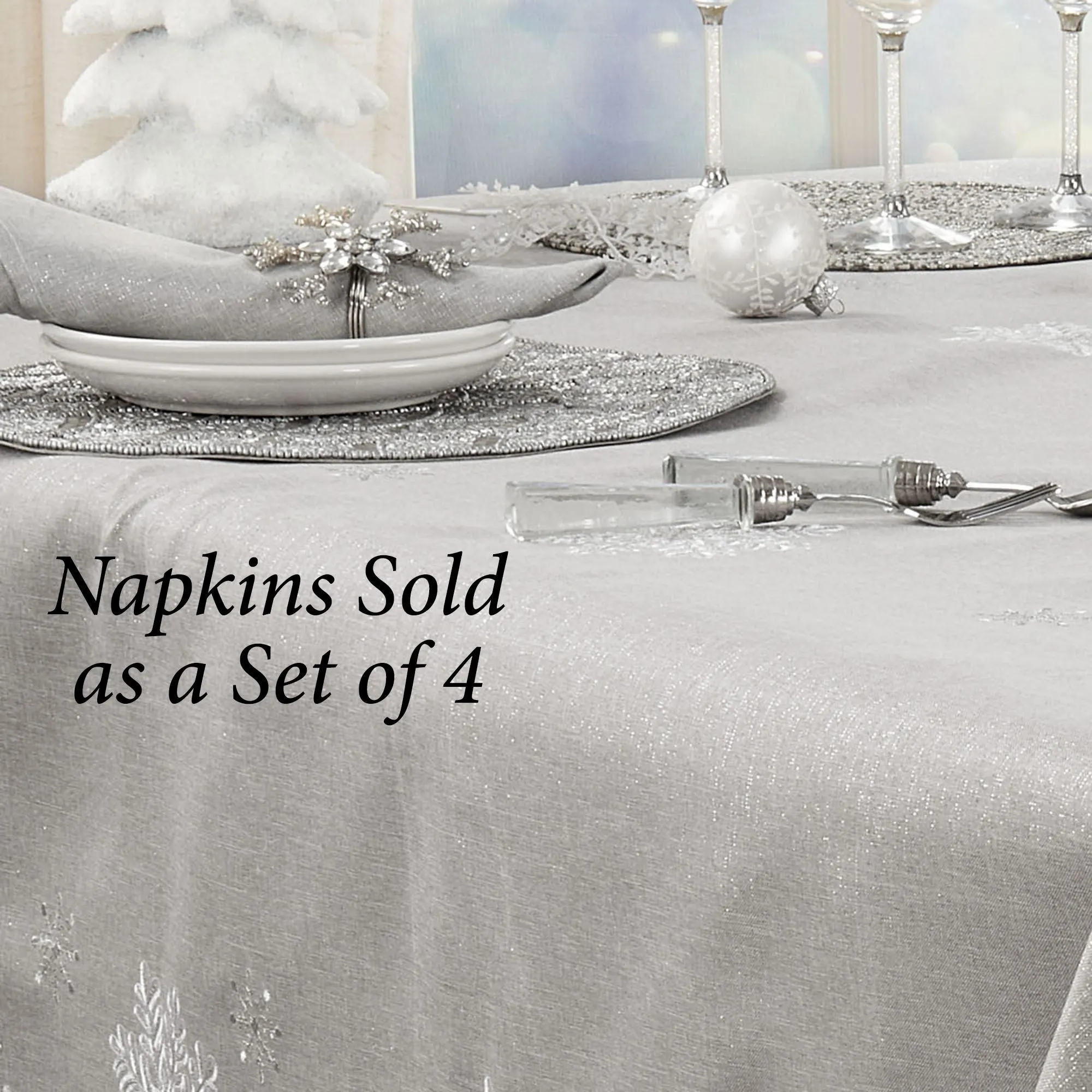 Set your winter tablescape with a scattering of Shimmer Snowflake motifs. Patterned in white and silver, lovely embroidered snowflakes decorate the silver polyester table linens that also glimmer with metallic silver threads. Specify Oblong Tablecloth, Table Runner, or Napkin Set of 4. Oblong Tablecloth is 70"W. Table Runner is 16"W. Napkins feature a golden snowflake and measure 20" sq. each; sold as a four-piece set. Measurements are approximate. Machine washable. Imported.